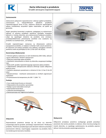Karta informacji o produkcie Grzybki aeracyjne (napowietrzające) Zastosowanie Jednoczesne połączenie napowietrzania i wibracji sypkich produktów, zastosowane w niskoprofilowych (płaskich) grzybkach napowietrzających firmy K-Tron, zapewnia skuteczne wspomaganie spływu (rozładunku) wszystkich typów materiałów, od pyłów po granulaty. Dzięki specjalnej konstrukcji urządzenia, polegającej na wytworzeniu wibracji za pomocą przepływu powietrza pomiędzy krawędzią dyfuzora a ścianką zbiornika, przy jednoczesnej fluidyzacji produktu, udaje się zapobiegać zbrylaniu się produktu oraz zmniejsza prawdopodobieństwo powstawania mostków oraz osadzania się produktu na ściankach (tzw. „rat holing”). Grzybki napowietrzające zazwyczaj są aktywowane podczas wysypywania produktu, co wpływa na bardzo małe zużycie powietrza. W zależności od rodzaju produktu oraz aplikacji, wymagane ciśnienie powietrza waha się pomiędzy 0,3 do 1,3 bar (od 5 do 20 psi). Konstrukcja (Wykonanie) • Element główny wykonany ze stali nierdzewnej (AISI 316L), dyfuzor z gumy silikonowej z atestem spożywczym • Wibracja wspomaga spływ produktu • Możliwość zastosowania w silosie czy zbiorniku zasypowym każdego typu • Niski profil grzybka napowietrzającego poprawia spływ produktu • Odpowiednie zabezpieczenie dyfuzora eliminuje ryzyko odłączenia podczas pracy • Zasilanie sprężonym powietrzem o ciśnieniu 0.3 do 1.3 bar (5 do 20 psig ) • Bezpieczeństwo - możliwość zastosowania w strefach zagrożonych wybuchem • Przystosowane do temperatury do 205 ° C [401 ° F] Funkcje • Czas modernizacji liczony w minutach • Odpowiednie dla proszków i granulatów • Nadaje się do materiałów ściernych • Wytrzymała konstrukcja • Całkowita bezobsługowość • Samoczyszcząca się i higieniczna budowa Załączenie Wyłączenie Doprowadzone powietrze dostaje się do silosa czy zbiornika zasypowego poprzez grzybek, powodując napowietrzenie i fluidyzację produktu. Powietrze przepływające pod obrzeżem dyfuzora powoduje powstawanie wibracji, wspomagając zsypywanie się produktu który ma tendencję do tworzenia mostków. Odłączenie przepływu powietrza zasilającego grzybek powoduje powstanie siły nacisku produktu na dyfuzor, który mocniej przylega do ścianki zbiornika, co zapobiega wydostawaniu się produktu poprzez dyfuzor lub do przewodu sprężonego powietrza. Instrukcja instalacji grzybka napowietrzającego Wywiercić otwór w ściance o średnicy 46 mm, usunąć ostre krawędzie. Założyć element centrujący „T” z gwintowanym łącznikiem na dyfuzor z wszystkimi podkładkami jak pokazano na rysunku. Wcisnąć gumową część dyfuzora przez otwór uprzednio wywiercony w zbiorniku. Przełożyć skompletowany element centralny przez ściankę zbiornika upewniając się że montujemy go prostopadle do ścianki (patrz krok 4) Ustalić centralne ułożenie elementu „T” poprzez jego wycofanie przy utrzymywaniu prostopadłości położenia względem ścianki. Przesunąć elementy wraz z podkładką. Gdy zewnętrzna podkładka uszczelniająca znajdzie się w pozycji centralnej, należy dokręcić nakrętkę mocującą. Dokręcić nakrętkę mocującą i wyjąć pręt „T”, podłączyć powietrze – grzybek aeracyjny jest gotowy do użycia. UWAGA: Element montażowy „T” jest tak zaprojektowany, że nie może wpaść do środka silosu. PRODUCENT: K-Tron DYSTRYBUTOR: www.ktron.com TEKPRO Sp. z o.o. www.tekpro.pl Tłumaczenie na podstawie I-500801-en Rev. 2010-12 (AW&RM)