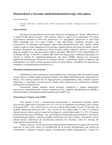 Pemetreksed w leczeniu niedrobnokomórkowego raka płuca. Tomasz Kucharczyk1 1. Pracownia Immunologii i Genetyki; Katedra i Klinika Pneumonologii, Onkologii i Alergologii; Uniwersytet Medyczny w Lublinie Wprowadzenie Rak płuca jest najczęstszym nowotworem złośliwym występującym w Polsce. Odpowiada on za ponad 20 000 zgonów rocznie, a 86% chorych umiera w ciągu 5 lat od rozpoznania. W samym województwie lubelskim w 2010 roku zanotowano 1171 przypadków zachorowań (w skali kraju 20832 przypadki) oraz 1123 zgony (22348 w skali całej Polski). Narażenie zawodowe oraz środowiskowe na substancje karcynogenne (pierwiastki promieniotwórcze, pyły, spaliny, metale ciężkie) zwiększa ryzyko zapadnięcia na tą chorobę, jednakże główną przyczyną jest palenie tytoniu. Resekcja chirurgiczna jest podstawową formą leczenia, jednak większość chorych w momencie diagnozy znajduje się w zaawansowanym stadium raka płuca (IIIB lub IV), które dyskwalifikuje ich od takiego zabiegu. U chorych w stadium IIIB, którzy nie mogą przejść radykalnej radioterapii oraz chorych w stadium IV niedrobnokomórkowego raka płuca (NDRP) zalecane jest stosowanie paliatywnej chemioterapii. Stosowane są schematy złożone z pochodnych platyny (cisplatyny lub karboplatyny) oraz leków trzeciej generacji takich jak gemcytabina, winorelbina lub pemetreksed. Schematy te wykazują podobną skuteczność (1). Mechanizm działania pemetreksedu Pemetreksed to lek cytotoksyczny, antymetabolit kwasu foliowego, który do komórki dostaje się przy pomocy zredukowanego transportera folanów oraz układu białek błonowych wiążących kwas foliowy. We wnętrzu komórki lek ten ulega procesowi poliglutaminacji, który zachodzi znacznie efektywniej w komórkach nowotworowych. Dzięki temu zachowana jest selektywność działania pemetreksedu na komórki guza. Pemetreksed hamuje działanie trzech enzymów związanych z syntezą nukleotydów purynowych i pirymidynowych: syntazy tymidylowej (TS), reduktazy dihydrofolanowej (DHFR) i formylotransferazy rybonukleotydu glicynamidowego (GARFT) (2). Pemetreksed w I linii leczenia NDRP Dwa badania II fazy z zastosowaniem pemetreksedu w monoterapii wykazały odsetek pozytywnych odpowiedzi na poziomie 16% (3) i 23% (4). W badaniach tych mediana czasu wolnego od progresji (PFS – ang. progression-free survival) wyniosła odpowiednio 4,4 oraz 3,8 miesiąca, zaś mediana całkowitego przeżycia (OS – ang. overall survival) odpowiednio 7,2 oraz 9,2 miesiąca. Odsetek chorych, którzy przeżyli ponad rok od diagnozy wyniósł odpowiednio 32 i 25%. W badaniu przeprowadzonym przez Gridellego i wsp., porównującym monoterapię pemetreksedem ze schematem pemetreksed/gemcytabina, wykazano podobną skuteczność obu form leczenia i nieznacznie wyższy odsetek przeżyć całkowitych dla dwulekowego schematu (5,4 miesiąca), wobec 4,7 miesiąca dla terapii jedynie pemetreksedem (5). Należy zaznaczyć, że trzy przytoczone badania przeprowadzone były na grupie osób starszych (powyżej 70 roku życia), którzy nie kwalifikowali się do leczenia chirurgicznego, jak również do chemioterapii z udziałem związków platyny. Występowania działań niepożądanych, u ponad 5% chorych, głównie powikłań hematologicznych takich jak neutropenia, trombocytopenia oraz biegunek, wymiotów i nudności, można uniknąć stosując premedykację z kwasu foliowego i witaminy B12. Obecnie jest to standard postępowania w przygotowaniu chorego do podania chemioterapii zawierającej pemetreksed. Dodatkowo w celu uniknięcia wysypki i innych powikłań związanych z nadwrażliwością na podawaną chemioterapię, chorym podaje się deksametazon. Przeprowadzono również dwa badania II fazy dotyczące oceny skuteczności i bezpieczeństwa dwulekowego schematu pemetreksedu i cisplatyny. Odsetek całkowitych odpowiedzi wyniósł odpowiednio 39% (6) i 45% (7), a mediana ogólnego przeżycia odpowiednio 10,9 oraz 8,9 miesiąca. Badania te potwierdziły skuteczność schematu dwulekowego oraz relatywnie niską toksyczność tego typu leczenia u chorych z zaawansowanym NDRP. W 2008 roku opublikowano wyniki badania, w którym porównano dwa schematy leczenia NDRP: pemetreksed/cisplatyna oraz gemcytabina/cisplatyna. Było to badanie obejmujące grupę 1725 chorych, które pokazało podobną skuteczność obu schematów: mediana OS wyniosła w obu przypadkach 10,3 miesiąca, mediana PFS odpowiednio 4,8 oraz 5,1 miesiąca, a odsetek pozytywnych odpowiedzi (RR – ang. response rate) odpowiednio 30,6 i 28,2% (8). Badanie to ujawniło różnice w odpowiedzi na leczenie w zależności od typu histologicznego nowotworu. Dla schematu pemetreksed/cisplatyna uzyskano znacząco lepsze odpowiedzi w typie gruczołowym i wielkokomórkowym, natomiast schemat gemcytabina/cisplatyna był bardziej skuteczny w raku płaskonabłonkowym. Wyniki te potwierdziły badania zespołu Ceppi i wsp. (9) oraz analiza badań klinicznych III fazy (10). Wydaje się, że poziom ekspresji syntazy tymidylowej (TS), która jest jednym z celów pemetreksedu, warunkuje efektywność leczenia. Wyższa ekspresja TS występuje w komórkach raka płaskonabłonkowego, w wyniku czego leczenie pemetreksedem w tym typie histologicznym nie daje pożądanych efektów. Użyteczność oceny ekspresji TS jako czynnika prognostycznego w kwalifikacji do terapii pemetreksedem jest wciąż w fazie badań i nie jest jak dotąd uznana i powszechnie stosowana. Korzystnymi, klinicznymi czynnikami rokowniczymi w przypadku terapii cisplatyną i pemetreksedem, tak jak i innymi schematami stosowanymi w leczeniu I linii NDRP, są dobry stan sprawności (PS=0/1), brak ubytku wagi ciała przed rozpoczęciem leczenia i brak niedokrwistości. Szereg badań klinicznych określających optymalna dawkę terapeutyczną pemetreksedu wykazał, że podanie 500 mg/m2 leku wykazuje pożądaną skuteczność wraz z zachowaniem dopuszczalnych norm toksyczności dla chemioterapii. W