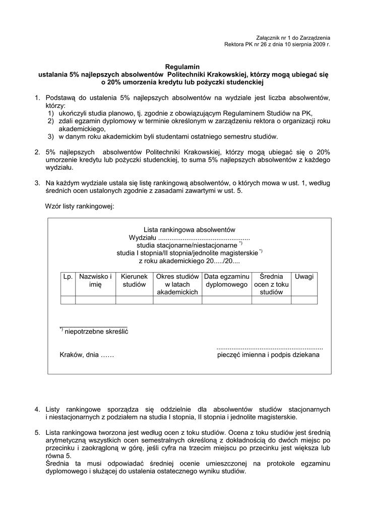 Załącznik nr 1 do Zarządzenia Rektora PK nr 26 z dnia 10 sierpnia 2009 r. Regulamin ustalania 5% najlepszych absolwentów Politechniki Krakowskiej, którzy mogą ubiegać się o 20% umorzenia kredytu lub poŜyczki studenckiej 1. Podstawą do ustalenia 5% najlepszych absolwentów na wydziale jest liczba absolwentów, którzy: 1) ukończyli studia planowo, tj. zgodnie z obowiązującym Regulaminem Studiów na PK, 2) zdali egzamin dyplomowy w terminie określonym w zarządzeniu rektora o organizacji roku akademickiego, 3) w danym roku akademickim byli studentami ostatniego semestru studiów. 2. 5% najlepszych absolwentów Politechniki Krakowskiej, którzy mogą ubiegać się o 20% umorzenie kredytu lub poŜyczki studenckiej, to suma 5% najlepszych absolwentów z kaŜdego wydziału. 3. Na kaŜdym wydziale ustala się listę rankingową absolwentów, o których mowa w ust. 1, według średnich ocen ustalonych zgodnie z zasadami zawartymi w ust. 5. Wzór listy rankingowej: Lista rankingowa absolwentów Wydziału ................................................. studia stacjonarne/niestacjonarne *) studia I stopnia/II stopnia/jednolite magisterskie *) z roku akademickiego 20...../20.... Lp. Nazwisko i imię Kierunek studiów Okres studiów Data egzaminu Średnia Uwagi w latach dyplomowego ocen z toku akademickich studiów __________________ *) niepotrzebne skreślić Kraków, dnia …… ......................................................... pieczęć imienna i podpis dziekana 4. Listy rankingowe sporządza się oddzielnie dla absolwentów studiów stacjonarnych i niestacjonarnych z podziałem na studia I stopnia, II stopnia i jednolite magisterskie. 5. Lista rankingowa tworzona jest według ocen z toku studiów. Ocena z toku studiów jest średnią arytmetyczną wszystkich ocen semestralnych określoną z dokładnością do dwóch miejsc po przecinku i zaokrągloną w górę, jeśli cyfra na trzecim miejscu po przecinku jest większa lub równa 5. Średnia ta musi odpowiadać średniej ocenie umieszczonej na protokole egzaminu dyplomowego i słuŜącej do ustalenia ostatecznego wyniku studiów. 6. Po sporządzeniu listy rankingowej według powyŜszych zasad naleŜy zaznaczyć na niej grupę absolwentów odpowiadającą 5% z ogólnej liczby osób na tej liście. 7. JeŜeli przy ustalaniu 5% najlepszych absolwentów na ostatniej pozycji z identyczną średnią ocen znajdzie się więcej niŜ jeden absolwent, to na liście umieszcza się nazwiska wszystkich absolwentów z tą samą średnią ocen. 8. Przy obliczaniu liczby absolwentów odpowiadającej 5% naleŜy dokonywać zaokrągleń zawsze w górę do pełnych jedności. 9. Absolwent umieszczony na liście rankingowej, który znalazł się w grupie 5% absolwentów i korzystał z kredytu lub poŜyczki studenckiej, moŜe ubiegać się o umorzenie 20% tego kredytu lub poŜyczki, jeŜeli uzyskał średnią ocen, o której mowa w ust. 5, nie niŜszą od 4,0. 10. Absolwent, który w czasie studiów korzystał z kredytu lub poŜyczki i znalazł się w grupie 5% najlepszych absolwentów PK, składa wniosek o umorzenie 20% kredytu lub poŜyczki w banku, który mu go udzielił. Do wniosku dołącza zaświadczenie (wg ustalonego wzoru) potwierdzające fakt, Ŝe znajduje się na liście 5% najlepszych absolwentów PK. 11. Listy rankingowe absolwentów poprzedniego roku akademickiego powinny być sporządzone na wydziałach do końca stycznia kaŜdego roku. Listy z zaznaczeniem 5% najlepszych absolwentów oraz wykaz absolwentów, którym potwierdzone zostanie uprawnienie do umorzenia 20% kredytu lub poŜyczki studenckiej powinny zostać przekazane do wiadomości Prorektora ds. Studenckich. 12. Dziekan Wydziału ogłasza listę rankingową najlepszych 5% absolwentów. Lista ta moŜe zawierać tylko imię i nazwisko absolwenta. 2