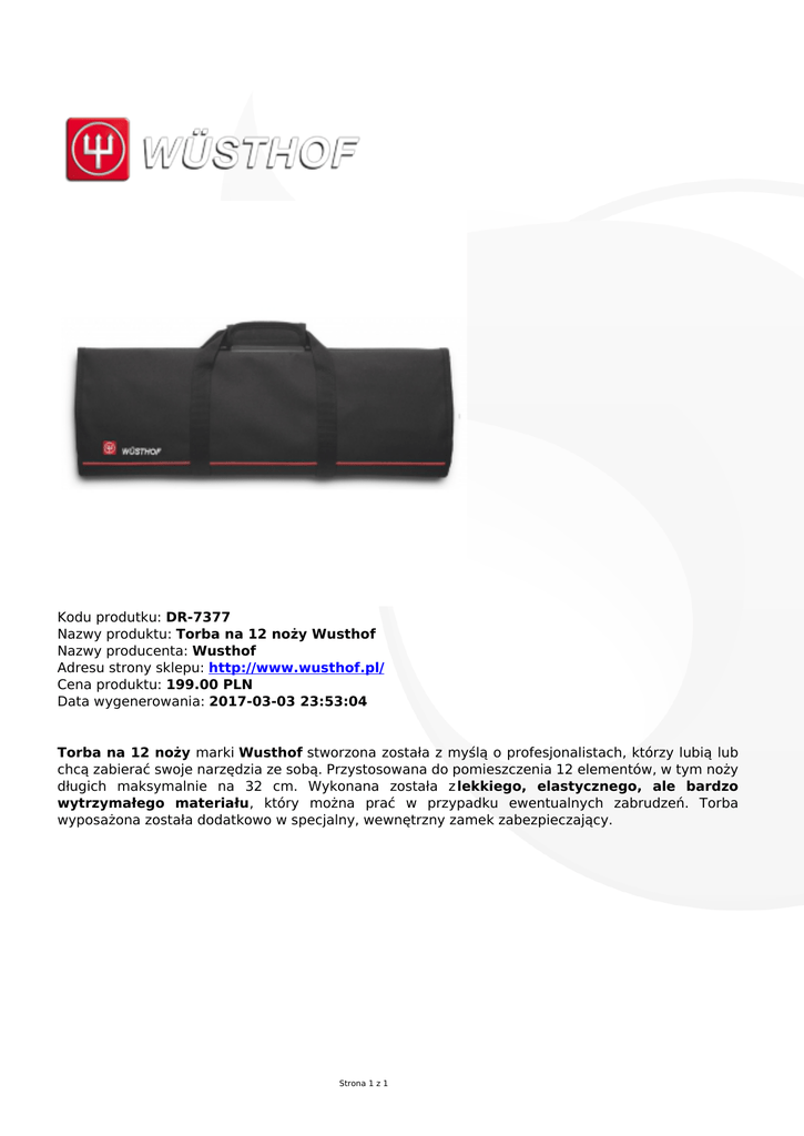 Kodu produtku: DR-7377 Nazwy produktu: Torba na 12 noży Wusthof Nazwy producenta: Wusthof Adresu strony sklepu: http://www.wusthof.pl/ Cena produktu: 199.00 PLN Data wygenerowania: 2017-03-03 23:53:04 Torba na 12 noży marki Wusthof stworzona została z myślą o profesjonalistach, którzy lubią lub chcą zabierać swoje narzędzia ze sobą. Przystosowana do pomieszczenia 12 elementów, w tym noży długich maksymalnie na 32 cm. Wykonana została z lekkiego, elastycznego, ale bardzo wytrzymałego materiału, który można prać w przypadku ewentualnych zabrudzeń. Torba wyposażona została dodatkowo w specjalny, wewnętrzny zamek zabezpieczający. Strona 1 z 1
