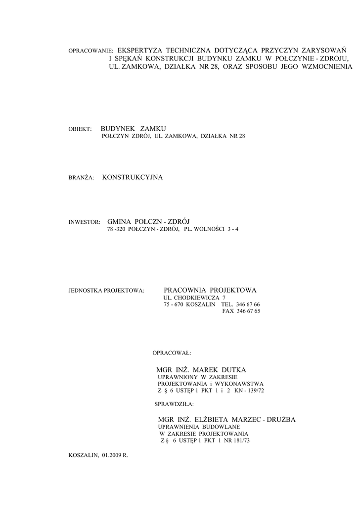 EKSPERTYZA TECHNICZNA DOTYCZĄCA PRZYCZYN ZARYSOWAŃ I SPĘKAŃ KONSTRUKCJI BUDYNKU ZAMKU W POŁCZYNIE - ZDROJU, UL. ZAMKOWA, DZIAŁKA NR 28, ORAZ SPOSOBU JEGO WZMOCNIENIA OPRACOWANIE: OBIEKT: BUDYNEK ZAMKU POŁCZYN ZDRÓJ, UL. ZAMKOWA, DZIAŁKA NR 28 BRANśA: INWESTOR: KONSTRUKCYJNA GMINA POŁCZN - ZDRÓJ 78 -320 POŁCZYN - ZDRÓJ, PL. WOLNOŚCI 3 - 4 JEDNOSTKA PROJEKTOWA: PRACOWNIA PROJEKTOWA UL. CHODKIEWICZA 7 75 - 670 KOSZALIN TEL. 346 67 66 FAX 346 67 65 OPRACOWAŁ: MGR INś. MAREK DUTKA UPRAWNIONY W ZAKRESIE PROJEKTOWANIA i WYKONAWSTWA Z § 6 USTĘP 1 PKT 1 i 2 KN - 139/72 SPRAWDZIŁA: MGR INś. ELśBIETA MARZEC - DRUśBA UPRAWNIENIA BUDOWLANE W ZAKRESIE PROJEKTOWANIA Z § 6 USTĘP 1 PKT 1 NR 181/73 KOSZALIN, 01.2009 R. 2 1.0 PODSTAWA OPRACOWANIA Ekspertyzę techniczną dotyczącą przyczyn zarysowań i spękań konstrukcji budynku Zamku w Połczynie - Zdroju przy ul. Zamkowej, oraz sposób jego wzmocnienia opracowano na zlecenie Gminy w Połczynie- Zdroju nr GG-2212/21/2007 z dnia 07.07.2008 r. Do pracowania wykorzystano: - dokumentację geotechniczną opracowaną przez , Przedsiębiorstwo Realizacji Inwestycji "Kret", 2007 r. - inwentaryzację budowlaną dla potrzeb projektowania opracowaną 2007 r - studium historyczne zamku opracowane przez Pracownię Konserwacji Zabytków w Szczecinie w 1961 r. - obserwację przedmiotowego obiektu - obowiązujące normy, warunki techniczne wykonania robót budowlanych oraz obowiązujące przepisy 2.0 ZAKRES I CEL OPRACOWANIA Celem opracowania jest ustalenie przyczyn zarysowań i spękań konstrukcji budynku Zamku oraz wpływu tych odkształceń na dalszą jego eksploatację. Opracowanie obejmuje równieŜ sposób wzmocnienia konstrukcji. W ramach opracowania dokonano obserwacji stanu technicznego budynku w czasie wykonywania pomiarów w listopadzie i grudniu 2007 r. oraz obecnie lipcu 2008r. 3.0 OPIS OGÓLNY BUDYNKU ZAMKU Budynek Zamku posiada dwie kondygnacje nadziemne i jest podpiwniczony. Według opracowanej Opinii Historycznej budynek w pierwotnej formie mógł powstać pod koniec XIII wieku. 3 Otaczająca rzeka, bagna torfowe oraz mury obronne wraz zamkiem broniły dostępu uzbrojonej konnicy do miasta. Fundamenty, ściany podziemia oraz stropy piwnic wykonane były z głazów polodowcowych i cegły ceramicznej, murowanych na zaprawie glinianej i wapiennej. W pierwszym etapie ściany kondygnacji nadziemnej oraz ich stropy wraz z dachem były prawdopodobnie wykonane jako drewniane. Budynek był kilkukrotnie palony. Obecna forma bryły budynku pochodzi z końca XVIII wieku. Droga prowadząca do Zamku zdolnego poziomu, została ukształtowana w zboczu wzniesienia. W okresie po II wojnie światowej budynek zaadaptowano na mieszkania. W latach siedemdziesiątych po przekwaterowaniu mieszkańców budynek przeszedł remont kapitalny i do dziś pełni funkcję Miejskiego Ośrodka Kultury. 4.0 OPIS ISTNIEJĄCEJ KONSTRUKCJI BUDYNKU ORAZ JEJ STAN TECHNICZNY 4.1 DACH Dach pokryty jest dachówką. Konstrukcja krokwiowo - płatwiowa, drewniana, wielospadowa. Przewody kominowe murowane, ceglane. Obróbki blacharskie z blachy miedzianej i ocynkowanej. Stan techniczny pokrycia, konstrukcji drewnianej, kominów i obróbek blacharskich jest średni. 4 4.2 ŚCIANY BUDYNKU Ściany konstrukcyjne kondygnacji nadziemnych budynku zostały wymurowane z cegły ceramicznej grubości 25 do 100 cm Ściany kondygnacji piwnicznej z kamienia narzutowego polodowcowego i z cegły ceramicznej. Na ścianach widoczne są zarysowania i spękania które w większości zlokalizowane są na kondygnacji I piętra i parteru. Ściany kondygnacji piwnicznej w części zasadniczej budynku nie wykazują zarysowań i spękań. W części oddzielonej bramą wjazdową w której zlokalizowana jest kotłownia widoczne są zarysowania i spękania ścian piwnic. W części budynku widoczne są takŜe odkształcenia ścian od pionu. W przewaŜającej części budynku odchyłki te mają małą wartość i ocenia się je na 2 do 5 cm i zlokalizowane są na kondygnacji I piętra. W jednym przypadku w części ściany nad drogą dojazdową odchyłka ściany od pionu jest znacząca i wynosi maksimum 12 cm Wychylenie tej ściany rozpoczyna się od stropu nad parterem i osiąga swoje maksimum pod dachem. Biorąc pod uwagę grubość tej ściany 100 cm w piwnicy i 80 cm na parterze i I piętrze oraz ograniczony zakres wychylenia na długości - stateczność tej ściany jest obecnie zachowana. Analizując strukturą zarysowań i spękań oraz warunki geologiczne ustalono 5 następujące przyczyny ich powstania: 1. na przestrzeni wieków budynek był odbudowany kilkukrotnie po spaleniach i zniszczeniach na róŜnych rodzajach fundamentów i na róŜnych głębokościach. 2. sama konstrukcja fundamentów z kamienia lub cegły na zaprawie glinianej lub wapiennej słabo zabezpiecza ściany przed nadmiernymi odkształceniami. 3. fundamenty nie mają wyliczonej szerokości i dlatego niejednorodny rozkład napręŜeń na grunt nawet przy dobrym podłoŜu gruntowym moŜe wywoływać odkształcenia w ścianach 4. róŜnorodne wielkości obciąŜeń stropów w poszczególnych częściach budynku 5. konstrukcja ścian bez wieńców stropowych i bez skotwienia belek stalowych 6. odkształcenia termiczne belek stalowych stropowych wywołane duŜymi zmianami temperatury 7. rozpór więźby dachowej o duŜej wysokości szczególnie w naroŜnikach budynku gdzie jest ona niesymetryczna Wielkość oddziaływania poszczególnych czynników jest róŜna i wywołuje odkształcenia które moŜna ocenić wizualnie. W zasadniczej bryle, pomijając kotłownię, ściany piwnic nie wykazują zarysowań i spękań które pojawiłyby się od osiadania w przypadku słabego podłoŜa gruntowego, osiadania skarpy lub przekroczonych napręŜeń na grunt. Z tego wynika Ŝe czynniki określone w pkt. 1 do 4 nie mają istotnego znaczenia na odkształcenia budynku. Odkształcenia ścian kondygnacji I piętra i w mniejszym stopniu ścian 