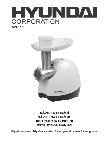 MG 124 NÁVOD K POUŽITÍ NÁVOD NA POUŽITIE INSTRUKCJA OBSŁUGI INSTRUCTION MANUAL Mlýnek na maso / Mlynček na mäso / Maszynka do mięsa / Meat grinder Vážený zákazníku, děkujeme Vám za zakoupení našeho produktu. Před uvedením tohoto přístroje do provozu si velmi pozorně přečtěte návod k obsluze a tento návod spolu se záručním listem, pokladním dokladem a podle možností i s obalem a vnitřním obsahem obalu dobře uschovejte. Všeobecné bezpečnostní pokyny • Používejte tento přístroj výlučně pro soukromou potřebu a pro stanovené účely. Tento přístroj není určen pro komerční použití. • Chraňte ho před horkem, přímým slunečním zářením, vlhkostí (v žádném případě jej neponořujte do kapalin) a stykem s ostrými hranami. Nepoužívejte přístroj v případě, že máte vlhké ruce. Jestliže dojde k navlhčení nebo namočení přístroje, okamžitě vytáhněte zástrčku ze zásuvky. Vyvarujte se styku s vodou. • Přístroj vypněte a vždy vytáhněte zástrčku ze zásuvky (tahejte jen za zástrčku, nikdy ne za kabel), jestliže nebudete přístroj používat, chcete-li namontovat příslušenství, přístroj vyčistit nebo v případě poruchy. • Přístroj nesmí zůstat v provozu bez dozoru. Jestliže musíte pracoviště opustit, vždy přístroj vypněte, resp. vytáhněte zástrčku ze zásuvky (vždy tahejte za zástrčku, nikdy ne za kabel). • Abyste ochránili děti před riziky spojenými s elektrickými přístroji, postarejte se o to, aby kabel nevisel dolů a děti na přístroj nedosáhly. • Pravidelně kontrolujte přístroj a přívodní kabel z hlediska poškození. Jestliže přístroj vykazuje nějakou závadu, neuvádějte jej do provozu. • V případě selhání či nesprávné činnosti přístroj vypněte a nepokoušejte se ho sami opravit. Obraťte se na autorizovaný servis a žádejte originální náhradní díly. Nedodržení výše uvedeného může ovlivnit bezpečnost spotřebiče. • Používejte jen originální příslušenství. • Respektujte, prosím, následující „Speciální bezpečnostní pokyny pro tento přístroj“. Speciální bezpečnostní pokyny pro tento přístroj • Před připojením přístroje zkontrolujte, zda zobrazené napětí na přístroji odpovídá místnímu síťovému napětí. • Nikdy nepoužívejte jakékoli části příslušenství od jiných výrobců. Vaše záruka se stane neplatnou, pokud použijete takové části příslušenství. • Přístroj nepoužívejte, pokud je síťový kabel, zástrčka nebo jiné části poškozeny. • Před prvním použitím přístroje důkladně očistěte části, které se dostanou do kontaktu s potravinami. • Ihned po použití přístroj odpojte. • Nikdy nepoužívejte váš prst nebo jiné předměty pro zatlačení přísad do plnící trubice během provozu přístroje. Pro tento účel lze použít pouze pěchovátko. • Přístroj udržujte z dosahu dětí. • Přístroj nikdy nenechávejte běžet bez dozoru. • Před nasazováním a odnímáním jakéhokoli příslušenství přístroj vypněte. • Před odejmutím částí přístroje počkejte, dokud se pohyblivé části nezastaví. • Motorovou jednotku nikdy neponořujte do vody nebo jiné kapaliny a neomývejte ji pod kohoutkem. Pro vyčištění motorové jednotky použijte pouze navlhčený hadřík. • Nepokoušejte se mlít kosti, ořechy nebo jiné tvrdé předměty. • Nikdy nesahejte do pouzdra nože. Vždy používejte pěchovátko. • Přístroj nikdy nepoužívejte nepřetržitě déle než 3 minuty s navazující 3 minutovou přestávkou na ochlazení motoru. • Nikdy nestiskejte tlačítko pro zpětný chod, dokud se pohyblivé části zcela nezastaví. • Abyste zabránili zaseknutí nepoužívejte nadměrný tlak na potraviny. UPOZORNĚNÍ: Aby nedošlo k nebezpečné situaci, nesmí být tento přístroj zapojen do časového spínače. CZ - CZ Popis ovládacích prvků P1 P2 P3 P4 P5 P6 P7 P8 P9 P10 P11 P12 Pěchovátko A Podávací zásobník Pouzdro mlecího ústrojí Kontrolka provozu Hlavní spínač Tlačítko pro zpětný chod Tělo přístroje Mlecí mřížka (jemná) Mlecí mřížka (středně jemná) Šnekové ústrojí Sekací nůž Mlecí mřížka (hrubá) P13 P14 P15 P16 P17 P18 P19 P20 P21 P22 P23 P24 CZ - Upevňovací kroužek Oddělovač Nástavec na plnění klobás Nástavec na duté trubičky Kužel Krytka Pěchovátko B Nůž na krájení Pouzdro nože B Strouhací nůž - hrubý Strouhací nůž - jemný Uvolňovací tlačítko Pokyny k použití Mlýnek na maso 1) Do pouzdra mlecího ústrojí (P3) vložte šnekové ústrojí (P10), plastovým konec dovnitř. Na šnekové ústrojí umístěte sekací nůž (P11),(ostré okraje směrem dopředu). Na šnekové ústrojí vložte mlecí mřížku (v závislosti na vámi preferované hustotě P8, P9, P12). Ujistěte se, aby zářez mlecí mřížky zapadl do výstupku v pouzdru mlecího ústrojí. Nasaďte upevňovací kroužek (P13) a otočte jím směrem podle šipky na pouzdře, dokud není pevně utažen. 2) Připevněte pouzdro mlecího ústrojí na tělo přístroje. 3) Umístěte podávací zásobník (P2) na horní část pouzdra ústrojí. 4) Nyní je přístroj připraven na mletí. Mletí masa: Maso nakrájejte na 10 cm-dlouhé, 2 cm-tlusté pásky. Odstraňte kosti, kousky chrupavky a šlach. (Nikdy nepoužívejte zmrazené maso!) Položte maso do podávacího zásobníku. Pomocí pěchovátka jemně vtlačujte maso do pouzdra mlecího ústrojí. CZ - CZ Výroba klobás 1) Pomelte maso. Do pouzdra mlecího ústrojí (P3) vložte šnekové ústrojí (P10), plastovým konec dovnitř. Umístěte oddělovač (P14) do pouzdra nože. Umístěte nástavec na plnění klobás (P15) na pouzdro mlecího ústrojí a našroubujte upevňovací kroužek (P13) na pouzdro ústrojí. (Ujistěte se, aby zářez oddělovače zap
