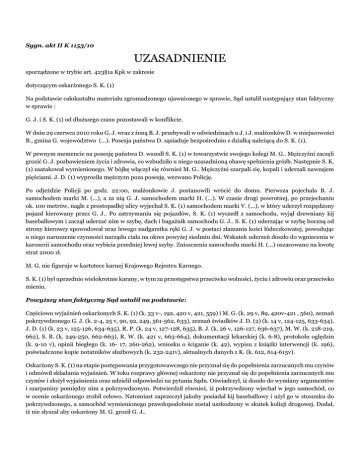 Sygn. akt II K 1153/10 UZASADNIENIE sporządzone w trybie art. 423§1a Kpk w zakresie dotyczącym oskarżonego S. K. (1) Na podstawie całokształtu materiału zgromadzonego ujawnionego w sprawie, Sąd ustalił następujący stan faktyczny w sprawie : G. J. i S. K. (1) od dłuższego czasu pozostawali w konflikcie. W dniu 29 czerwca 2010 roku G. J. wraz z żoną B. J. przebywali w odwiedzinach u J. i J. małżonków D. w miejscowości B., gmina G. województwo (...). Posesja państwa D. sąsiaduje bezpośrednio z działką należącą do S. K. (1). W pewnym memencie na posesję państwa D. wszedł S. K. (1) w towarzystwie swojego kolegi M. G.. Mężczyźni zaczęli grozić G. J. pozbawieniem życia i zdrowia, co wzbudziło u niego uzasadnioną obawę spełnienia gróźb. Następnie S. K. (1) zaatakował wymienionego. W bójkę włączył się również M. G.. Mężczyźni szarpali się, kopali i uderzali nawzajem pięściami. J. D. (1) wyprosiła mężczyzn poza posesję, wezwano Policję. Po odjeździe Policji po godz. 22:00, małżonkowie J. postanowili wrócić do domu. Pierwsza pojechała B. J. samochodem marki M. (...), a za nią G. J. samochodem marki H. (...). W czasie drogi powrotnej, po przejechaniu ok. 100 metrów, nagle z prostopadłej ulicy wyjechał S. K. (1) samochodem marki V. (...), w który uderzył rozpędzony pojazd kierowany przez G. J.. Po zatrzymaniu się pojazdów, S. K. (1) wyszedł z samochodu, wyjął drewniany kij baseballowym i zaczął uderzać nim w szybę, dach i bagażnik samochodu G. J.. S. K. (1) uderzając w szybę boczną od strony kierowcy spowodował uraz lewego nadgarstka ręki G. J. w postaci złamania kości łódeczkowatej, powodując u niego naruszenie czynności narządu ciała na okres powyżej siedmiu dni. Wskutek uderzeń doszło do wgniecenia w karoserii samochodu oraz wybicia przedniej lewej szyby. Zniszczenia samochodu marki H. (...) oszacowano na kwotę strat 2000 zł. M. G. nie figuruje w kartotece karnej Krajowego Rejestru Karnego. S. K. (1) był uprzednio wielokrotnie karany, w tym za przestępstwa przeciwko wolności, życiu i zdrowiu oraz przeciwko mieniu. Powyższy stan faktyczny Sąd ustalił na podstawie: Częściowo wyjaśnień oskarżonych S. K. (1) (k. 33 v-, 192, 420 v, 421, 559) i M. G. (k. 29 v, 89, 420v-421 , 560), zeznań pokrzywdzonego G. J. (k. 2-4, 25 v, 90, 92, 249, 561-562, 633), zeznań świadków J. D. (2) (k. 14 v, 124-125, 633-634), J. D. (1) (k. 23 v, 125-126, 634-635), R. P. (k. 24 v, 127-128, 635), B. J. (k. 26 v, 126-127, 636-637), M. W. (k. 218-219, 662), S. B. (k. 249-250, 662-663), R. W. (k. 421 v, 663-664), dokumentacji lekarskiej (k. 6-8), protokołu oględzin (k. 9-10 v), opinii biegłego (k. 16- 17, 260-262), wniosku o ściganie (k. 42), wypisu z książki interwencji (k. 196), poświadczone kopie notatników służbowych (k. 232-241v), aktualnych danych z K. (k. 612, 614-615v). Oskarżony S. K. (1) na etapie postępowania przygotowawczego nie przyznał się do popełnienia zarzucanych mu czynów i odmówił składania wyjaśnień. W toku rozprawy głównej oskarżony nie przyznał się do popełnienia zarzucanych mu czynów i złożył wyjaśnienia oraz udzielił odpowiedzi na pytania Sądu. Oświadczył, iż doszło do wymiany argumentów i szarpaniny pomiędzy nim a pokrzywdzonym. Potwierdził również, iż pokrzywdzony wjechał w jego samochód, co w ocenie oskarżonego zrobił celowo. Natomiast zaprzeczył jakoby posiadał kij baseballowy i użył go w stosunku do pokrzywdzonego, a samochód wymienionego prawdopodobnie został uszkodzony w skutek kolizji drogowej. Dodał, iż nie słyszał aby oskarżony M. G. groził G. J.. Oskarżony M. G. na etapie postępowania przygotowawczego nie przyznał się do popełnienia zarzucanego mu czynu i odmówił składania wyjaśnień. W toku rozprawy głównej oskarżony nie przyznał się do popełnienia zarzucanego mu czynu, złożył wyjaśnienia oraz udzielił odpowiedzi na pytania Sądu. Oskarżony podał, iż w dniu 29 czerwca 2010 roku był obecny na terenie posesji państwa D.. Potwierdził, iż pomiędzy oskarżonym S. K. (1), a pokrzywdzonym G. J. doszło do szarpaniny, jednakże zaprzeczył jakoby on sam w tym uczestniczył. Podał, iż nie doszło do wypowiadania przez któregokolwiek z oskarżonych gróźb karalnych względem pokrzywdzonego. Sąd zważył, co następuje: Wyjaśnienia oskarżonego wespół z pozostałymi dowodami ujawnionymi na posiedzeniu Sąd ocenił w oparciu o reguły art. 7 k.p.k., zgodnie z którymi Sąd ocenia dowody swobodnie z uwzględnieniem zasad prawidłowego rozumowania, jak i wskazań wiedzy oraz doświadczenia życiowego. W świetle zgromadzonych w sprawie dowodów okoliczności czynu, sprawstwo i wina oskarżonych S. K. (1) i M. G. nie budzi żadnych wątpliwości. Stanowcze zaprzeczenie oskarżonych odnośnie okoliczności popełnienia przestępstwa wobec całokształtu zebranego materiału dowodowego, nie może zostać potraktowane jako wiarygodne toteż Sąd odmówił im wiary. Wyjaśnienia oskarżonych S. K. (1) i M. G. zasługują na wiarę jedynie w zakresie w jakim podali, iż w dniu 29 czerwca 2010 roku byli obecni na terenie posesji J. i J. małżonków D., oraz w zakresie w jakim oskarżony S. K. (1) podał, iż doszło do zderzenia jego samochodu z samochodem pokrzywdzonego, albowiem w tym zakresie wyjaśnienia oskarżonych są zbieżne z całokształtem zebranego materiału dowodowego, w tym wiarygodnymi zeznaniami świadków J. D. (2), J. D. (1) oraz B. J.. W pozostałym zakresie wyjaśnienia oskarżonych są sprzeczne ze zgromadzonym w sprawie materiałem dowodowym i w tej części, w ocenie Sądu wynikają z przyjętej przez oskarżonych linii obrony, zmierzającej w konsekwencji do uniknięcia odpowiedzialności karnej za popełnione przestępstwa. Sąd dał wiarę pokrzywdzonemu G. J. w całości, ponieważ składał zeznania w sposób logiczny i racjonalny, szczegółowo opisując zajście w dniu 