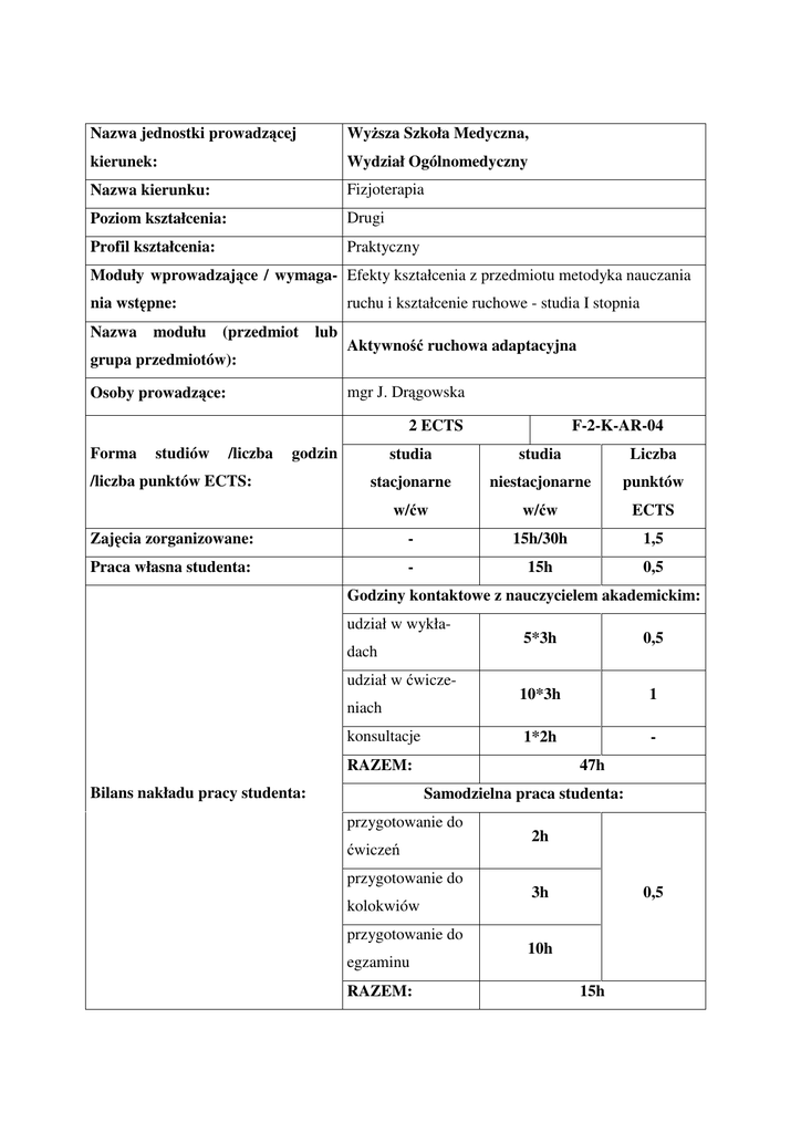 Nazwa jednostki prowadzącej Wyższa Szkoła Medyczna, kierunek: Wydział Ogólnomedyczny Nazwa kierunku: Fizjoterapia Poziom kształcenia: Drugi Profil kształcenia: Praktyczny Moduły wprowadzające / wymaga- Efekty kształcenia z przedmiotu metodyka nauczania nia wstępne: Nazwa modułu ruchu i kształcenie ruchowe - studia I stopnia (przedmiot lub grupa przedmiotów): Osoby prowadzące: Aktywność ruchowa adaptacyjna mgr J. Drągowska 2 ECTS Forma studiów /liczba godzin F-2-K-AR-04 studia studia Liczba stacjonarne niestacjonarne punktów w/ćw w/ćw ECTS Zajęcia zorganizowane: - 15h/30h 1,5 Praca własna studenta: - 15h 0,5 /liczba punktów ECTS: Godziny kontaktowe z nauczycielem akademickim: udział w wykładach udział w ćwiczeniach konsultacje 5*3h 0,5 10*3h 1 1*2h - RAZEM: Bilans nakładu pracy studenta: 47h Samodzielna praca studenta: przygotowanie do 2h ćwiczeń przygotowanie do kolokwiów przygotowanie do egzaminu RAZEM: 0,5 3h 10h 15h Cele modułu: Student nabędzie wiedzę i umiejętności praktycznego doboru różnych form aktywności ruchowej; prowadzenia zajęć rekreacyjnych z osobami niepełnosprawnymi; programowania aktywności ruchowej adaptacyjnej w rehabilitacji kompleksowej i podtrzymywaniu sprawności osób z różnymi dysfunkcjami. Efekty kształcenia: Odniesienie się Przedmiotowy do kierunko- Efekty kształcenia efekt kształcenia wych efektów kształcenia P_W01 ma wiedzę o wskazaniach i przeciwwskazaniach do K2_W19 aktywności fizycznej w różnych grupach osób ze specjalnymi potrzebami P_W02 zna zasady i koncepcje adaptacji formy ruchowej K2_W20 w stosunku do stanu zdrowia pacjenta P_W03 zna założenia edukacji zdrowotnej, promocji zdrowia K2_W19 i profilaktyki niepełnosprawności P_U01 planuje programy, modyfikuje, instruuje i oceniania K2_U15 K2_U29 zgodnie z ekologiczną analizą zadań P_U02 wykorzystuje różne metody pracy z osobami K2_U31 ze specjalnymi potrzebami w obszarze adaptowanego wychowania fizycznego, rekreacji terapeutycznej i rehabilitacji P_U03 programuje aktywność ruchową adaptacyjną w rehabili- K2_U16 tacji kompleksowej i podtrzymywaniu sprawności osób K2_U29 z różnymi dysfunkcjami P_K01 angażuje się w aktywizację kulturalną i społeczną oso- K2_K08 by niepełnosprawnej tworząc zespół i wyznaczając za- K2_K09 dania, prawidłowo identyfikuje występujące problemy P_K02 czuje się odpowiedzialny za akceptację osoby niepełno- K2_K02 sprawnej w kręgu najbliższej rodziny i znajomych, zapobieganie wykluczeniu Wiedza – student: • ma wiedzę o wskazaniach i przeciwwskazaniach do aktywności fizycznej w różnych grupach osób ze specjalnymi potrzebami, • zna zasady i koncepcje adaptacji formy ruchowej w stosunku do stanu zdrowia pacjenta, • zna założenia edukacji zdrowotnej, promocji zdrowia i profilaktyki niepełnosprawności Umiejętności – student: • planuje programy, modyfikuje, instruuje i oceniania zgodnie z ekologiczną analizą zadań, • wykorzystuje różne metody pracy z osobami ze specjalnymi potrzebami w obszarze adaptowanego wychowania fizycznego, rekreacji terapeutycznej i rehabilitacji, • programuje aktywność ruchową adaptacyjną w rehabilitacji kompleksowej i podtrzymywaniu sprawności osób z różnymi dysfunkcjami Kompetencje społeczne – student: • angażuje się w aktywizację kulturalną i społeczną osoby niepełnosprawnej tworząc zespół i wyznaczając zadania, prawidłowo identyfikuje występujące problemy, • czuje się odpowiedzialny za akceptację osoby niepełnosprawnej w kręgu najbliższej rodziny i znajomych, zapobieganie wykluczeniu Forma zajęć/metody dydaktyczne: Wykład, prelekcje multimedialne, zajęcia ćwiczeniowe, omawianie przypadków Forma i warunki zaliczenia przedmiotu w odniesieniu do efektów kształcenia. Nr efektu Metody weryfikacji efektu kształcenia kształcenia Formujące: Podsumowujące: P_W01 Ocena aktywności studenta w czasie Egzamin pisemny – student generuje / P_W02 zajęć rozpoznaje odpowiedź (esej, raport; P_W03 Obserwacja pracy na ćwiczeniach krótkie strukturyzowane pytania /SSQ/; Ocena przygotowania do zajęć test wielokrotnego wyboru /MCQ/; test Dyskusja w czasie ćwiczeń wielokrotnej odpowiedzi /MRQ/; test dopasowania; test T/N; test uzupełniania odpowiedzi) P_U01 Obserwacja pracy studenta Mini-CEX (mini – clinical examina- P_U02 Bieżąca informacja zwrotna tion) P_U03 Zaliczenie poszczególnych czynności Realizacja zleconego zadania Kolokwium praktyczne Zaliczenie poszczególnych czynności Próba pracy P_K01 Bieżąca informacja zwrotna Przedłużona obserwacja przez opieku- P_K02 Obserwacja pracy na ćwiczeniach na / nauczyciela prowadzącego Dyskusja w czasie ćwiczeń Próba pracy Ocena 360° (opinie nauczycieli, kolegów/koleżanek, pacjentów, innych współpracowników) Treści programowe: Wykłady: 15 godzin 1. Adaptowana aktywność fizyczna (APA) – pojęcia podstawowe (adaptacja, aktywność ruchowa, osoba niepełnosprawna, osoba ze specjalnymi potrzebami)./1/ 2. Historia i struktury organizacyjne APA./1/ 3. APA – nauka czy praktyka?/1/ 4. APA w kontekście społecznym (stereotypy, postawy, bariery)/1/ 5. Teoria adaptacji jako metateoria APA./1/ 6. Planowanie i tworzenie programów APA dla osób ze specjalnymi potrzebami./1/ 7. Diagnoza przy tworzeniu programów APA dla osób ze specjalnymi potrzebami./1/ 8. Ocena programów APA dla osób ze specjalnymi potrzebami./1/ 9. Teoria wzmacniania (Empowerment Theory) w pracy z osobami ze specjalnymi potrzebami./1/ 10. Współczesne modele integracji i włączenia (inclusion)./1/ 11. APA a integracja/włączenie w wychowaniu fizycznym, rekreacji i sporcie – możliwości i granice./1/ 12. Potrzeby i możliwości aktywności ruchowej osób starszych – podstawowe wskazania i przeciwwskazania/1/ 13. Technologia w APA./1/ 14. Specjalista APA – kompetencje, obszar działania i możliwości dokształcania (long life education)./1/ 15. APA – nowe kieru