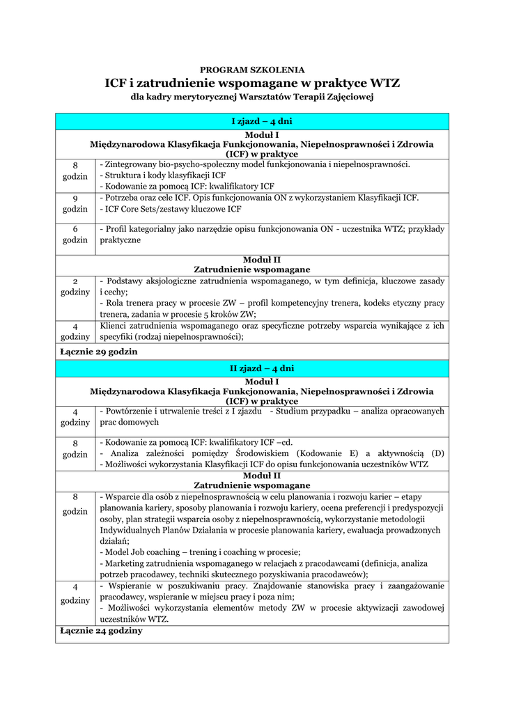 PROGRAM SZKOLENIA ICF i zatrudnienie wspomagane w praktyce WTZ dla kadry merytorycznej Warsztatów Terapii Zajęciowej I zjazd – 4 dni Moduł I Międzynarodowa Klasyfikacja Funkcjonowania, Niepełnosprawności i Zdrowia (ICF) w praktyce - Zintegrowany bio-psycho-społeczny model funkcjonowania i niepełnosprawności. 8 godzin - Struktura i kody klasyfikacji ICF - Kodowanie za pomocą ICF: kwalifikatory ICF 9 - Potrzeba oraz cele ICF. Opis funkcjonowania ON z wykorzystaniem Klasyfikacji ICF. godzin - ICF Core Sets/zestawy kluczowe ICF 6 godzin 2 godziny 4 godziny - Profil kategorialny jako narzędzie opisu funkcjonowania ON - uczestnika WTZ; przykłady praktyczne Moduł II Zatrudnienie wspomagane - Podstawy aksjologiczne zatrudnienia wspomaganego, w tym definicja, kluczowe zasady i cechy; - Rola trenera pracy w procesie ZW – profil kompetencyjny trenera, kodeks etyczny pracy trenera, zadania w procesie 5 kroków ZW; Klienci zatrudnienia wspomaganego oraz specyficzne potrzeby wsparcia wynikające z ich specyfiki (rodzaj niepełnosprawności); Łącznie 29 godzin II zjazd – 4 dni Moduł I Międzynarodowa Klasyfikacja Funkcjonowania, Niepełnosprawności i Zdrowia (ICF) w praktyce 4 - Powtórzenie i utrwalenie treści z I zjazdu - Studium przypadku – analiza opracowanych godziny prac domowych - Kodowanie za pomocą ICF: kwalifikatory ICF –cd. - Analiza zależności pomiędzy Środowiskiem (Kodowanie E) a aktywnością (D) - Możliwości wykorzystania Klasyfikacji ICF do opisu funkcjonowania uczestników WTZ Moduł II Zatrudnienie wspomagane - Wsparcie dla osób z niepełnosprawnością w celu planowania i rozwoju karier – etapy 8 godzin planowania kariery, sposoby planowania i rozwoju kariery, ocena preferencji i predyspozycji osoby, plan strategii wsparcia osoby z niepełnosprawnością, wykorzystanie metodologii Indywidualnych Planów Działania w procesie planowania kariery, ewaluacja prowadzonych działań; - Model Job coaching – trening i coaching w procesie; - Marketing zatrudnienia wspomaganego w relacjach z pracodawcami (definicja, analiza potrzeb pracodawcy, techniki skutecznego pozyskiwania pracodawców); - Wspieranie w poszukiwaniu pracy. Znajdowanie stanowiska pracy i zaangażowanie 4 godziny pracodawcy, wspieranie w miejscu pracy i poza nim; - Możliwości wykorzystania elementów metody ZW w procesie aktywizacji zawodowej uczestników WTZ. Łącznie 24 godziny 8 godzin