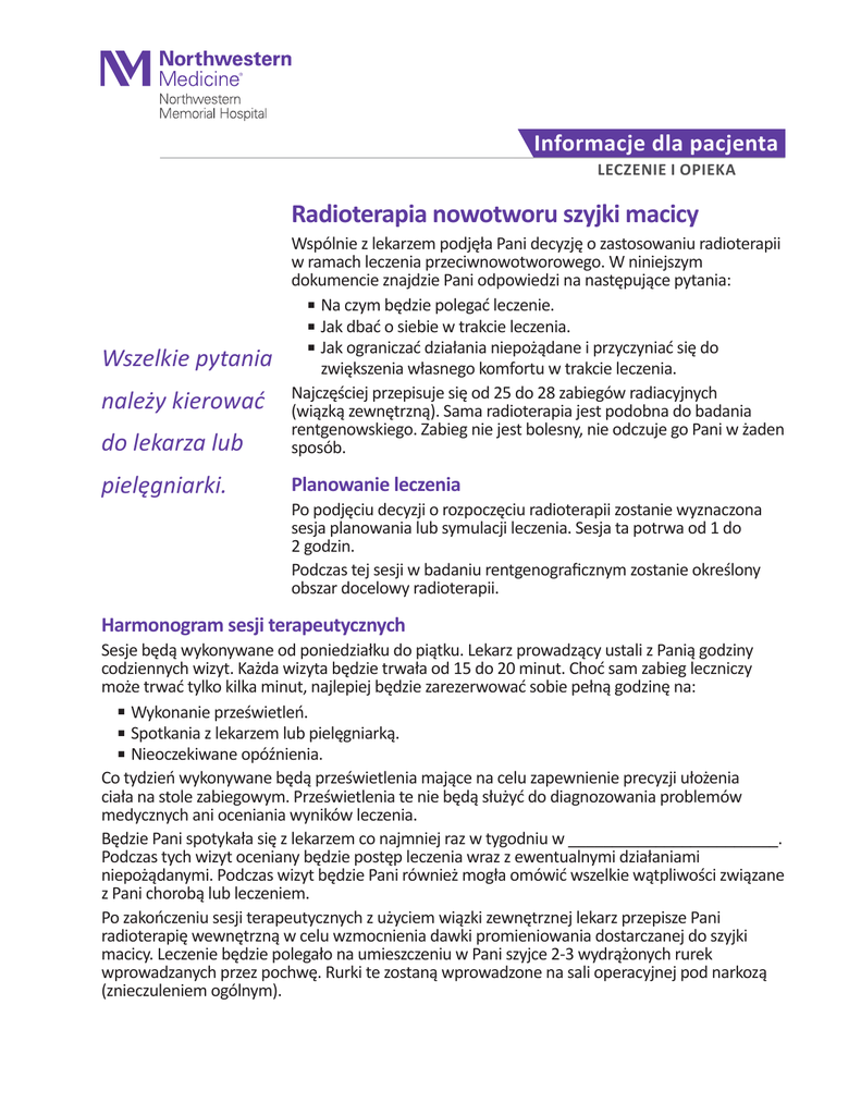 Informacje dla pacjenta LECZENIE I OPIEKA Radioterapia nowotworu szyjki macicy do lekarza lub Wspólnie z lekarzem podjęła Pani decyzję o zastosowaniu radioterapii w ramach leczenia przeciwnowotworowego. W niniejszym dokumencie znajdzie Pani odpowiedzi na następujące pytania: ■ Na czym będzie polegać leczenie. ■ Jak dbać o siebie w trakcie leczenia. ■ Jak ograniczać działania niepożądane i przyczyniać się do zwiększenia własnego komfortu w trakcie leczenia. Najczęściej przepisuje się od 25 do 28 zabiegów radiacyjnych (wiązką zewnętrzną). Sama radioterapia jest podobna do badania rentgenowskiego. Zabieg nie jest bolesny, nie odczuje go Pani w żaden sposób. pielęgniarki. Planowanie leczenia Wszelkie pytania należy kierować Po podjęciu decyzji o rozpoczęciu radioterapii zostanie wyznaczona sesja planowania lub symulacji leczenia. Sesja ta potrwa od 1 do 2 godzin. Podczas tej sesji w badaniu rentgenograficznym zostanie określony obszar docelowy radioterapii. Harmonogram sesji terapeutycznych Sesje będą wykonywane od poniedziałku do piątku. Lekarz prowadzący ustali z Panią godziny codziennych wizyt. Każda wizyta będzie trwała od 15 do 20 minut. Choć sam zabieg leczniczy może trwać tylko kilka minut, najlepiej będzie zarezerwować sobie pełną godzinę na: ■ Wykonanie prześwietleń. ■ Spotkania z lekarzem lub pielęgniarką. ■ Nieoczekiwane opóźnienia. Co tydzień wykonywane będą prześwietlenia mające na celu zapewnienie precyzji ułożenia ciała na stole zabiegowym. Prześwietlenia te nie będą służyć do diagnozowania problemów medycznych ani oceniania wyników leczenia. Będzie Pani spotykała się z lekarzem co najmniej raz w tygodniu w ________________________. Podczas tych wizyt oceniany będzie postęp leczenia wraz z ewentualnymi działaniami niepożądanymi. Podczas wizyt będzie Pani również mogła omówić wszelkie wątpliwości związane z Pani chorobą lub leczeniem. Po zakończeniu sesji terapeutycznych z użyciem wiązki zewnętrznej lekarz przepisze Pani radioterapię wewnętrzną w celu wzmocnienia dawki promieniowania dostarczanej do szyjki macicy. Leczenie będzie polegało na umieszczeniu w Pani szyjce 2-3 wydrążonych rurek wprowadzanych przez pochwę. Rurki te zostaną wprowadzone na sali operacyjnej pod narkozą (znieczuleniem ogólnym). Po przebudzeniu w sali pooperacyjnej zostanie Pani przetransportowana do oddziału radioonkologii w celu wykonania zdjęć rentgenowskich. Zdjęcia te zostaną wykonane w celu obliczenia prawidłowej dawki promieniowania. Następnie zostanie Pani przewieziona do sali szpitalnej. Po przygotowaniu dawki promieniowania lekarz przyjdzie do Pani sali i umieści implanty radiacyjne w rurkach. Będzie Pani musiała pozostawać w łóżku przez cały czas, przez który założone będą rurki z implantami radiacyjnymi. Przed zabiegiem pielęgniarka udzieli Pani bardziej szczegółowych informacji na temat implantów. Znaki wykonywane na skórze Często do identyfikacji dokładnej lokalizacji obszaru leczenia służą trwałe tatuaże. Tatuowane znaki mają wielkość pieprzyka i nie wyblakną. Skórę, na której umieszczono tatuaż można myć w zwykły sposób. Niekiedy znaki na skórze wykonywane są przy użyciu markera. W celu zapobieżenia zanikowi tych znaków nad miejscem ich umieszczenia może zostać przyklejony przezroczysty plaster. Nie należy zdejmować tego plastra ani usuwać wykonanych na skórze znaków. Należy uważać, aby nie zmyć wykonanych na skórze znaków podczas mycia. Jeśli znaki zaczną blaknąć, należy poinformować o tym lekarza. Nie należy próbować samodzielnie odtwarzać znaków. W przypadku alergii na plaster należy poinformować o niej lekarza lub pielęgniarkę. Częste działania niepożądane Pieczenie podczas oddawania moczu Promieniowanie może powodować podrażnienia pęcherza moczowego i cewki moczowej (przewodu transportującego mocz z pęcherza na zewnątrz ciała). W wyniku tych podrażnień może wystąpić pieczenie podczas oddawania moczu; stan ten nosi nazwę zapalenia pęcherza moczowego. W przypadku wystąpienia zapalenia pęcherza należy zwiększyć ilość przyjmowanych płynów. Dzięki piciu większych ilości płynów mocz będzie zawierał więcej wody i będzie mniej drażniący dla cewki moczowej. Jeśli zapalenie pęcherza będzie się utrzymywało, lekarz może poprosić o pobranie próbki moczu w celu wykonania analizy pod kątem infekcji pęcherza. W przypadku potwierdzenia infekcji lekarz może przepisać antybiotyki. W przypadku braku infekcji lekarz może przepisać leki zmniejszające uczucie pieczenia. Biegunka W docelowym obszarze leczenia może znaleźć się część jelita grubego, czyli okrężnicy. Ulegające szybkiemu podziałowi komórki jelita są bardziej wrażliwe na promieniowanie. W konsekwencji mogą wystąpić skurcze brzucha i biegunka. Efekt ten obserwuje się zazwyczaj po 10-14 sesjach. U niektórych pacjentów biegunka może pojawić się wcześniej, zaś u innych może nie wystąpić w ogóle. Aby zmniejszyć stopień napromieniowania jelita, lekarz zaleci spożycie 3-4 szklanek (750-1000 ml) wody w celu wypełnienia pęcherza moczowego 30 minut przed każdą sesją. Wypełniony pęcherz moczowy wypycha jelito ku górze, pomagając w wysunięciu go z docelowego obszaru terapii. Opisane działanie pomaga w ograniczeniu skurczów brzucha i biegunki. W razie biegunki należy poinformować o jej wystąpieniu lekarza lub pielęgniarkę. Należy koniecznie poinformować lekarza lub pielęgniarkę w przypadku, gdy do biegunki dojdzie 4 lub więcej razy w okresie 24 godzin, ponieważ może to spowodować odwodnienie organizmu. Lekarz lubi pielęgniarka zaleci dietę ubogą w błonnik. Jeśli lekarz zaleci przyjmowanie leku Imodium® A-D (chlorowodorek loperamidu), należy: ■ Zażyć 2 tabletki po pierwszym rzadkim stolcu. 2 Następnie zażywać 1 tabletkę po każdym kolejnym rzadki