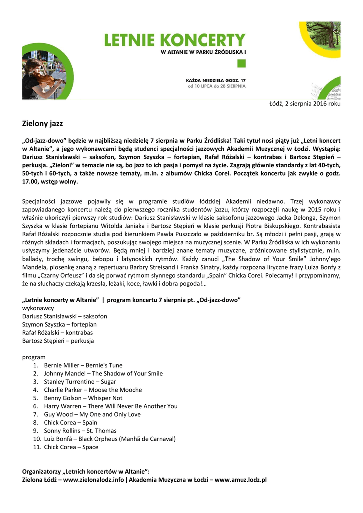 Łódź, 2 sierpnia 2016 roku Zielony jazz „Od-jazz-dowo” będzie w najbliższą niedzielę 7 sierpnia w Parku Źródliska! Taki tytuł nosi piąty już „Letni koncert w Altanie”, a jego wykonawcami będą studenci specjalności jazzowych Akademii Muzycznej w Łodzi. Wystąpią: Dariusz Stanisławski – saksofon, Szymon Szyszka – fortepian, Rafał Różalski – kontrabas i Bartosz Stępień – perkusja. „Zieloni” w temacie nie są, bo jazz to ich pasja i pomysł na życie. Zagrają głównie standardy z lat 40-tych, 50-tych i 60-tych, a także nowsze tematy, m.in. z albumów Chicka Corei. Początek koncertu jak zwykle o godz. 17.00, wstęp wolny. Specjalności jazzowe pojawiły się w programie studiów łódzkiej Akademii niedawno. Trzej wykonawcy zapowiadanego koncertu należą do pierwszego rocznika studentów jazzu, którzy rozpoczęli naukę w 2015 roku i właśnie ukończyli pierwszy rok studiów: Dariusz Stanisławski w klasie saksofonu jazzowego Jacka Delonga, Szymon Szyszka w klasie fortepianu Witolda Janiaka i Bartosz Stępień w klasie perkusji Piotra Biskupskiego. Kontrabasista Rafał Różalski rozpocznie studia pod kierunkiem Pawła Puszczało w październiku br. Są młodzi i pełni pasji, grają w różnych składach i formacjach, poszukując swojego miejsca na muzycznej scenie. W Parku Źródliska w ich wykonaniu usłyszymy jedenaście utworów. Będą mniej i bardziej znane tematy muzyczne, zróżnicowane stylistycznie, m.in. ballady, trochę swingu, bebopu i latynoskich rytmów. Każdy zanuci „The Shadow of Your Smile” Johnny’ego Mandela, piosenkę znaną z repertuaru Barbry Streisand i Franka Sinatry, każdy rozpozna liryczne frazy Luiza Bonfy z filmu „Czarny Orfeusz” i da się porwać rytmom słynnego standardu „Spain” Chicka Corei. Polecamy! I przypominamy, że na słuchaczy czekają krzesła, leżaki, koce, ławki i dobra pogoda!… „Letnie koncerty w Altanie” ǀ program koncertu 7 sierpnia pt. „Od-jazz-dowo” wykonawcy Dariusz Stanisławski – saksofon Szymon Szyszka – fortepian Rafał Różalski – kontrabas Bartosz Stępień – perkusja program 1. Bernie Miller – Bernie's Tune 2. Johnny Mandel – The Shadow of Your Smile 3. Stanley Turrentine – Sugar 4. Charlie Parker – Moose the Mooche 5. Benny Golson – Whisper Not 6. Harry Warren – There Will Never Be Another You 7. Guy Wood – My One and Only Love 8. Chick Corea – Spain 9. Sonny Rollins – St. Thomas 10. Luiz Bonfá – Black Orpheus (Manhã de Carnaval) 11. Chick Corea – Space Organizatorzy „Letnich koncertów w Altanie”: Zielona Łódź – www.zielonalodz.info ǀ Akademia Muzyczna w Łodzi – www.amuz.lodz.pl