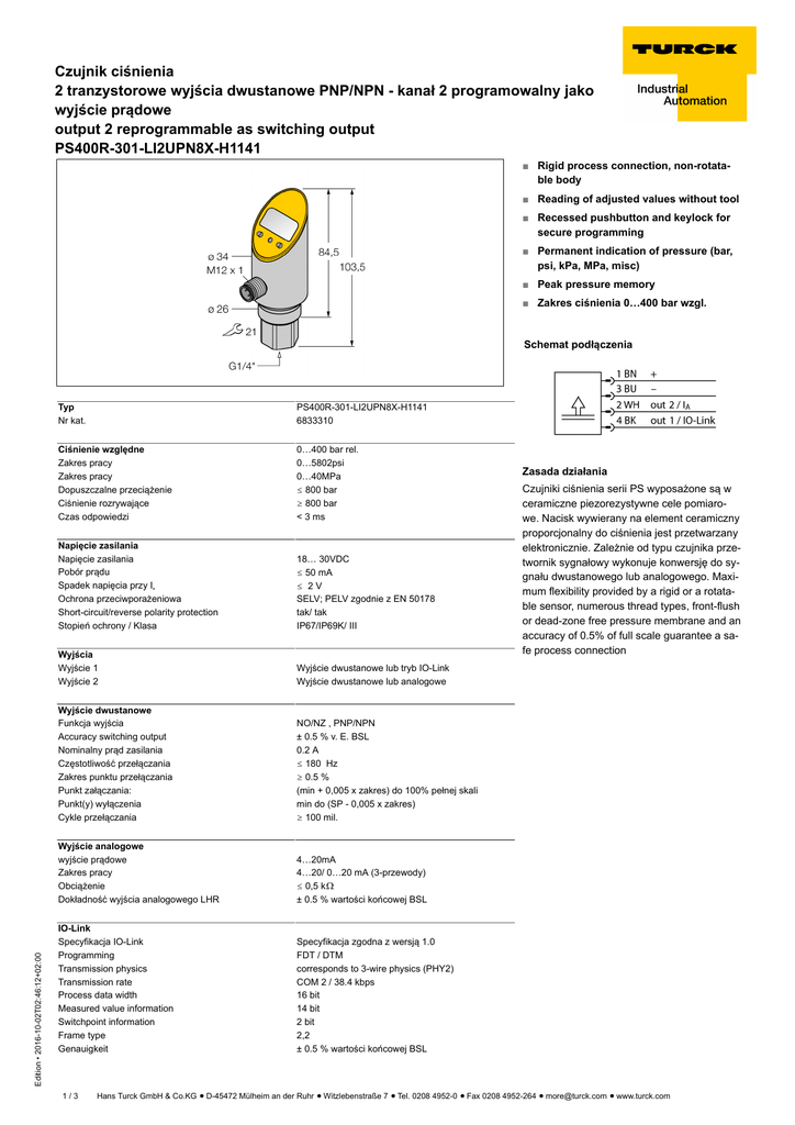 Czujnik ciśnienia 2 tranzystorowe wyjścia dwustanowe PNP/NPN - kanał 2 programowalny jako wyjście prądowe output 2 reprogrammable as switching output PS400R-301-LI2UPN8X-H1141 ■ Rigid process connection, non-rotatable body ■ Reading of adjusted values without tool ■ Recessed pushbutton and keylock for secure programming ■ Permanent indication of pressure (bar, psi, kPa, MPa, misc) ■ Peak pressure memory ■ Zakres ciśnienia 0…400 bar wzgl. Edition • 2016-10-02T02:46:12+02:00 Schemat podłączenia Typ Nr kat. PS400R-301-LI2UPN8X-H1141 6833310 Ciśnienie względne Zakres pracy Zakres pracy Dopuszczalne przeciążenie Ciśnienie rozrywające Czas odpowiedzi 0…400 bar rel. 0…5802psi 0…40MPa ð 800 bar ï 800 bar < 3 ms Napięcie zasilania Napięcie zasilania Pobór prądu Spadek napięcia przy Ie Ochrona przeciwporażeniowa Short-circuit/reverse polarity protection Stopień ochrony / Klasa 18… 30VDC ð 50 mA ð 2V SELV; PELV zgodnie z EN 50178 tak/ tak IP67/IP69K/ III Wyjścia Wyjście 1 Wyjście 2 Wyjście dwustanowe lub tryb IO-Link Wyjście dwustanowe lub analogowe Wyjście dwustanowe Funkcja wyjścia Accuracy switching output Nominalny prąd zasilania Częstotliwość przełączania Zakres punktu przełączania Punkt załączania: Punkt(y) wyłączenia Cykle przełączania NO/NZ , PNP/NPN ± 0.5 % v. E. BSL 0.2 A ð 180 Hz ï 0.5 % (min + 0,005 x zakres) do 100% pełnej skali min do (SP - 0,005 x zakres) ï 100 mil. Wyjście analogowe wyjście prądowe Zakres pracy Obciążenie Dokładność wyjścia analogowego LHR 4…20mA 4…20/ 0…20 mA (3-przewody) ð 0,5 kò ± 0.5 % wartości końcowej BSL IO-Link Specyfikacja IO-Link Programming Transmission physics Transmission rate Process data width Measured value information Switchpoint information Frame type Genauigkeit Specyfikacja zgodna z wersją 1.0 FDT / DTM corresponds to 3-wire physics (PHY2) COM 2 / 38.4 kbps 16 bit 14 bit 2 bit 2,2 ± 0.5 % wartości końcowej BSL 1/3 Zasada działania Czujniki ciśnienia serii PS wyposażone są w ceramiczne piezorezystywne cele pomiarowe. Nacisk wywierany na element ceramiczny proporcjonalny do ciśnienia jest przetwarzany elektronicznie. Zależnie od typu czujnika przetwornik sygnałowy wykonuje konwersję do sygnału dwustanowego lub analogowego. Maximum flexibility provided by a rigid or a rotatable sensor, numerous thread types, front-flush or dead-zone free pressure membrane and an accuracy of 0.5% of full scale guarantee a safe process connection Hans Turck GmbH & Co.KG ñ D-45472 Mülheim an der Ruhr ñ Witzlebenstraße 7 ñ Tel. 0208 4952-0 ñ Fax 0208 4952-264 ñ [email protected] ñ www.turck.com Czujnik ciśnienia 2 tranzystorowe wyjścia dwustanowe PNP/NPN - kanał 2 programowalny jako wyjście prądowe output 2 reprogrammable as switching output PS400R-301-LI2UPN8X-H1141 Warunki temperaturowe Temperatura medium Współczynnik temperaturowy punktu zerowego Tk0 Zakres współczynnika temperaturowego TkS Warunki otoczenia Temperatura pracy Temperatura składowania Odporność na wibracje Shock resistance EMC -40…85 °C ± 0,15 % pełnej skali / 10 K ± 0,15 % pełnej skali / 10 K -40…80 °C -40…+80°C 20 g (9…2000 Hz), zgodnie z IEC 68-2-6 50 g (11 ms) , zgodnie z IEC 61508 EN 61000-4-2 ESD:4 kV CD / 8 kV AD EN 61000-4-3 pasmo HF: 15 V/m EN 61000-4-4 impuls: 2 kV EN 61000-4-5 udar: 1000 V, 42 Ohm EN 61000-4-6 przewód HF: 10 V Obudowa Materiał obudowy Materiał łącza procesowego Materiał przetwornika ciśnienia Materiał uszczelniający Podłączenie procesowe Wrench size pressure connection / coupling nut Połączenie elektryczne Maks. moment dokręcający nakrętki obudowy stal nierdzewna/tworzywo sztuczne, V2A (1,4305) stal nierdzewna A2 1.4305 (AISI 303) Ceramics AI2O3 FPM spez. G ¼″, gwint żeński SW 21 złącze kołnierzowe, M12 x 1 35 Nm Warunki odniesienia zgodne z IEC 61298-1 temperatura Ciśnienie atmosferyczne Wilgotność Zasilanie pomocnicze 15…25 °C 860…1060 hPa bezwzgl. 45…75 % wzgl. 24 VDC Wyświetlacz Jednostka wyświetlacza 4-cyfrowy 7-segmentowy wyświetlacz, możliwość obrotu o 180°, rozłączany 2 x LED żółta Początek/koniec zakresu wyjścia analogowego; punkty załączenia/wyłączenia; PNP/NPN; styki NO/ NZ; histereza/tryb okna; filtr; jednostka ciśnienia; pamięć wartości szczytowej ciśnienia 5 zielonych diod LED (bar, psi, kPa, MPa, misc) MTTF 242 zgodnie z SN 29500 (Ed. 99) 40 °C Edition • 2016-10-02T02:46:12+02:00 Wskaźnik stanu przełączenia Wartość pomiarowa/programowanie 2/3 Hans Turck GmbH & Co.KG ñ D-45472 Mülheim an der Ruhr ñ Witzlebenstraße 7 ñ Tel. 0208 4952-0 ñ Fax 0208 4952-264 ñ [email protected] ñ www.turck.com Czujnik ciśnienia 2 tranzystorowe wyjścia dwustanowe PNP/NPN - kanał 2 programowalny jako wyjście prądowe output 2 reprogrammable as switching output PS400R-301-LI2UPN8X-H1141 Akcesoria montażowe Nr kat. PTS-Cover 6907410 Rysunek wymiarowy Osłona ochronna Edition • 2016-10-02T02:46:12+02:00 Typ 3/3 Hans Turck GmbH & Co.KG ñ D-45472 Mülheim an der Ruhr ñ Witzlebenstraße 7 ñ Tel. 0208 4952-0 ñ Fax 0208 4952-264 ñ [email protected] ñ www.turck.com