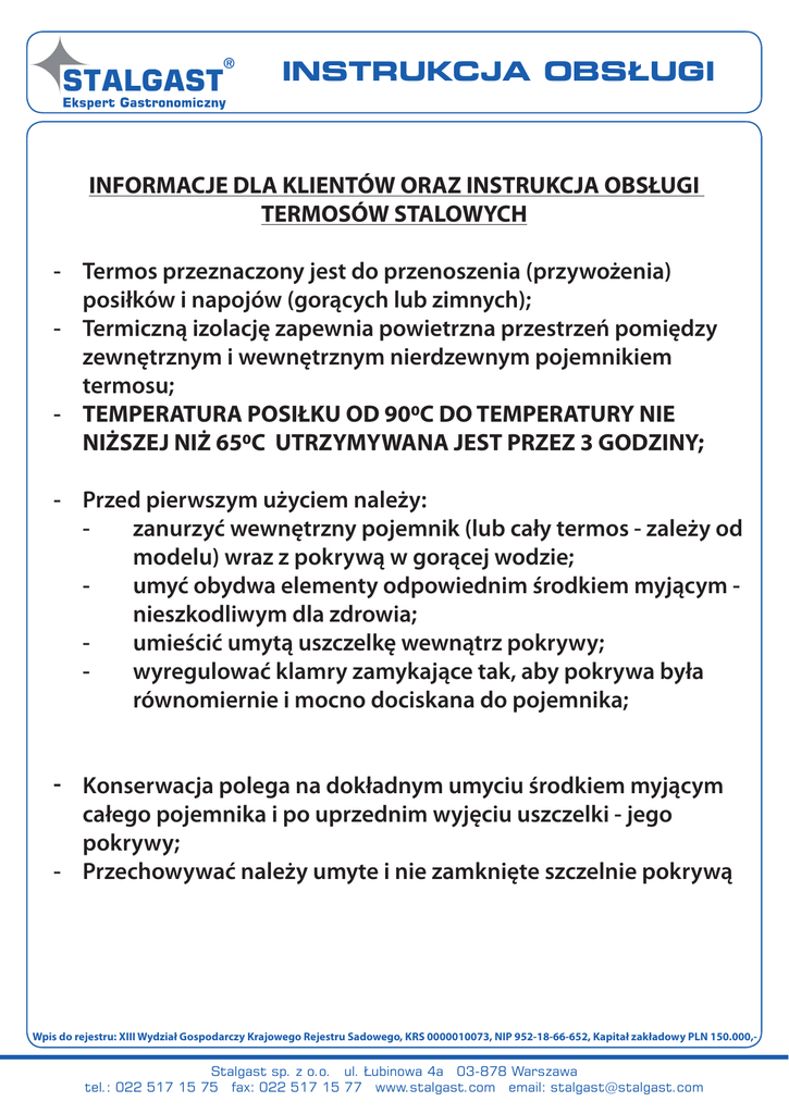 INSTRUKCJA OBSŁUGI INFORMACJE DLA KLIENTÓW ORAZ INSTRUKCJA OBSŁUGI TERMOSÓW STALOWYCH - - - Termos przeznaczony jest do przenoszenia (przywożenia) posiłków i napojów (gorących lub zimnych); Termiczną izolację zapewnia powietrzna przestrzeń pomiędzy zewnętrznym i wewnętrznym nierdzewnym pojemnikiem termosu; TEMPERATURA POSIŁKU OD 900C DO TEMPERATURY NIE NIŻSZEJ NIŻ 650C UTRZYMYWANA JEST PRZEZ 3 GODZINY; - Przed pierwszym użyciem należy: - zanurzyć wewnętrzny pojemnik (lub cały termos - zależy od modelu) wraz z pokrywą w gorącej wodzie; - umyć obydwa elementy odpowiednim środkiem myjącym nieszkodliwym dla zdrowia; - umieścić umytą uszczelkę wewnątrz pokrywy; - wyregulować klamry zamykające tak, aby pokrywa była równomiernie i mocno dociskana do pojemnika; - - Konserwacja polega na dokładnym umyciu środkiem myjącym całego pojemnika i po uprzednim wyjęciu uszczelki - jego pokrywy; Przechowywać należy umyte i nie zamknięte szczelnie pokrywą Wpis do rejestru: XIII Wydział Gospodarczy Krajowego Rejestru Sadowego, KRS 0000010073, NIP 952-18-66-652, Kapitał zakładowy PLN 150.000,- Stalgast sp. z o.o. ul. Łubinowa 4a 03-878 Warszawa tel.: 022 517 15 75 fax: 022 517 15 77 www.stalgast.com email: [email protected]