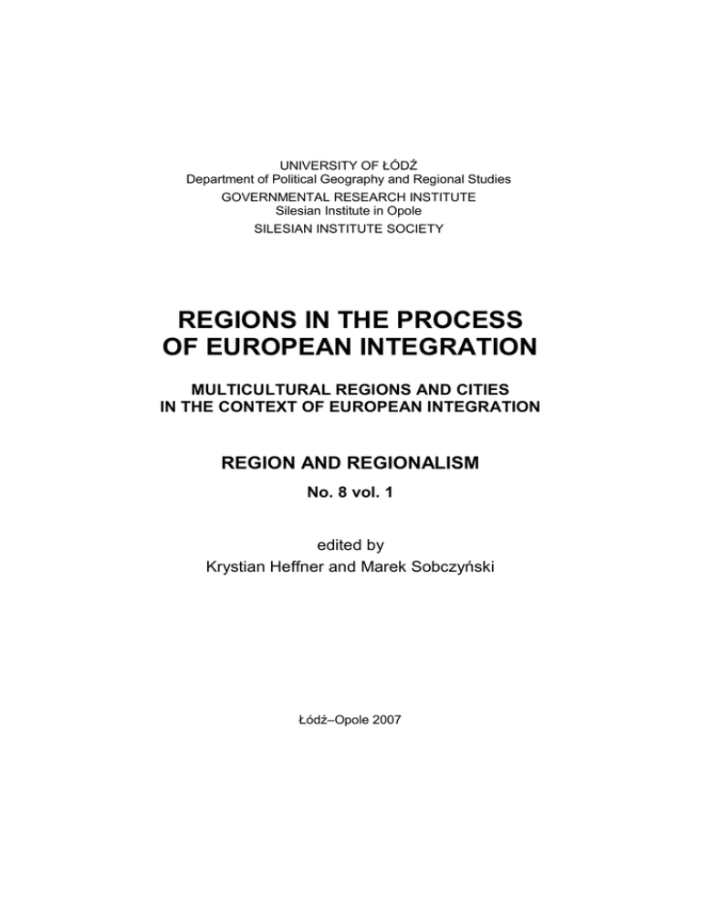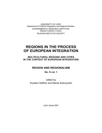 UNIVERSITY OF ŁÓDŹ Department of Political Geography and Regional Studies GOVERNMENTAL RESEARCH INSTITUTE Silesian Institute in Opole SILESIAN INSTITUTE SOCIETY REGIONS IN THE PROCESS OF EUROPEAN INTEGRATION MULTICULTURAL REGIONS AND CITIES IN THE CONTEXT OF EUROPEAN INTEGRATION REGION AND REGIONALISM No. 8 vol. 1 edited by Krystian Heffner and Marek Sobczyński Łódź–Opole 2007 REVIEWER Tadeusz Marszał Robert Rauziński MANAGING EDITOR Zofia Fijarczyk COVER Marek Jastrzębski MAPS AND FIGURES Anna Wosiak ENGLISH VERIFICATION BY Wojciech Leitloff Publikacja dofinansowana przez Ministra Nauki i Szkolnictwa Wyższego ISBN 978-83-7126-231-9 978-83-86762-37-8 PAŃSTWOWY INSTYTUT NAUKOWY – INSTYTUT ŚLĄSKI W OPOLU Printed by EDJ Edytorstwo A volume in honour of the work of Professor Marek Koter, on the occasion of his 70th birthday CONTENTS Foreword (Krystian HEFFNER and Marek SOBCZYŃSKI) ................ Anna ARASZKIEWICZ and Marek SOBCZYŃSKI – Professor’s Marek Koter scientific way from cartography to political geography ..................................................................................................... Marek SOBCZYŃSKI – Achievements of the Department of Political Geography and Regional Studies, University of Łódź, in the field of political geography ....................................................................... 5 7 17 SECTION I MULTICULTURAL REGIONS IN THE CONTEXT OF EUROPEAN INTEGRATION Milan BUFON – Multicultural regions and contact areas in the context of European integration ............................................................. Roman SZUL – Nationalization of regions, regionalization of nation-states and European integration ....................................................... Krystian HEFFNER and Brygida SOLGA – Minority regions in the process of the European integration. The case of the Opole Silesia . Wojciech JANICKI – Multicultural societies – a barrier or a key to European integration (on the example of the Muslim in the UK) ..... Marta MOSKAL – Multicultural regions and language policies in the EU countries ..................................................................................... Giorgi GOGSADZE and Joseph SALUKVADZE – Georgia: ethnopolitical conflicts and statehood building ..................................... Tomasz KOT – Region of Bukovina. The heritage of the 'Europe in miniature'? ......................................................................................... Antonio VIOLANTE – Multicultural regions in Montenegro moving towards integration into Europe ........................................................ 33 47 61 73 89 103 109 119 SECTION II MULTICULTURAL CITIES IN THE CONTEXT OF EUROPEAN INTEGRATION Magdalena BARANOWSKA and Mariusz KULESZA – The role of national minorities in the economic growth of the city of Łódź until the Second World War .............................................................................. Marek KOTER – The role of ethnic and political factors in shaping the architecture of Polish towns in the 19th and 20th centuries – the case of Łódź ...................................................................................... Ewa DAWIDEJT-JASTRZĘBSKA and Wiesław DROBEK – Multiculturalism and integration processes in the city divided by the border. The case of Cieszyn and Český Těšín ....................................... Maria SOJA and Andrzej ZBOROWSKI – Cracow: from multinational community to international European city ............................. 141 149 159 171 No 8 FOREWORD This 8th issue of the periodical Region and Regionalism entitled Regions in the Process of European Integration is dedicated to Professor Marek Koter in honour of his 70th Birthday and his well-earned retirement. Professor Koter founded this periodical 18 years ago and is still its editor. Also, 20 years ago Professor Koter pioneered in the Eastern-bloc countries international conferences on political geography, organized by the Department of Political Geography of the University of Łódź. Traditionally referred to as ‘Łódź conferences’, they were held usually in places related to the conference topics. During the last quarter-century Professor Koter has focused his research work on political geography publishing many works important for Polish as well as international literature on this subject. Moreover, he succeeded in creation of a research team working at the Department of Political Geography at the University of Łódź – the unique in Poland institution dealing with studies and schooling in this geographic subdiscipline. Composed of some of the Professor’s students, this group of scholars is referred to as the ‘Łódź school of political geography’. This volume contains two papers presenting the scholarly output of Professor Koter, written by his two ex-students: Anna Araszkiewicz and Marek Sobczyński – his first doctoral student in political geography. The volume begins with a comprehensive list of Professor Koter’s writings in political geography, which was his secondary field of interest (he wrote more on historical geography, particularly urban morphology and morphogenesis). The other paper entitled ‘Achievements of the Department of Political Geography and Regional Studies, University of Łódź, in the field of political geography’ discusses the role of Professor Koter in restitution and organization of politico-geographic research in Poland and major attainments in this filed. Further section of this volume includes papers of various authors who have co-operated with Professor Koter – often for many years – discussing 6 Foreword the issues of Multicultural Regions and Cities in the Context of European Integration. This theme has to do with the scope of scientific interest of Professor Koter. Actually, in studies on multicultural cities and regions he combined his interests in historical and political