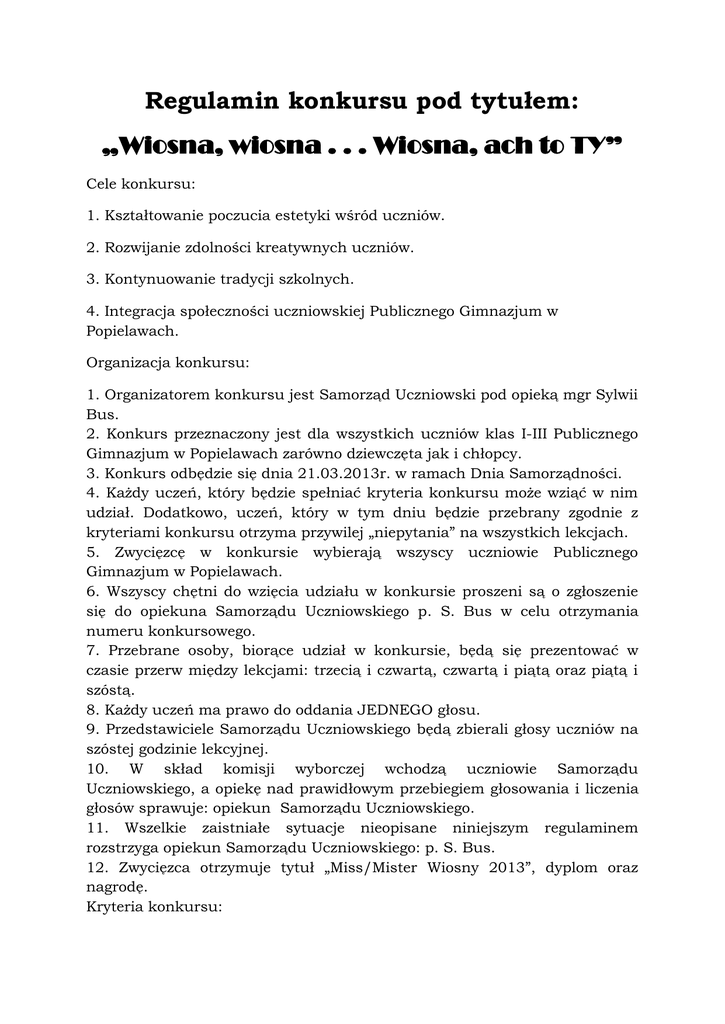 Regulamin konkursu pod tytułem: „Wiosna, wiosna . . . Wiosna, ach to TY” Cele konkursu: 1. Kształtowanie poczucia estetyki wśród uczniów. 2. Rozwijanie zdolności kreatywnych uczniów. 3. Kontynuowanie tradycji szkolnych. 4. Integracja społeczności uczniowskiej Publicznego Gimnazjum w Popielawach. Organizacja konkursu: 1. Organizatorem konkursu jest Samorząd Uczniowski pod opieką mgr Sylwii Bus. 2. Konkurs przeznaczony jest dla wszystkich uczniów klas I-III Publicznego Gimnazjum w Popielawach zarówno dziewczęta jak i chłopcy. 3. Konkurs odbędzie się dnia 21.03.2013r. w ramach Dnia Samorządności. 4. Każdy uczeń, który będzie spełniać kryteria konkursu może wziąć w nim udział. Dodatkowo, uczeń, który w tym dniu będzie przebrany zgodnie z kryteriami konkursu otrzyma przywilej „niepytania” na wszystkich lekcjach. 5. Zwycięzcę w konkursie wybierają wszyscy uczniowie Publicznego Gimnazjum w Popielawach. 6. Wszyscy chętni do wzięcia udziału w konkursie proszeni są o zgłoszenie się do opiekuna Samorządu Uczniowskiego p. S. Bus w celu otrzymania numeru konkursowego. 7. Przebrane osoby, biorące udział w konkursie, będą się prezentować w czasie przerw między lekcjami: trzecią i czwartą, czwartą i piątą oraz piątą i szóstą. 8. Każdy uczeń ma prawo do oddania JEDNEGO głosu. 9. Przedstawiciele Samorządu Uczniowskiego będą zbierali głosy uczniów na szóstej godzinie lekcyjnej. 10. W skład komisji wyborczej wchodzą uczniowie Samorządu Uczniowskiego, a opiekę nad prawidłowym przebiegiem głosowania i liczenia głosów sprawuje: opiekun Samorządu Uczniowskiego. 11. Wszelkie zaistniałe sytuacje nieopisane niniejszym regulaminem rozstrzyga opiekun Samorządu Uczniowskiego: p. S. Bus. 12. Zwycięzca otrzymuje tytuł „Miss/Mister Wiosny 2013”, dyplom oraz nagrodę. Kryteria konkursu: 1. Strój Miss Wiosny musi być utrzymany w kolorach i tonacjach wiosennych, tj. dopuszcza się kolory: żółty, zielony, pomarańczowy, niebieski, limonowy, biały i fioletowy. 2. Uczestnicy mogą malować się, ale też należy trzymać się reguł kolorystycznych przedstawionych w punkcie pierwszym kryteriów. 2. Uczestnicy konkursu muszą w szczególności zadbać o estetykę stroju i makijażu, ubiór musi być przede wszystkim czysty, schludny i harmonijny. 3. Uczestnicy konkursu muszą wykazać się twórczością i świeżym spojrzeniem na sam temat konkursu jakim jest Wiosna. 4. Uczestnicy, którzy nie będą spełniać powyższych kryteriów nie zostaną dopuszczeniu do konkursu i nie otrzymają przywileju „niepytania”. Liczymy na Waszą kreatywność i chęć dobrej zabawy. Regulamin konkursu międzyklasowego pod hasłem: „ZAKLINAMY WIOSNĘ METODAMI INTERAKTYWNYMI” Cele konkursu: 1. Kształtowanie wśród uczniów poczucia piękna otaczającego nas świata. 2. Rozwijanie zdolności twórczych uczniów oraz umiejętności posługiwania się programem PowerPoint. 3. Prezentacja pracy twórczej uczniów na stronie internetowej Publicznego Gimnazjum w Popielawach. 4. Integracja społeczności uczniowskiej Publicznego Gimnazjum w Popielawach. Organizacja konkursu: 1. Organizatorem konkursu jest Samorząd Uczniowski pod opieką mgr Sylwii Bus. 2. Konkurs przeznaczony jest dla wszystkich klas Publicznego Gimnazjum w Popielawach. 3. Konkurs odbędzie się w ramach Dnia Samorządności w roku szkolnym 2012/2013. 4. Każda klasa bierze udział w konkursie. 5. Praca konkursowa to prezentacja PowerPoint składająca się z 15 slajdów zgodna z tematem konkursu oprawiona muzyką i tekstem. 6. Zwycięzcę w konkursie wybiera Komisja Konkursowa, w skład której wchodzą przedstawiciele Samorządu Uczniowskiego (3 osoby) oraz przedstawiciele Grona Pedagogicznego (3 osoby). 7. Komisja Konkursowa ocenia prezentacje według następujących kryteriów: Oryginalność i pomysłowość prezentacji Estetyka wykonania Treść przydzielając w każdym z kryteriów punkty od 0 do 6. 8. Wszelkie zaistniałe sytuacje nieopisane niniejszym regulaminem rozstrzyga opiekun Samorządu Uczniowskiego: p. S. Bus. 9. W nagrodę prezentacja przygotowana przez zwycięską klasę zostanie umieszczona na stronie internetowej Publicznego Gimnazjum w Popielawach. 10. Dodatkową nagrodą jest również słodka niespodzianka dla całej klasy. Regulamin konkursu międzyklasowego pod tytułem: „Jeden z ośmiu” Cele konkursu: 1. Prezentacja oraz sprawdzenie swojej wiedzy i siebie w sytuacji stresowej jaką jest rywalizacja konkursowa. 2. Zaspokojenie potrzeby współzawodnictwa. 3. Doskonalenie umiejętności pokonywania stresu podczas wystąpień publicznych. 3. Integracja społeczności uczniowskiej Publicznego Gimnazjum w Popielawach. Organizacja konkursu: 1. Organizatorem i prowadzącym konkurs jest Samorząd Uczniowski pod opieką mgr Sylwii Bus. 2. Konkurs przeznaczony jest dla wszystkich klas Publicznego Gimnazjum w Popielawach. 3. W konkursie bierze udział JEDEN przedstawiciel każdej klasy wybrany demokratycznie przez wszystkich uczniów tej klasy. 4. Konkurs składa się z trzech rund. 5. Runda pierwsza wstępna - każdy uczestnik odpowiada na jedno pytanie, nie traci szansy za błąd. Runda ma na celu przygotowanie zawodników, wprowadzenie do zabawy. 6. Runda druga eliminacyjna - każdy uczestnik ma trzy szanse. Są nimi trzy kółka wycięte z kartonu, przypięte szpilką do obrusu przed każdym uczestnikiem. Po błędnej odpowiedzi kółko zostaje odpięte. Uczestnik, podobnie jak w teleturnieju "Jeden z dziesięciu" wskazuje osobę, która ma udzielić odpowiedzi na następne pytanie. Po trzecim błędzie zawodnik odpada z gry. Gra toczy się do momentu, aż zostanie trzech finalistów. 7. Runda trzecia finałowa - do wykorzystania 40 pytań. Za dobrą odpowiedź uczestnik otrzymuje 10 punktów. Do udzielenia odpowiedzi na pytanie można wskazać innego zawodnika lub wziąć pytanie na siebie za 20 punktów. W tej rundzie każdy ma trzy nowe szanse. Osoba