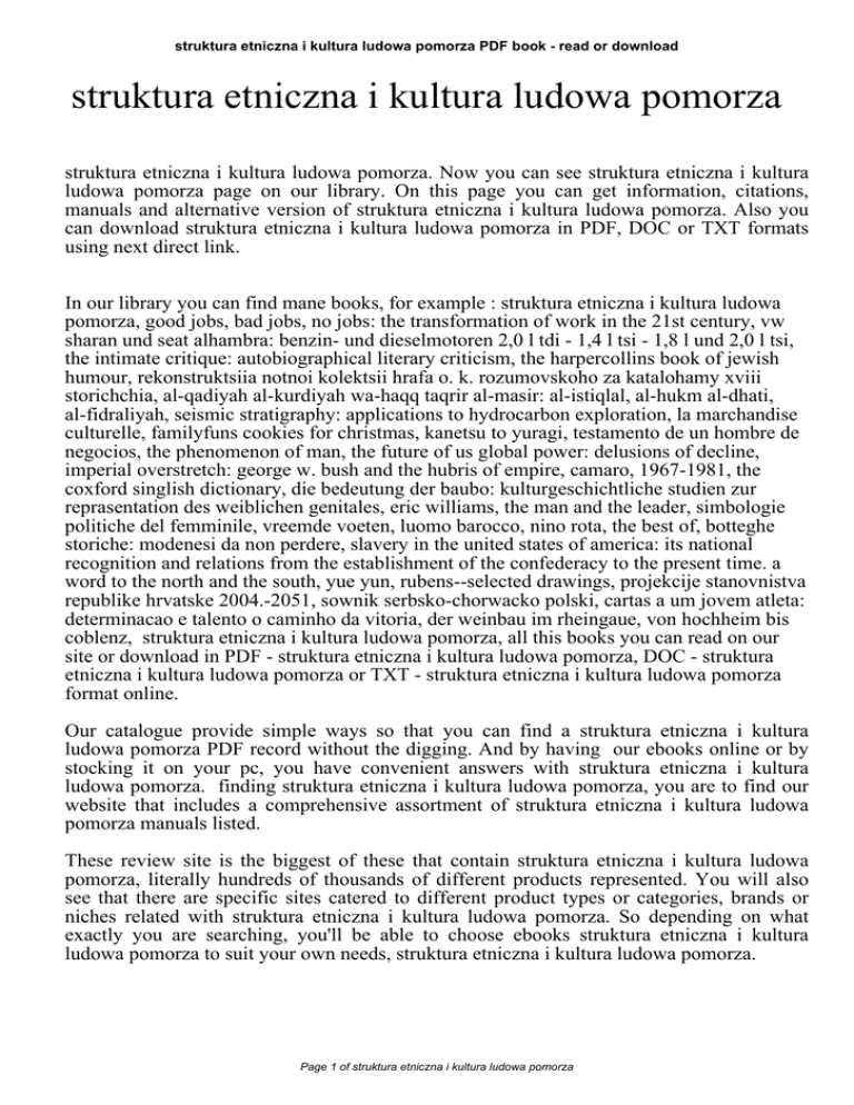 struktura etniczna i kultura ludowa pomorza PDF book - read or download struktura etniczna i kultura ludowa pomorza struktura etniczna i kultura ludowa pomorza. Now you can see struktura etniczna i kultura ludowa pomorza page on our library. On this page you can get information, citations, manuals and alternative version of struktura etniczna i kultura ludowa pomorza. Also you can download struktura etniczna i kultura ludowa pomorza in PDF, DOC or TXT formats using next direct link. In our library you can find mane books, for example : struktura etniczna i kultura ludowa pomorza, good jobs, bad jobs, no jobs: the transformation of work in the 21st century, vw sharan und seat alhambra: benzin- und dieselmotoren 2,0 l tdi - 1,4 l tsi - 1,8 l und 2,0 l tsi, the intimate critique: autobiographical literary criticism, the harpercollins book of jewish humour, rekonstruktsiia notnoi kolektsii hrafa o. k. rozumovskoho za katalohamy xviii storichchia, al-qadiyah al-kurdiyah wa-haqq taqrir al-masir: al-istiqlal, al-hukm al-dhati, al-fidraliyah, seismic stratigraphy: applications to hydrocarbon exploration, la marchandise culturelle, familyfuns cookies for christmas, kanetsu to yuragi, testamento de un hombre de negocios, the phenomenon of man, the future of us global power: delusions of decline, imperial overstretch: george w. bush and the hubris of empire, camaro, 1967-1981, the coxford singlish dictionary, die bedeutung der baubo: kulturgeschichtliche studien zur reprasentation des weiblichen genitales, eric williams, the man and the leader, simbologie politiche del femminile, vreemde voeten, luomo barocco, nino rota, the best of, botteghe storiche: modenesi da non perdere, slavery in the united states of america: its national recognition and relations from the establishment of the confederacy to the present time. a word to the north and the south, yue yun, rubens--selected drawings, projekcije stanovnistva republike hrvatske 2004.-2051, sownik serbsko-chorwacko polski, cartas a um jovem atleta: determinacao e talento o caminho da vitoria, der weinbau im rheingaue, von hochheim bis coblenz, struktura etniczna i kultura ludowa pomorza, all this books you can read on our site or download in PDF - struktura etniczna i kultura ludowa pomorza, DOC - struktura etniczna i kultura ludowa pomorza or TXT - struktura etniczna i kultura ludowa pomorza format online. Our catalogue provide simple ways so that you can find a struktura etniczna i kultura ludowa pomorza PDF record without the digging. And by having our ebooks online or by stocking it on your pc, you have convenient answers with struktura etniczna i kultura ludowa pomorza. finding struktura etniczna i kultura ludowa pomorza, you are to find our website that includes a comprehensive assortment of struktura etniczna i kultura ludowa pomorza manuals listed. These review site is the biggest of these that contain struktura etniczna i kultura ludowa pomorza, literally hundreds of thousands of different products represented. You will also see that there are specific sites catered to different product types or categories, brands or niches related with struktura etniczna i kultura ludowa pomorza. So depending on what exactly you are searching, you'll be able to choose ebooks struktura etniczna i kultura ludowa pomorza to suit your own needs, struktura etniczna i kultura ludowa pomorza. Page 1 of struktura etniczna i kultura ludowa pomorza