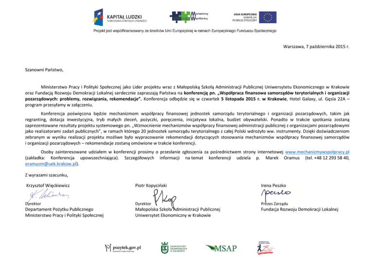 Warszawa, 7 października 2015 r. Szanowni Państwo, Ministerstwo Pracy i Polityki Społecznej jako Lider projektu wraz z Małopolską Szkołą Administracji Publicznej Uniwersytetu Ekonomicznego w Krakowie oraz Fundacją Rozwoju Demokracji Lokalnej serdecznie zapraszają Państwa na konferencję pn. „Współpraca finansowa samorządów terytorialnych i organizacji pozarządowych: problemy, rozwiązania, rekomendacje”. Konferencja odbędzie się w czwartek 5 listopada 2015 r. w Krakowie, Hotel Galaxy, ul. Gęsia 22A – program przesyłamy w załączeniu. Konferencja poświęcona będzie mechanizmom współpracy finansowej jednostek samorządu terytorialnego i organizacji pozarządowych, takim jak regranting, dotacja inwestycyjna, tryb małych zleceń, pożyczki, poręczenia, inicjatywa lokalna, budżet obywatelski. Ponadto w trakcie spotkania zostaną zaprezentowane rezultaty projektu systemowego pn. „Wzmocnienie mechanizmów współpracy finansowej administracji publicznej z organizacjami pozarządowymi jako realizatorami zadań publicznych”, w ramach którego 20 jednostek samorządu terytorialnego z całej Polski wdrożyło ww. instrumenty. Dzięki doświadczeniom zebranym w wyniku realizacji projektu możliwe było wypracowanie rekomendacji dotyczących stosowania mechanizmów współpracy finansowej samorządów i organizacji pozarządowych – rekomendacje zostaną omówione w trakcie konferencji. Osoby zainteresowane udziałem w konferencji prosimy o przesłanie zgłoszenia za pośrednictwem strony internetowej www.mechanizmywspolpracy.pl (zakładka: Konferencja upowszechniająca). Szczegółowych informacji na temat konferencji udziela p. Marek Oramus (tel. +48 12 293 58 40, [email protected]). Z wyrazami szacunku, Krzysztof Więckiewicz Piotr Kopyciński Irena Peszko Dyrektor Dyrektor Prezes Zarządu Departament Pożytku Publicznego Ministerstwo Pracy i Polityki Społecznej Małopolska Szkoła Administracji Publicznej Uniwersytet Ekonomiczny w Krakowie Fundacja Rozwoju Demokracji Lokalnej