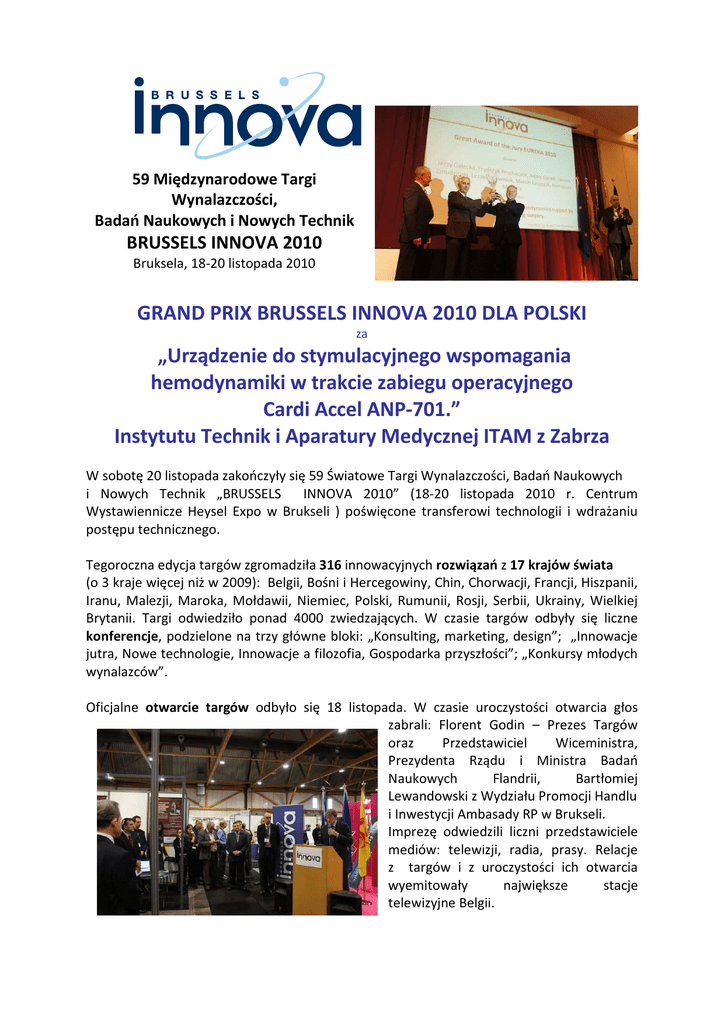 59 Międzynarodowe Targi Wynalazczości, Badań Naukowych i Nowych Technik BRUSSELS INNOVA 2010 Bruksela, 18-20 listopada 2010 GRAND PRIX BRUSSELS INNOVA 2010 DLA POLSKI za „Urządzenie do stymulacyjnego wspomagania hemodynamiki w trakcie zabiegu operacyjnego Cardi Accel ANP-701.” Instytutu Technik i Aparatury Medycznej ITAM z Zabrza W sobotę 20 listopada zakończyły się 59 Światowe Targi Wynalazczości, Badań Naukowych i Nowych Technik „BRUSSELS INNOVA 2010” (18-20 listopada 2010 r. Centrum Wystawiennicze Heysel Expo w Brukseli ) poświęcone transferowi technologii i wdrażaniu postępu technicznego. Tegoroczna edycja targów zgromadziła 316 innowacyjnych rozwiązań z 17 krajów świata (o 3 kraje więcej niż w 2009): Belgii, Bośni i Hercegowiny, Chin, Chorwacji, Francji, Hiszpanii, Iranu, Malezji, Maroka, Mołdawii, Niemiec, Polski, Rumunii, Rosji, Serbii, Ukrainy, Wielkiej Brytanii. Targi odwiedziło ponad 4000 zwiedzających. W czasie targów odbyły się liczne konferencje, podzielone na trzy główne bloki: „Konsulting, marketing, design”; „Innowacje jutra, Nowe technologie, Innowacje a filozofia, Gospodarka przyszłości”; „Konkursy młodych wynalazców”. Oficjalne otwarcie targów odbyło się 18 listopada. W czasie uroczystości otwarcia głos zabrali: Florent Godin – Prezes Targów oraz Przedstawiciel Wiceministra, Prezydenta Rządu i Ministra Badań Naukowych Flandrii, Bartłomiej Lewandowski z Wydziału Promocji Handlu i Inwestycji Ambasady RP w Brukseli. Imprezę odwiedzili liczni przedstawiciele mediów: telewizji, radia, prasy. Relacje z targów i z uroczystości ich otwarcia wyemitowały największe stacje telewizyjne Belgii. Na tegorocznej edycji targów przedstawiono 107 polskich wynalazków prezentowanych przez jednostki sfery nauki, przedsiębiorstwa produkcyjne, twórców indywidualnych oraz młodych wynalazców. Rozwiązania obejmowały zagadnienia z różnych dziedzin: ekologia, medycyna, bezpieczeństwo, lotnictwo, przemysł samochodowy i transport, metalurgia, włókiennictwo, maszyny i urządzenia, chemia, mechanika, inżynieria, elektronika, energetyka, informatyka i inne . Organizacją stoisk polskich zajmują się dwa podmioty: Eurobusiness-Haller z Katowic, Oficjalny Delegat Targów INNOVA na Polskę (54 wynalazki zgłoszone przez 41 podmiotów) oraz Stowarzyszenie Polskich Wynalazców i Racjonalizatorów z Warszawy prezentujące wynalazki członków stowarzyszenia (53 wynalazki zgłoszone przez 23 podmioty). W czasie trwania targów szczególnie zasłużeni wynalazcy zostali odznaczeni Krzyżami Zasługi Orderu Wynalazczości (Krzyż Kawalerski, Oficerski, Wielki Oficerski, Komandorski), nadanymi przez Komisję Odznaczeń Belgii. Odznaczenie to jest nadawane wybitnym wynalazcom oraz osobom i instytucjom zasłużonym dla rozwoju wynalazczości. Od szeregu lat otrzymują je także obywatele i instytucje z innych krajów, a okazją do dekoracji są targi „BRUSSELS INNOVA". Uroczystość dekoracji odbyła się 19 listopada w Urzędzie Saint Josse w Brukseli. Odznaczenia wręczył Burmistrz Jean Demandez oraz Prezes Targów Florent Godin. Jak co roku, prezentowane na Targach wynalazki zostały zgłoszone do międzynarodowego konkursu „BRUSSELS EUREKA”. W ramach konkursu wynalazki oceniane są przez jury targów reprezentowane przez ponad osiemdziesięcioosobowy zespół ekspertów. W ocenie prezentowanych rozwiązań jury bierze pod uwagę poziom nowatorstwa, nowoczesności i technologii, zapotrzebowanie społeczne, możliwości wdrażania i sprzedaży, potwierdzenie skuteczności rozwiązań stosownymi wynikami badań oraz sposób prezentacji i efektywność promocyjnomarketingową. Prezes jury targów bardzo wysoko ocenił poziom wynalazków oraz profesjonalizm i rzetelność prezentacji wynalazków promowanych przez Eurobusiness-Haller przewyższający pod tym względem inne stoiska. Uroczystość oficjalnego ogłoszenia wyników konkursu EUREKA i wręczenia nagród specjalnych targów „BRUSSELS INNOVA 2010” odbyła się w dniu 20 listopada 2010 roku. Polskie wynalazki reprezentowały bardzo wysoki poziom potwierdzony uzyskaną wysoką oceną jury. Polscy wystawcy otrzymali: Grand Prix 13 nagród specjalnych wręczonych na oficjalnej uroczystości zamknięcia targów 6 medali złotych ze specjalnym wyróżnieniem jury 30 medali złotych 56 medali srebrnych 15 medali brązowych Eurobusiness- Haller promował 54 wynalazki, które otrzymały następujące oceny: GRAND PRIX 8 nagród specjalnych wręczonych na oficjalnej uroczystości zamknięcia targów 4 medale złote ze specjalnym wyróżnieniem jury 19 medali złotych 24 medali srebrnych 7 medali brązowych Sukcesy polskich wystawców to wynik wielkiego wysiłku i zaangażowania wielu osób. Ich działania na rzecz postępu technicznego i unowocześniania procesów technicznych i technologicznych, a co za tym idzie całej naszej gospodarki, osiągają dostrzegany wymiar i dobrze służą promocji Polski w świecie. Od 1994 roku udział w targach polskich wynalazków sfery nauki jest dofinansowany przez Ministerstwo Nauki i Szkolnictwa Wyższego. Organizacja uczestnictwa polskich przedsiębiorstw i promocja polskich wynalazków prezentowanych na targach odbywa się we współpracy z Wydziałem Promocji Handlu i Inwestycji Ambasady RP w Belgii.