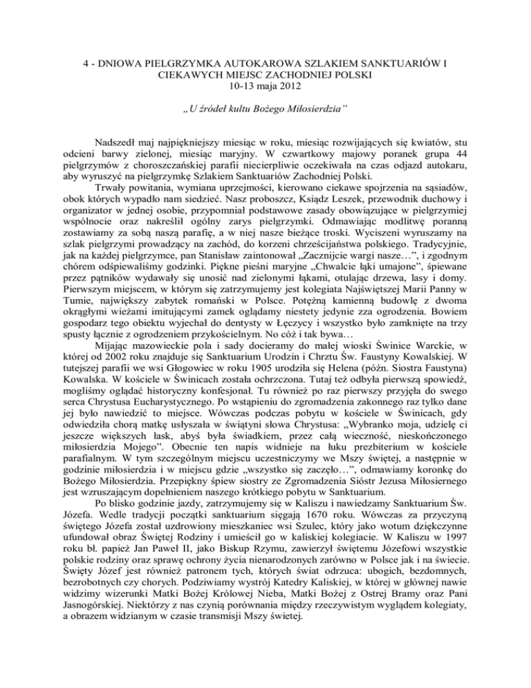 4 - DNIOWA PIELGRZYMKA AUTOKAROWA SZLAKIEM SANKTUARIÓW I CIEKAWYCH MIEJSC ZACHODNIEJ POLSKI 10-13 maja 2012 „U źródeł kultu Bożego Miłosierdzia” Nadszedł maj najpiękniejszy miesiąc w roku, miesiąc rozwijających się kwiatów, stu odcieni barwy zielonej, miesiąc maryjny. W czwartkowy majowy poranek grupa 44 pielgrzymów z choroszczańskiej parafii niecierpliwie oczekiwała na czas odjazd autokaru, aby wyruszyć na pielgrzymkę Szlakiem Sanktuariów Zachodniej Polski. Trwały powitania, wymiana uprzejmości, kierowano ciekawe spojrzenia na sąsiadów, obok których wypadło nam siedzieć. Nasz proboszcz, Ksiądz Leszek, przewodnik duchowy i organizator w jednej osobie, przypomniał podstawowe zasady obowiązujące w pielgrzymiej wspólnocie oraz nakreślił ogólny zarys pielgrzymki. Odmawiając modlitwę poranną zostawiamy za sobą naszą parafię, a w niej nasze bieżące troski. Wyciszeni wyruszamy na szlak pielgrzymi prowadzący na zachód, do korzeni chrześcijaństwa polskiego. Tradycyjnie, jak na każdej pielgrzymce, pan Stanisław zaintonował „Zacznijcie wargi nasze…”, i zgodnym chórem odśpiewaliśmy godzinki. Piękne pieśni maryjne „Chwalcie łąki umajone”, śpiewane przez pątników wydawały się unosić nad zielonymi łąkami, otulając drzewa, lasy i domy. Pierwszym miejscem, w którym się zatrzymujemy jest kolegiata Najświętszej Marii Panny w Tumie, największy zabytek romański w Polsce. Potężną kamienną budowlę z dwoma okrągłymi wieżami imitującymi zamek oglądamy niestety jedynie zza ogrodzenia. Bowiem gospodarz tego obiektu wyjechał do dentysty w Łęczycy i wszystko było zamknięte na trzy spusty łącznie z ogrodzeniem przykościelnym. No cóż i tak bywa… Mijając mazowieckie pola i sady docieramy do małej wioski Świnice Warckie, w której od 2002 roku znajduje się Sanktuarium Urodzin i Chrztu Św. Faustyny Kowalskiej. W tutejszej parafii we wsi Głogowiec w roku 1905 urodziła się Helena (późn. Siostra Faustyna) Kowalska. W kościele w Świnicach została ochrzczona. Tutaj też odbyła pierwszą spowiedź, mogliśmy oglądać historyczny konfesjonał. Tu również po raz pierwszy przyjęła do swego serca Chrystusa Eucharystycznego. Po wstąpieniu do zgromadzenia zakonnego raz tylko dane jej było nawiedzić to miejsce. Wówczas podczas pobytu w kościele w Świnicach, gdy odwiedziła chorą matkę usłyszała w świątyni słowa Chrystusa: „Wybranko moja, udzielę ci jeszcze większych łask, abyś była świadkiem, przez całą wieczność, nieskończonego miłosierdzia Mojego”. Obecnie ten napis widnieje na łuku prezbiterium w kościele parafialnym. W tym szczególnym miejscu uczestniczymy we Mszy świętej, a następnie w godzinie miłosierdzia i w miejscu gdzie „wszystko się zaczęło…”, odmawiamy koronkę do Bożego Miłosierdzia. Przepiękny śpiew siostry ze Zgromadzenia Sióstr Jezusa Miłosiernego jest wzruszającym dopełnieniem naszego krótkiego pobytu w Sanktuarium. Po blisko godzinie jazdy, zatrzymujemy się w Kaliszu i nawiedzamy Sanktuarium Św. Józefa. Wedle tradycji początki sanktuarium sięgają 1670 roku. Wówczas za przyczyną świętego Józefa został uzdrowiony mieszkaniec wsi Szulec, który jako wotum dziękczynne ufundował obraz Świętej Rodziny i umieścił go w kaliskiej kolegiacie. W Kaliszu w 1997 roku bł. papież Jan Paweł II, jako Biskup Rzymu, zawierzył świętemu Józefowi wszystkie polskie rodziny oraz sprawę ochrony życia nienarodzonych zarówno w Polsce jak i na świecie. Święty Józef jest również patronem tych, których świat odrzuca: ubogich, bezdomnych, bezrobotnych czy chorych. Podziwiamy wystrój Katedry Kaliskiej, w której w głównej nawie widzimy wizerunki Matki Bożej Królowej Nieba, Matki Bożej z Ostrej Bramy oraz Pani Jasnogórskiej. Niektórzy z nas czynią porównania między rzeczywistym wyglądem kolegiaty, a obrazem widzianym w czasie transmisji Mszy świetej. Przemierzamy kolejne miasta i wioski ziemi kaliskiej. Szlak wiedzie nas dalej na zachód, do pięknie położonego miasteczka Pobiedziska, a dokładnie do domu Sióstr Zgromadzenia Najświętszego Serca Jezusowego Sacre’ Coeur, w którym czeka na nas kolacja i nocleg. Zgromadzenie, które zostało założone we Francji przez św. Magdalenę Zofię Barat, jest zgromadzeniem międzynarodowym. Posługa wychowania i nauczania skierowana jest przede wszystkim do młodych i tych, którzy stanowią przyszłość świata, opierając się na Ewangelii, na jej wymaganiach miłości, przebaczenia, sprawiedliwości i solidarności z ubogimi i ludźmi z marginesu. O historii zgromadzenia, charyzmacie, aktualnie prowadzonych domach i zamierzeniach opowiada siostra Renata, która jest także naszym opiekunem, organizatorem kolacji, noclegu i śniadania. W kolejnym dniu, rozpoczętym Mszą świętą, najpierw udajemy się do skansenu miniatur w Pobiedziskach, zawierającego makiety obiektów historycznych i interesujących fragmentów zabudowy miast wielkopolskich. Miniatury są wykonane w skali 1:20. Zadbano o szczegóły architektoniczne, a niektóre fragmenty zrealizowano z materiałów identycznych jak obiekty oryginalne. To dziwne uczucie, gdy można być jednocześnie w Pałacu w Rogalinie lub obok Mysiej Wieży w Kruszwicy, a w ciągu kilku minut przenieść się do Biskupina, lub zrobić sobie zdjęcie przy Katedrze Poznańskiej. Opuszczamy Pobiedziska i podążamy do Lednicy. Na wyspie na Jeziorze Lednickim miał miejsce chrzest Mieszka I, a od szesnastu lat pola lednickie są miejscem spotkań młodych, organizowanych przez o. Jana Górę. Hasłem tegorocznego spotkania młodych w Lednicy, które odbędzie się 2 czerwca, są słowa zaczerpnięte z dzienniczka Siostry Faustyny „Miłość cię znajdzie”. Wspólna modlitwa, taniec, śpiew i iskra Miłosierdzia Bożego wysłana w świat będą współtworzyć tegoroczne spotkania. Podczas czuwania na polach lednickich obecne będ