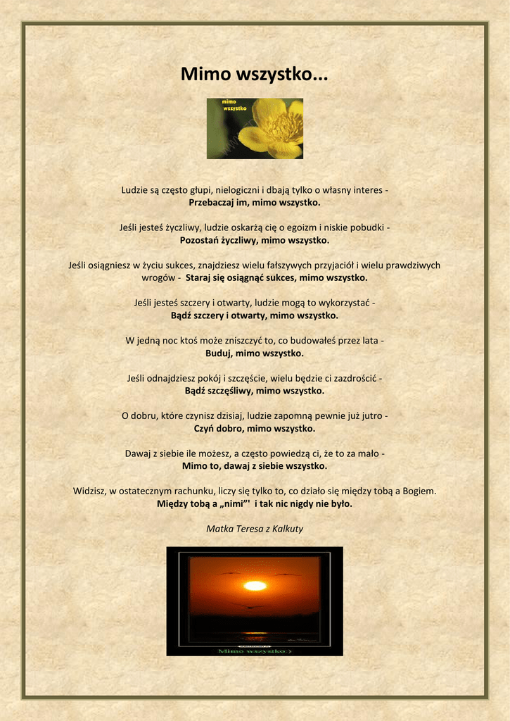 Mimo wszystko... Ludzie są często głupi, nielogiczni i dbają tylko o własny interes Przebaczaj im, mimo wszystko. Jeśli jesteś życzliwy, ludzie oskarżą cię o egoizm i niskie pobudki Pozostań życzliwy, mimo wszystko. Jeśli osiągniesz w życiu sukces, znajdziesz wielu fałszywych przyjaciół i wielu prawdziwych wrogów - Staraj się osiągnąć sukces, mimo wszystko. Jeśli jesteś szczery i otwarty, ludzie mogą to wykorzystać Bądź szczery i otwarty, mimo wszystko. W jedną noc ktoś może zniszczyć to, co budowałeś przez lata Buduj, mimo wszystko. Jeśli odnajdziesz pokój i szczęście, wielu będzie ci zazdrościć Bądź szczęśliwy, mimo wszystko. O dobru, które czynisz dzisiaj, ludzie zapomną pewnie już jutro Czyń dobro, mimo wszystko. Dawaj z siebie ile możesz, a często powiedzą ci, że to za mało Mimo to, dawaj z siebie wszystko. Widzisz, w ostatecznym rachunku, liczy się tylko to, co działo się między tobą a Bogiem. Między tobą a „nimi”' i tak nic nigdy nie było. Matka Teresa z Kalkuty