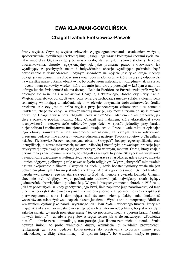 EWA KLAJMAN-GOMOLIŃSKA Chagall Izabeli Fietkiewicz-Paszek Próby wyjścia. Czym są wyjścia człowieka z jego ograniczeniami i osadzeniem w życiu, społeczeństwie, cywilizacji i rzekomej iluzji, jakiej ulega wraz z kolejnymi kadrami życia, na jakie napotyka? Ogranicza go jego własne ciało; stan umysłu, życiowe skoliozy, fizyczne uwarunkowania, choroby, egzystencjalny lęk jako prymarne prawo i obowiązek, lęk wynikający z przebytych traum i indywidualne obsesje wynikające pośrednio bądź bezpośrednio z doświadczenia. Jedynym sposobem na wyjście jest tylko droga incepcji polegająca na poznaniu na drodze snu swojej podświadomości, w której kryją się odpowiedzi na wszystkie nasze pytania, obiektywna, bo pozbawiona naleciałości względna – jak wszystko – ocena i stan całkowity wiedzy, który drzemie jako ukryty potencjał w każdym z nas i do którego ludzka świadomość nie ma dostępu. Izabela Fietkiewicz-Paszek szuka prób wyjścia opierając się m.in. na i o malarstwo Chagalla, Beksińskiego, Boscha czy Fridy Kahlo. Wyjścia poza słowo, obraz, dźwięk, poza synergię zachodzącą między sylabą a olejem, poza semantykę wynikającą z nałożenia się i w efekcie otrzymania trójwymiarowości środka przekazu. Ale czy jest to próba wyjścia przy jednoczesnym zakotwiczeniu w sztuce i uwikłaniu, chcąc nie chcąc, w sztukę? Inaczej mówiąc, czy można trzymając się kurczowo obrazu np. Chagalla wyjść poza Chagalla i poza siebie? Moim zdaniem nie, ale próbować, jak chce i oczekuje poetka, można... Marc Chagall jest malarzem, który ukształtował swoją rzeczywistość i rzeczywistość odbiorców jego dzieł w sposób jednolity przy bardzo niejednolitym i nielinearnym funkcjonowaniu swojej sztuki. Przez kilkadziesiąt lat oglądając jego obrazy zauważam w ich znajomości nieznajome, za każdym razem odkrywane, przesłania budzące inne emocje i tworzące odmienne nastroje. Tryptyk sonetów o Chagallu w książce Fietkiewicz-Paszek rozpoczyna obraz „Skrzypek” będący egzemplifikacją oraz identyfikacją, a nawet tożsamością malarza. Mistyką i metafizyką prowadzącą procesję jego artystycznej i życiowej postawy z jego wiecznym, bo wiernym, mottem. Obraz, który znają a przynajmniej znać powinni wszyscy, bo Chagall i skrzypek to jedno. Skrzypek ma wyjątkowe i symboliczne znaczenie w kulturze żydowskiej, zwłaszcza chasydzkiej, gdzie śpiew, muzyka i taniec odgrywają olbrzymią rolę nawet w życiu religijnym. Wyraz „skrzypek” mimowolnie nasuwa skojarzenie z filmem „Skrzypek na dachu”, gdzie bohater tytułowy wcale nie jest bohaterem głównym, którym jest mleczarz Tewje. Ale skrzypek to symbol. Symbol tradycji, narodu wybranego i jego świata, skrzypek to Żyd jak menora i gwiazda Dawida. Chagall, choć nie był religijny, swoje pochodzenie traktował jak największy skarb będący jednocześnie obowiązkiem i powinnością. W tym kubistycznym mocno obrazie z 1913 roku, jak i w pozostałych, są kody genetyczne jego krwi, linie papilarne jego narodowości, od tego bierze się początek stanowiący wyznacznik życiowej podróży aż po kres. Postać skrzypka jest pierwszoplanowa, silna i dominująca nad światem, ziemią. Jakby cała dookolność wszechświata miała żydowski zapach, akcent judaizmu. Wynika to i z interpretacji Biblii ze wskazaniem Żydów jako narodu wybranego jak i losu Żyda – wiecznego tułacza, który nie mając skrawka swej ziemi, stanowi esencję powietrza, którym oddychamy, bo jest w każdym zakątku świata. „– niech powietrze niesie / to, co pozostało, niech z uporem krąży, / szuka nowych imion...” – zaledwie parę słów z tegoż sonetu jak wiele znaczących. „Powietrze niesie” – obwieszcza, komunikuje, transportuje, jest listonoszem nieba i ziemi. „Szuka nowych imion” to próba wniknięcia duszy, wniknięcia jej składnika proweniencji, reinkarnacji za życia będącej koniecznością do przetrwania żydostwa mimo jego nadchodzącej wielkiej eksterminacji. „Z uporem krąży”, bo wszystko krąży, to prawo krążenia, prawo matki-ziemi we wszechświecie. „Tu właśnie się zgubił, / nie zdążył na pociąg, zagapił się – skrzypek” – naród żydowski się zgubił i pogubił się w diasporze na płaszczyźnie religijnej i poza religijnej. Sam Chagall nie był judaistą, a Żydzi którzy przyjęli chrzest poróżnili się o krzyż, na którym umarł Jezus, by ludzie nauczyli się sobie nawzajem wybaczać, ale człowiek tego nie potrafi choć ma zamiar, więc „Alejhem weał bnejhem” kończy Izabela Fietkiewicz-Paszek swoją liryczną transmisję z Chagalla, jakże oboje obdarci z tej ziemskiej siły grawitacji i jak oboje głęboko wierzący, że religia jest nade wszystko uczuciem, a reszta resztą jedynie. Poetka podkłada mu pod kontrastowe barwy swój dwunastozgłoskowiec, by wspólny krzyk stereo stał się akompaniamentem dla skrzypka. „Skrzypek” to Żyd, „Łyżka mleka” (drugi obraz Chagalla w książce „Próby wyjścia”) to judaizm, a „Samotność” (trzeci obraz) to diaspora, rozpad, zagłada. Tylko trzy obrazy, tylko trzy sonety, cały żydowski świat, cała żydowska tragedia, cała tragedia świata, który na to dał pozwolenie. W „Łyżce mleka” dużo czerwieni, bo to krew, rodzina, życie i śmierć. Chyba właśnie w tym sonecie poetka najbardziej personifikuje ducha, ożywia obraz, a poprzez ożywienie porusza nim jak w ruchomych książeczkach dla dzieci. „...Rutyna, nic wielkiego. Jednak: / jest w tym jakaś czułość, nieszczególnie rzewna, / jakby stała za nią przenikliwa jasność, / że rozpad wyrasta z codziennych zaniedbań.” Rola kobiety w judaizmie i wypełnianie jej jako przejaw nie tylko wiary i poszanowania tradycji, ale także i nade wszystko miłości do swojego mężczyzny. Miłości, która nie dźwięczy słowami jak odpustowymi koralikami, ale po prostu jest, obrazuje ją codzienność, wype