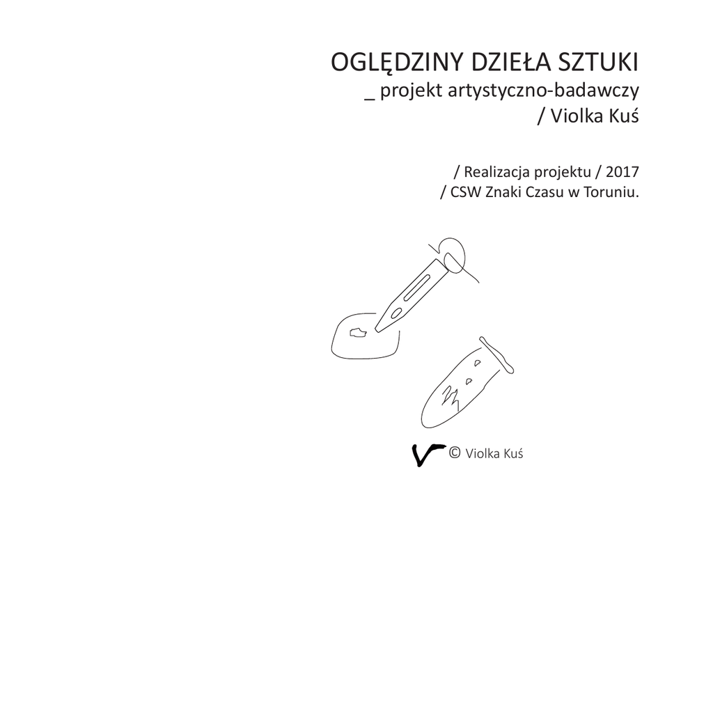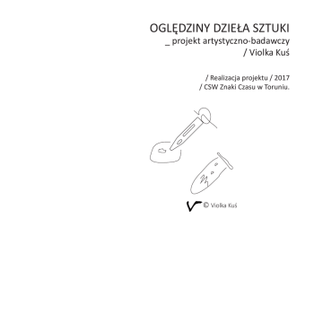 OGLĘDZINY DZIEŁA SZTUKI _ projekt artystyczno-badawczy / Violka Kuś / Realizacja projektu / 2017 / CSW Znaki Czasu w Toruniu. © Violka Kuś IDEA Za nim dzieło znajdzie swoje życie w ekspozycji istnieje wiele procesów i interakcji z dziełem całego sztabu osób związanych z przygotowaniem wystawy, dzieła są przenoszone, archiwizowane, magazynowane znów przenoszone to jest ten okres w którym obiekt sztuki pozostaje najdłużej i pomimo środków ostrożności i procedur ten okres życia dzieła pozostawia swoje „ślady użytkowania”, następuje dotyk dzieła, otarcia, zawilgocenia, zakurzenia itp. Oględziny to wizualizacja synergii dzieła w bezpośrednim kontakcie z otoczeniem jej mikroświatów żyjących w obrębie powierzchni obrazu czy obiektu. A AKCJA / PERFORMANCE (oględziny miejsca ekspozycji sztuki zgodnie z zasadami detektywistycznymi, zbiór materiału dowodowego w postaci śladów substancjalnych i biologicznych zabezpieczonych na wybranych 10 dziełach sztuki) B PROCES BADAWCZY (analiza pod mikroskopem zabezpieczonych śladów „użytkowania dzieła”) C EKSPOZYCJA (ekspozycja zebranego materiału w postaci fotografii makroskopowej i dokumentacji wideo z miejsc oględzin) Szczegółowy opis prac: A AKCJA / PERFORMANCE (rys.1) 1. Kierunek poruszania się detektywa/performerki wg dośrodkowego schematu prowadzenia oględzin - oględziny prowadzone są zgodnie z ruchem wskazówek zegara. (rys.2) 2. Wybór 10 dzieł do analizy badawczej. 3. Rejestracja wideo miejsca oględzin z użyciem kamery GoPro. 4. Zabezpieczenie śladów wg zasady indywidualności i tajności oględzin z użyciem metody subiektywnej przy użyciu uniwersalnego zestawu detektywistycznego. Poszukiwane będą i zabezpieczone ślady substancjalne: daktyloskopijnych czyli ślady linii papilarnych, a także biologiczne; włos, plama krwi, wydzieliny owadów, włókno, żyjące bakterie, roztocza itp. rys.1 _/ Dzieło sztuki _/ kamera GoPro _/ uniwersalny zestaw detektywistyczny rys.2 _/ przestrzeń ekspozycji sztuki dośrodkowy schemat prowadzenia oględzin - oględziny prowadzone są zgodnie z ruchem wskazówek zegara B PROCES BADAWCZY 1. Analiza zebranych próbek i wykonanie fotografii z użyciem mikroskopu: Bresser LCD Mikroskop 3.5’’ 50-2000x 5MP. (rys.3) 2. Wybór i obróbka materiałów makrofotografii. _ / próbki śladów daktyloskopijnych _ / biologicznych rys.3 _ / panel z podglądem 2000x _ / powiększony obraz zostaje przekonwertowany na format grafiki rastrowej C EKSPOZYCJA Przedmiotem wystawy będą: 1. Materiał badawczy - makrofotografie zaprezentowany na blok pleksi, każda o wymiarach 30x30x4 cm, w druku UV. 2. Materiał wideo z oględzin i zabezpieczenia śladów prezentowany z użyciem ramek cyfrowych, do każdej makrofotografii zostanie przypisany obraz wideo. _ / blok pleksi 30 x 30 x 4 cm _ / druk UV w odbiciu lustrzanym _ / ODS_1/10 _ / ramka cyfrowa _ / wideo z rejestracji miejsca oględzin _ / postument x 10