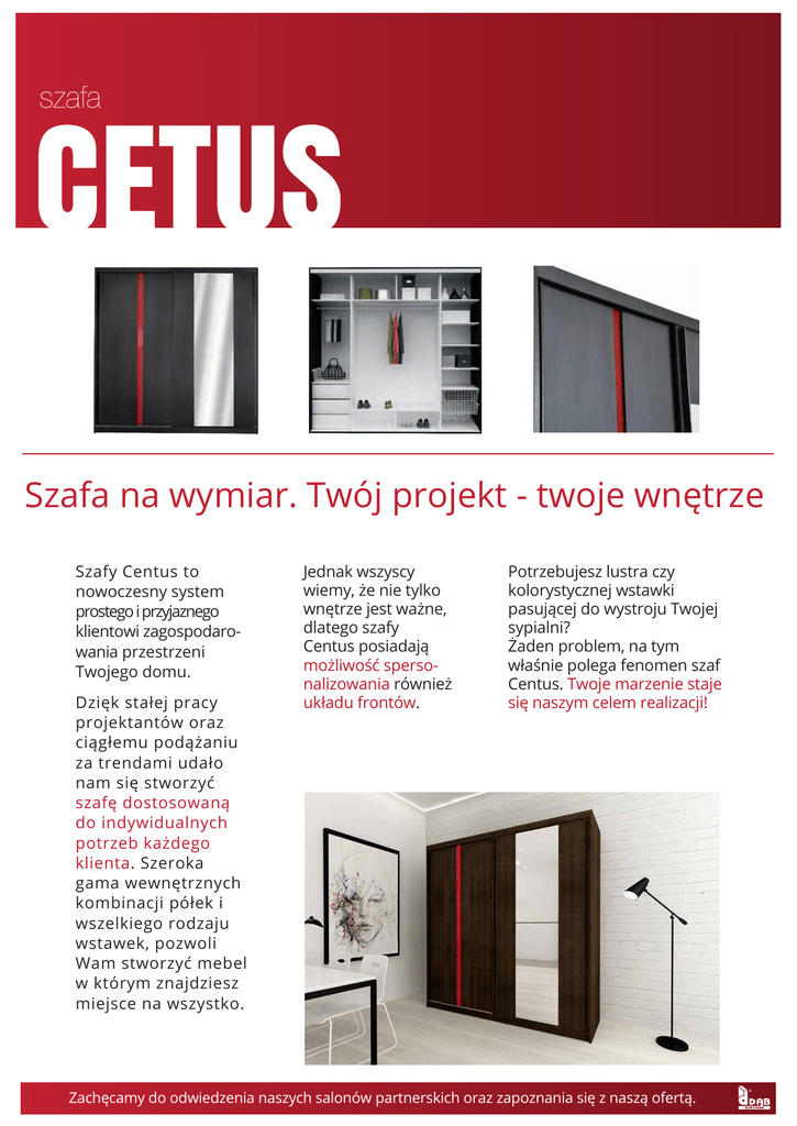 Szafa na wymiar. Twój projekt - twoje wnętrze Szafy Centus to nowoczesny system prostego i przyjaznego klientowi zagospodarowania przestrzeni Twojego domu. Dzięk stałej pracy projektantów oraz ciągłemu podążaniu za trendami udało nam się stworzyć szafę dostosowaną do indywidualnych potrzeb każdego klienta. Szeroka gama wewnętrznych kombinacji półek i wszelkiego rodzaju wstawek, pozwoli Wam stworzyć mebel w którym znajdziesz miejsce na wszystko. Jednak wszyscy wiemy, że nie tylko wnętrze jest ważne, dlatego szafy Centus posiadają możliwość spersonalizowania również układu frontów. Potrzebujesz lustra czy kolorystycznej wstawki pasującej do wystroju Twojej sypialni? Żaden problem, na tym właśnie polega fenomen szaf Centus. Twoje marzenie staje się naszym celem realizacji! Zachęcamy do odwiedzenia naszych salonów partnerskich oraz zapoznania się z naszą ofertą.