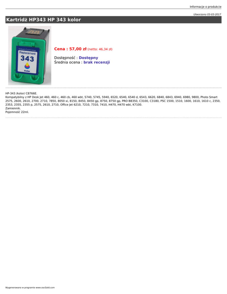 Informacje o produkcie Utworzono 03-03-2017 Kartridż HP343 HP 343 kolor Cena : 57,00 zł (netto: 46,34 zł) Dostępność : Dostępny Średnia ocena : brak recenzji HP-343 /kolor/ C8766E. Kompatybilny z HP Desk Jet 460, 460 c, 460 cb, 460 wbt, 5740, 5745, 5940, 6520, 6540, 6540 d, 6543, 6620, 6840, 6843, 6940, 6980, 9800, Photo Smart 2575, 2600, 2610, 2700, 2710, 7850, 8050 xi, 8150, 8450, 8450 gp, 8750, 8750 gp, PRO B8350, C3100, C3180, PSC 1500, 1510, 1600, 1610, 1610 c, 2350, 2353, 2355, 2355 p, 2575, 2610, 2710, Office Jet 6210, 7210, 7310, 7410, H470, H470 wbt, K7100. Zamiennik. Pojemność 22ml. Wygenerowano w programie www.oscGold.com