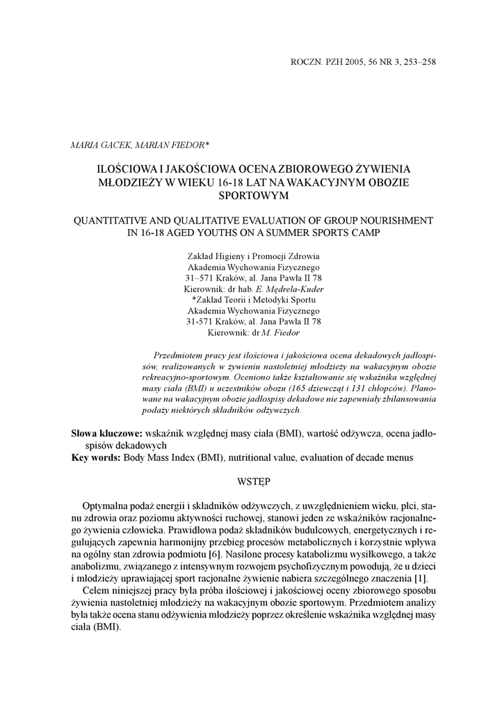 Nr 3 Ocena ¿ywienia m³odzie¿y na obozie sportowym ROCZN. PZH 2005, 56 NR 3, 253258 253 MARIA GACEK, MARIAN FIEDOR* ILOCIOWA I JAKOCIOWA OCENA ZBIOROWEGO ¯YWIENIA M£ODZIE¯Y W WIEKU 16-18 LAT NA WAKACYJNYM OBOZIE SPORTOWYM QUANTITATIVE AND QUALITATIVE EVALUATION OF GROUP NOURISHMENT IN 16-18 AGED YOUTHS ON A SUMMER SPORTS CAMP Zak³ad Higieny i Promocji Zdrowia Akademia Wychowania Fizycznego 31571 Kraków, al. Jana Paw³a II 78 Kierownik: dr hab. E. Mêdrela-Kuder *Zak³ad Teorii i Metodyki Sportu Akademia Wychowania Fizycznego 31-571 Kraków, al. Jana Paw³a II 78 Kierownik: dr M. Fiedor Przedmiotem pracy jest ilociowa i jakociowa ocena dekadowych jad³ospisów, realizowanych w ¿ywieniu nastoletniej m³odzie¿y na wakacyjnym obozie rekreacyjno-sportowym. Oceniono tak¿e kszta³towanie siê wskanika wzglêdnej masy cia³a (BMI) u uczestników obozu (165 dziewcz¹t i 131 ch³opców). Planowane na wakacyjnym obozie jad³ospisy dekadowe nie zapewnia³y zbilansowania poda¿y niektórych sk³adników od¿ywczych. S³owa kluczowe: wskanik wzglêdnej masy cia³a (BMI), wartoæ od¿ywcza, ocena jad³ospisów dekadowych Key words: Body Mass Index (BMI), nutritional value, evaluation of decade menus WSTÊP Optymalna poda¿ energii i sk³adników od¿ywczych, z uwzglêdnieniem wieku, p³ci, stanu zdrowia oraz poziomu aktywnoci ruchowej, stanowi jeden ze wskaników racjonalnego ¿ywienia cz³owieka. Prawid³owa poda¿ sk³adników budulcowych, energetycznych i reguluj¹cych zapewnia harmonijny przebieg procesów metabolicznych i korzystnie wp³ywa na ogólny stan zdrowia podmiotu [6]. Nasilone procesy katabolizmu wysi³kowego, a tak¿e anabolizmu, zwi¹zanego z intensywnym rozwojem psychofizycznym powoduj¹, ¿e u dzieci i m³odzie¿y uprawiaj¹cej sport racjonalne ¿ywienie nabiera szczególnego znaczenia [1]. Celem niniejszej pracy by³a próba ilociowej i jakociowej oceny zbiorowego sposobu ¿ywienia nastoletniej m³odzie¿y na wakacyjnym obozie sportowym. Przedmiotem analizy by³a tak¿e ocena stanu od¿ywienia m³odzie¿y poprzez okrelenie wskanika wzglêdnej masy cia³a (BMI). M. Gacek, M. Fiedor 254 Nr 3 MATERIA£ I METODYKA Analizie poddano dekadowe jad³ospisy planowane na wakacyjnym obozie sportowym dla m³odzie¿y w wieku 16-18 lat w roku 2003 w Olsztynie. Analizê ilociow¹ racji pokarmowych przeprowadzono w oparciu o tabele wartoci od¿ywczych produktów i potraw [7], a uzyskane dane, po uwzglêdnieniu redukcji (strat nieuniknionych i technologicznych), odniesiono do norm ¿ywieniowych na poziomie bezpiecznego spo¿ycia dla m³odzie¿y o umiarkowanej aktywnoci fizycznej [13]. Analizê jakociow¹ wykonano z zastosowaniem punktowej metody oceny jad³ospisów wg Starzyñskiej [6]. Przedmiotem analizy by³o równie¿ kszta³towanie siê wartoci wskanika BMI w badanej próbie 165 dziewcz¹t i 131 ch³opców. Analizê porównawcz¹ w tym zakresie pomiêdzy ch³opcami i dziewczêtami wykonano z zastosowaniem testu frakcji U. WYNIKI W tabeli I przedstawiono dobow¹ poda¿ energii i podstawowych sk³adników od¿ywczych w przeciêtnej dziennej racji pokarmowej (CRP) jad³ospisów dekadowych. Z zestawionych danych wynika, i¿ wartoæ kaloryczna dobowych racji pokarmowych (2605,7 kcal) zawiera siê w granicach rednich norm energetycznych dla m³odzie¿y w wieku 16-18 lat o umiarkowanej aktywnoci fizycznej. Zawartoæ bia³ka (85,4 g) przekracza normy na poziomie bezpiecznego spo¿ycia, oscyluj¹c w zakresie wartoci zalecanych. Przeciêtna dobowa poda¿ t³uszczu (88,5 g) zawiera siê w zakresie normy bezpiecznego spo¿ycia u dziewcz¹t, u ch³opców natomiast pozostaje doñ zbli¿ona. Z kolei zawartoæ wêglowodanów w CRP (366,9 g) jest niewystarczaj¹ca w odniesieniu do zaleceñ ¿ywieniowych dla ch³opców w tej grupie wieku (535-600 g). Rozk³ad udzia³u energii z poszczególnych sk³adników od¿ywczych kszta³tuje siê jak: 13,1% z bia³ka, 30,6% z t³uszczów i 56,3% z wêglowodanów. Ta b e l a I . Przeciêtna zawartoæ energii i podstawowych sk³adników od¿ywczych w dziennych racjach pokarmowych jad³ospisów dekadowych The average content of energy and essential nutritious components in daily rations of food on decade menus 2SLVDQDSRGD ']LHZF] WDQRUP\ &KáRSF\QRUP\ (QHUJLD %LDáNR 7áXV]F]H : JORZRGDQ\ NFDO J J J ± ± ± ± ± ± ± ± Przeciêtn¹ zawartoæ sk³adników reguluj¹cych w dziennych racjach pokarmowych dekadowych jad³ospisów przedstawiono w tabeli II. Poda¿ wapnia, ustalona na poziomie 636,9 mg stanowi zaledwie 57,9% normy na poziomie bezpiecznego spo¿ycia, zarówno u dziewcz¹t jak i ch³opców. Podobnie, niedobory stwierdzono w zakresie poda¿y ¿elaza i magnezu. Opisano jednoczenie ponadnormatywn¹ poda¿ fosforu (1186,3 g), która stanowi 148,3% bezpiecznej normy ¿ywieniowej. Uzyskane dla wapnia i fosforu wartoci wiadcz¹ o niekorzystnym stosunku ilociowym pomiêdzy tymi sk³adnikami w analizowanych racjach pokarmowych. Stwierdzono równie¿ wysok¹, ponadnormatywn¹ poda¿ witamin roz- Ocena ¿ywienia m³odzie¿y na obozie sportowym Nr 3 Ta b e l a I I . 255 Przeciêtna zawartoæ sk³adników reguluj¹cych w dziennych racjach pokarmowych jad³ospisów dekadowych The average content of regulation elements in daily food rations on decade menus :DS )RVIRU HOD]R 0DJQH $ ( %:LWDPLQ\ % PJ PJ PJ ]PJ PJ PJ PJ PJ D QD D LVS GR 2S Z D HL] W] ' F \P URQ \F SR áK & Ta b e l a I I I . 33 & PJ PJ Punktowa ocena dekadowych jad³ospisów w oparciu o metodê wg Starzyñskiej Punctual evaluation of menus on the base of Starzynskas method /LF]EDSRVLáNyZ %LDáNRSHáQRZDUW 0OHNROXEVHU\ :DU]\ZDOXERZRFH 6XURZHZDU]\ZD OXERZRFH 3URGXNW\W\SX SLHF]\ZRUD]RZH NDV]HLWS .DWHJRULH PQLHM ZHZV]\VWNLFKSRVLáNDFK ZSRVLáNyZ U]DG]LHM FRG]LHQQLHZSRVLáNDFK FRG]LHQQLHFRQDMPQLHMZSRVLáNX U]DG]LHM FRG]LHQQLHFRQDMPQLHMZSRVLáNDFK FRG]LHQQLHFRQDMPQLHMZSRVLáNDFK U]DG]LHM FRG]LHQQLH ZGQL U]DG]LHM FRG]LHQQLHFRQDMPQLHM]QLFK ZGQLMHGHQ]QLFK U]DG]LHM /LF]ED )UHNZHQFMD M. Gacek, M. Fiedor 256 Nr 3 puszcz