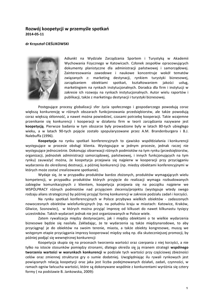 Rozwój koopetycji w przemyśle spotkań 2014-‐05-‐11 dr Krzysztof CIEŚLIKOWSKI Adiunkt na Wydziale Zarządzania Sportem i Turystyką w Akademii Wychowania Fizycznego w Katowicach. Członek zespołów opracowujących dokumenty planistyczne dla administracji państwowej i samorządowej. Zainteresowania zawodowe i naukowe koncentruje wokół tematów związanych z: marketing destynacji, rynkiem turystyki biznesowej, zarządzaniem obiektami spotkań, kształtowaniem jakości usług, marketingiem na rynkach instytucjonalnych. Doradca dla firm i instytucji w zakresie ich rozwoju na rynkach instytucjonalnych. Autor wielu raportów i publikacji, także z marketingu destynacji i turystyki biznesowej. Postępujące procesy globalizacji sfer życia społecznego i gospodarczego powodują coraz większą konkurencję w różnych obszarach funkcjonowania przedsiębiorstw, ale także powodują coraz większą skłonność, a nawet można powiedzieć, czasami potrzebę kooperacji. Takie wzajemne przenikanie się konkurencji i kooperacji w działaniu firm w teorii zarządzania nazywane jest koopetycją. Pierwsze badania w tym obszarze były prowadzone były w latach 80-‐tych ubiegłego wieku, a w latach 90-‐tych pojęcie zostało spopularyzowane przez A.M. Brandenburgera i B.J. Nalebuffa (1996). Koopetycja na rynku spotkań konferencyjnych to zjawisko współdziałania i konkurencji występujące w procesie obsługi klienta. Występujące w jednym procesie, jednak raczej nie występujące jednocześnie. Dokonując obserwacji różnych podmiotów na tym rynku (przedsiębiorstw, organizacji, jednostek administracji samorządowej, państwowej, i innych funkcjonujących na tym rynku) zauważyć można, że koopetycja przejawia się najpierw w kooperacji przy przyciąganiu wydarzenia do określonej destnacji, a później konkurencji (np. miedzy obiektami konferencyjnymi w których może zostać zrealizowane spotkanie). Wydaje się, że w przypadku produktów bardzo złożonych, produktów wymagających wielu kompetencji, w przypadku produktów których przyjęcie do realizacji wymaga rozbudowanych zabiegów komunikacyjnych z klientem, koopetycja przejawia się na początku najpierw we WSPÓLPRACY różnych podmiotów nad przyjęciem zlecenia/projektu (występuje wtedy swego rodzaju alians strategiczny) by później przyjąć formę konkurencji w zakresie podziału zadań i korzyści. Na rynku spotkań konferencyjnych w Polsce przybywa wielkich obiektów -‐ zadaszonych nowoczesnych obiektów wielofunkcyjnych (np. na południu kraju w miastach: Katowice, Kraków, Gliwice, Sosnowiec), w których można przyjąć imprezę od kilkuset do nawet kilkunastu tysięcy uczestników. Takich wydarzeń jednak nie jest organizowanych w Polsce wiele. Zatem rywalizacja między destynacjami, jak i między obiektami o te wielkie wydarzenia biznesowe będzie się nasilała. Zakładając, że te wydarzenia są także międzynarodowe, to aby przyciągnąć je do obiektów na swoim terenie, miasta, a także obiekty kongresowe, muszą we wstępnym etapie przyciągania imprezy kooperować między sobą np. dla skuteczniejszej promocji, by później podjąć się wewnętrznej konkurencji Koopetycja skupia się ̨ na procesach tworzenia wartości oraz czerpania z niej korzyści, a nie tylko na istocie stosunków pomiędzy stronami, dlatego określa się ̨ ją mianem strategii wspólnego tworzenia wartości w warunkach konkurencji w podziale tych wartości przy częściowej zbieżności celów oraz zmiennej strukturze gry o sumie dodatniej. Uwzględniając ilu rywali rynkowych jest powiązanych relacją koopetycji oraz jaka jest liczba podejmowanych działań, zadań, czynności, w ramach ogniw łańcucha wartości, które są ̨ dokonywane wspólnie z konkurentami wyróżnia się cztery formy ( na podstawie B. Jankowska, 2009): 1 koopetycja bilateralna prosta: oznacza relacje miedzy dwoma przedsiębiorstwami, które odnoszą ̨ się ̨ do jednego poziomu, jednego typu działań w ramach łańcucha tworzenia wartości, np. konsorcjum w zakresie B+R, promocji -‐ koopetycja bilateralna złożona: oznacza relacje między dwoma przedsiębiorstwami, które konkurują ̨ np. w kanale dystrybucji, ale kooperują ̨ w zakresie doskonalenia jakości usług i wprowadzania nowych technologii; -‐ koopetycja sieciowa prosta: to relacje w grupie przedsiębiorstw, które są ̨ dla siebie zarówno odbiorcami, jak i dostawcami; -‐ koopetycja sieciowa złożona: urzeczywistnieniem jej są ̨ skupiska -‐ klastry i wielostronne porozumienia biznesowe (szczególnie na określonym terytorium)dla realizacji określonych celów Na rynku spotkań konferencyjnych występuje raczej koopetycja sieciowa złożona. Kilka obiektów kongresowych zabiega o przyjęcie wydarzenia i przygotowuje wspólną ofertę, w koordynację tych działań aktywnie włącza się administracja samorządowa lub państwa (w zależności od skali wydarzenia). Wydaje się, że zarządzający obiektami spotkań w Polsce oraz inni dostawcy na tym rynku są coraz bardziej świadomi konieczności koopetycji. Przejawia się to także w coraz częstszym pojawianiu ich na konferencjach i warsztatach branżowych, wspólnych dyskusjach nad problemami branży, wypracowywanie wspólnej metodyki badań rynku spotkań, wymianie wiadomości na temat zmian prawnych, możliwości założenia wniosków aplikacyjnych dotyczących realizacji wspólnych projektów, czy pojawianiu się ich oferty na wspólnym krajowym stoisku w przypadku targów międzynarodowych adresowanych do zleceniodawców z przemysłu spotkań. Strategia koopetycji stała się ̨ ważnym aspektem funkcjonowania podmiotów na rynku spotkań konferencyjnych, ponieważ ̇ sama konkurencja nie wnosi wartości dodanej, zaś połączenie konkurencji ze współpracą pozwala na następujące korzyści: -‐ uzyskanie oszczędności dzięki koordynacji czynności z innymi uczestnikami kanału dystrybucji czy też komunikacj
