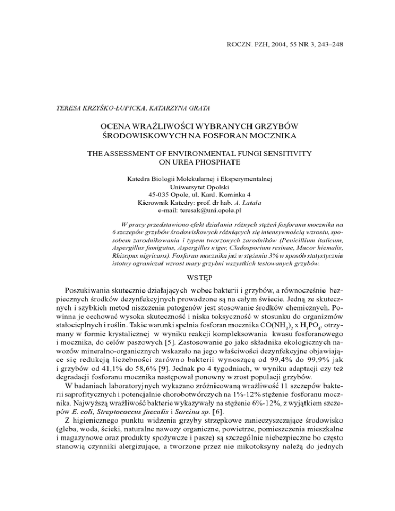 Nr 3 Wra¿liwoæ grzybów rodowiskowych na fosforanPZH, mocznika ROCZN. 2004, 55 NR 3, 243248 243 TERESA KRZYKO-£UPICKA, KATARZYNA GRATA OCENA WRA¯LIWOCI WYBRANYCH GRZYBÓW RODOWISKOWYCH NA FOSFORAN MOCZNIKA THE ASSESSMENT OF ENVIRONMENTAL FUNGI SENSITIVITY ON UREA PHOSPHATE Katedra Biologii Molekularnej i Eksperymentalnej Uniwersytet Opolski 45-035 Opole, ul. Kard. Kominka 4 Kierownik Katedry: prof. dr hab. A. Lata³a e-mail: [email protected] W pracy przedstawiono efekt dzia³ania ró¿nych stê¿eñ fosforanu mocznika na 6 szczepów grzybów rodowiskowych ró¿ni¹cych siê intensywnoci¹ wzrostu, sposobem zarodnikowania i typem tworzonych zarodników (Penicillium italicum, Aspergillus fumigatus, Aspergillus niger, Cladosporium resinae, Mucor hiemalis, Rhizopus nigricans). Fosforan mocznika ju¿ w stê¿eniu 3% w sposób statystycznie istotny ogranicza³ wzrost masy grzybni wszystkich testowanych grzybów. WSTÊP Poszukiwania skutecznie dzia³aj¹cych wobec bakterii i grzybów, a równoczenie bezpiecznych rodków dezynfekcyjnych prowadzone s¹ na ca³ym wiecie. Jedn¹ ze skutecznych i szybkich metod niszczenia patogenów jest stosowanie rodków chemicznych. Powinna je cechowaæ wysoka skutecznoæ i niska toksycznoæ w stosunku do organizmów sta³ocieplnych i rolin. Takie warunki spe³nia fosforan mocznika CO(NH 2)2 x H3PO4, otrzymany w formie krystalicznej w wyniku reakcji kompleksowania kwasu fosforanowego i mocznika, do celów paszowych [5]. Zastosowanie go jako sk³adnika ekologicznych nawozów mineralno-organicznych wskaza³o na jego w³aciwoci dezynfekcyjne objawiaj¹ce siê redukcj¹ liczebnoci zarówno bakterii wynosz¹c¹ od 99,4% do 99,9% jak i grzybów od 41,1% do 58,6% [9]. Jednak po 4 tygodniach, w wyniku adaptacji czy te¿ degradacji fosforanu mocznika nastêpowa³ ponowny wzrost populacji grzybów. W badaniach laboratoryjnych wykazano zró¿nicowan¹ wra¿liwoæ 11 szczepów bakterii saprofitycznych i potencjalnie chorobotwórczych na 1%-12% stê¿enie fosforanu mocznika. Najwy¿sz¹ wra¿liwoæ bakterie wykazywa³y na stê¿enie 6%-12%, z wyj¹tkiem szczepów E. coli, Streptococcus faecalis i Sarcina sp. [6]. Z higienicznego punktu widzenia grzyby strzêpkowe zanieczyszczaj¹ce rodowisko (gleba, woda, cieki, naturalne nawozy organiczne, powietrze, pomieszczenia mieszkalne i magazynowe oraz produkty spo¿ywcze i pasze) s¹ szczególnie niebezpieczne bo czêsto stanowi¹ czynniki alergizuj¹ce, a tworzone przez nie mikotoksyny nale¿¹ do jednych 244 T. Krzyko-£upicka, K.Grata Nr 3 z najgroniejszych zwi¹zków rakotwórczych [11]. Okolicznoci zanieczyszczenia mog¹ byæ rozmaite, a intensywnoæ ich rozwoju zale¿na jest od czynników abiotycznych i sposobu od¿ywiania grzybni. Prze¿ywalnoæ ich w rodowiskach bogatych w substancje organiczne jak i mechanizm dzia³ania w tych warunkach preparatów dezynfekcyjnych nie jest dostatecznie poznany. W literaturze brak jest danych na temat grzybobójczych czy grzybobójczych czy grzybostatycznych w³aciwoci fosforanu mocznika. Celem badañ by³a ocena wp³ywu ró¿nych dawek fosforanu mocznika na wzrost wybranych grzybów rodowiskowych ró¿ni¹cych siê intensywnoci¹ rozwoju i typem tworzonych zarodników. MATERIA£ I METODY Materia³ badawczy stanowi³y wybrane szczepy grzybów strzêpkowych warunkowo chorobotwórczych wyizolowanych z: pasz Aspergillus fumigatus, Rhizopus nigricans gnojowicy Penicillium italicum oraz gleby traktowanej Roundupem, zdolne do biodegradacji zwi¹zków fosforoorganicznych Aspergillus niger, Mucor hiemalis i Cladosporium resinae [7, 8]. Ich przynale¿noæ gatunkow¹ oznaczono na podstawie cech morfologicznych wg kluczy diagnostycznych [1, 4]. W badaniach u¿yto fosforan mocznika w stê¿eniach: 1%, 3%, 6%, 9% i 12%. Dzia³anie ró¿nych dawek fosforanu mocznika na testowane grzyby oceniano w p³ynnych hodowlach statycznych. Hodowle testowanych grzybów prowadzono w kolbach Erlenmayera o pojemnoci 250 ml w p³ynnym pod³o¿u mineralnym Czapek do, którego wprowadzano fosforan mocznika w iloci daj¹cej koñcowe stê¿enie odpowiednio: 1%, 3%, 6%, 9% i 12%. Pod³o¿a szczepiono wystandaryzowanym inokulum o tej samej gêstoci dla wszystkich szczepów i inkubowano przez 10 dni w temperaturze 25°C. Nastêpnie oznaczano such¹ masê grzybni w temperaturze 105°C. Wyniki podano w gramach suchej masy/1dm3 hodowli. Kontrolê stanowi³ wzrost ww. grzybów w mineralnym pod³o¿u Czapek (bez fosforanu mocznika). Oznaczenia wykonano w 5. powtórzeniach dla ka¿dego szczepu. Wp³yw ró¿nych stê¿eñ fosforanu mocznika na wzrost badanych grzybów opracowano statystycznie metod¹ wariancji jednoczynnikowej z zastosowaniem wielokrotnego testu rozstêpu Duncana. WYNIKI I ICH OMÓWIENIE Badane szczepy grzybów wyranie ró¿ni³y siê intensywnoci¹ wzrostu w optymalnych warunkach hodowlanych: l szczepy z podgromady Zygomycotina (Mucor i Rhizopus) oraz Aspergillus niger cechowa³a du¿a szybkoæ wzrostu grzybni, l pozosta³e szczepy z podgromady Deuteromycotina (Aspergillus, Penicillium) cechowa³ ograniczony wzrost grzybni, ale obficie wytwarza³y zarodniki przez co szybko kolonizowa³y rodowisko, a szczep Cladosporium wytwarza³ zarodniki o zgrubia³ej b³onie, lepiej przystosowane do zachowania ¿ywotnoci w niekorzystnych warunkach rodowiskowych. Testowane szczepy grzybów strzêpkowych w stosunku do kontroli wykaza³y zró¿nicowan¹ wra¿liwoæ na zastosowane dawki fosforanu mocznika, ale ¿adne z zastosowanych stê¿eñ preparatu nie doprowadzi³o do ca³kowitego zahamowania ich wzrostu. Zastosowanie fosforanu mocznika w najni¿szym stê¿eniu (1%) pozwoli³o wydzieliæ dwie grupy grzybów: w pierwszej obserwowano istotne (P<0,05) hamowaniem przyrostu suchej masy grzybni (5-18%) szczepów Aspergillus fumigatus, Penicillium italicum i wysokoistotnym Wra¿liwoæ grzybów rodowiskowych na fosforan mocznika Nr 3 245 P G J D V D P D K F X V G F E F EF D $ % $ $ $ $ % & $ $ $ $ $VSHUJLOOXVQLJHU0XFRUKLHPDOLV5KL]RSX