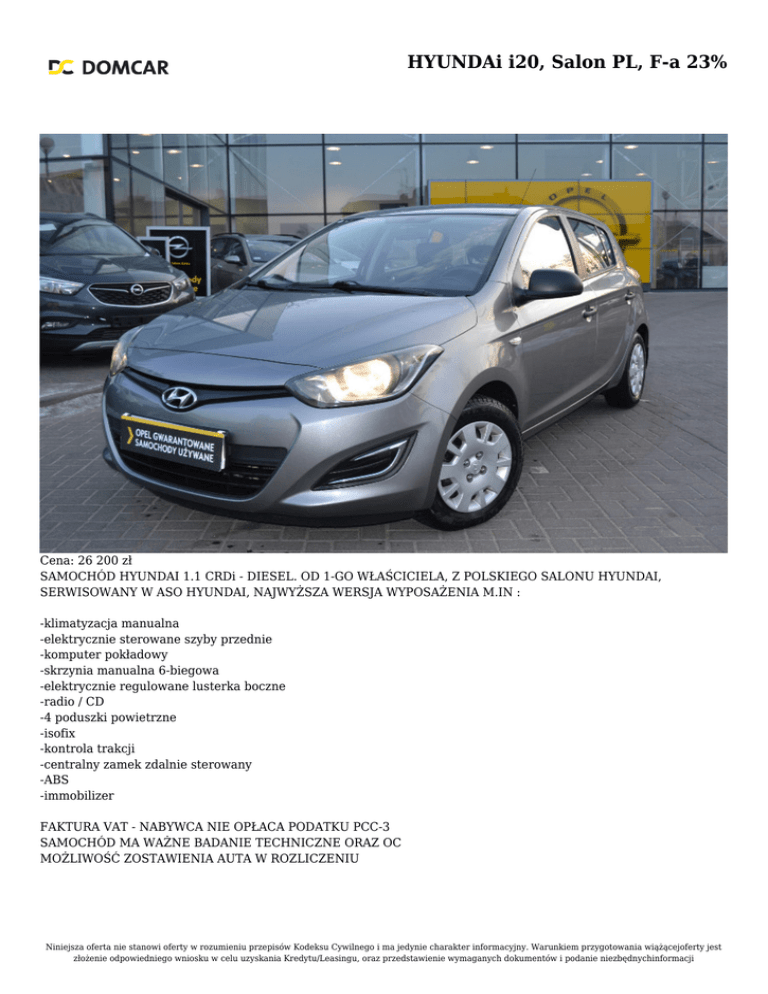 HYUNDAi i20, Salon PL, F-a 23% Cena: 26 200 zł SAMOCHÓD HYUNDAI 1.1 CRDi - DIESEL. OD 1-GO WŁAŚCICIELA, Z POLSKIEGO SALONU HYUNDAI, SERWISOWANY W ASO HYUNDAI, NAJWYŻSZA WERSJA WYPOSAŻENIA M.IN : -klimatyzacja manualna -elektrycznie sterowane szyby przednie -komputer pokładowy -skrzynia manualna 6-biegowa -elektrycznie regulowane lusterka boczne -radio / CD -4 poduszki powietrzne -isofix -kontrola trakcji -centralny zamek zdalnie sterowany -ABS -immobilizer FAKTURA VAT - NABYWCA NIE OPŁACA PODATKU PCC-3 SAMOCHÓD MA WAŻNE BADANIE TECHNICZNE ORAZ OC MOŻLIWOŚĆ ZOSTAWIENIA AUTA W ROZLICZENIU Niniejsza oferta nie stanowi oferty w rozumieniu przepisów Kodeksu Cywilnego i ma jedynie charakter informacyjny. Warunkiem przygotowania wiążącejoferty jest złożenie odpowiedniego wniosku w celu uzyskania Kredytu/Leasingu, oraz przedstawienie wymaganych dokumentów i podanie niezbędnychinformacji HYUNDAi i20, Salon PL, F-a 23% WIĘCEJ INFORMACJI : Mateusz Wiśniewski 691-997-775 Maciej Korach 507 000 828 ZAPRASZAMY NA JAZDĘ PRÓBNĄ DO KALISZA UL.POZNAŃSKA 24 Niniejsza oferta nie stanowi oferty w rozumieniu przepisów Kodeksu Cywilnego i ma jedynie charakter informacyjny. Warunkiem przygotowania wiążącejoferty jest złożenie odpowiedniego wniosku w celu uzyskania Kredytu/Leasingu, oraz przedstawienie wymaganych dokumentów i podanie niezbędnychinformacji
