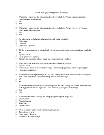 TEST maszyny i urządzenia urabiające. 1. Wiertarka – maszyna do wiercenia otworów w skałach. Przemieszcza się razem z przewodem wiertniczym. a) Tak b) Nie 2. Wiertnica - maszyna do wiercenia otworów w skałach. Posuw roboczy wykonuje tylko przewód wiertniczy. a) Tak b) Nie 3. a) b) c) Do wiercenia w skałach trudno urabialnych służą wiertarki: Obrotowe Udarowe Obrotowo-udarowe 4. Silniki pneumatyczne w wiertarkach obrotowych mają małe zastosowanie ze względu na: a) Wysoki koszt b) Małą sprawność ogólną c) Reakcja od momentu obrotowego nie przenosi się na obudowę 5. a) b) c) Wadą silników hydraulicznych w wiertarkach obrotowych jest: Wysoki koszt Niemożność uzyskania bezstopniowego sterowania prędkością obrotową narzędzia Niska przeciążalność 6. Wiertarka udarowa pneumatyczna ma dwa człony sprzężone mechanicznie realizujące ruch tłoka z bijakiem i ruch obrotowy narzędzia roboczego a) tak b) nie 7. Wiertarka obrotowo - udarowa pneumatyczna ma dwa człony sprzężone mechanicznie realizujące ruch tłoka z bijakiem i ruch obrotowy narzędzia roboczego. a) Tak b) Nie 8. a) b) c) d) Wiertarki obrotowe z uwagi na energię napędową nie mogą być: Elektryczne Pneumatyczne Spalinowe Hydrauliczne 9. a) b) c) Wadą młotków udarowych pneumatycznych jest : Zawodność w pracy Duży hałas i drgania Trudności w konserwacji 10. Obrazek obok przedstawia: a) wiertarkę obrotową ciężką b) wiertnicę dołową c) młot pneumatyczny ciężki 11. Na rysunku obok numerem 4 oznaczono: a) Głowię obrotową wiertarki b) Żerdź wiertniczą c) Bijak młota pneumatycznego 12. Wskaż na rysunku poniżej sposób wiercenia metodą udarową: a) b) c) d) 13. Obrazek poniżej przedstawia: a) Wiertarkę obrotową b) Młotek udarowy pneumatyczny c) Wiertarkę pneumatyczną 14. Dokumentacja techniczno-ruchowa (DTR), zwana również paszportem maszynowym, jest opracowywana dla każdego urządzenia lub maszyny: a) Tak b) Nie 15. Do urządzeń mechanicznych nienaprawialnych zaliczmy: a) Koła zębate b) Łożyska c) Wałki maszynowe 16. Czy naprawa a remont urządzenia to pojęcia tożsame? a) Tak b) Nie 17. Czynności związane z czyszczeniem, smarowaniem, sprawdzaniem stanu technicznego i zabezpieczeniem eksploatacyjnym oraz pozostałe, wchodzące już w zakres obsługi obiektów technicznych nazywamy: a) czyszczeniem b) remontem c) konserwacją 18. Demontaż to czynności związane z rozbiórką maszyn i urządzeń na zespoły, a zespołów na części. Czy niekiedy rozdziela się także połączenia nierozłączne? a) Tak b) Nie 19. Weryfikacja części podczas remontu polega na określeniu ich zużycia oraz podjęciu decyzji co do ich dalszego użytkowania. Czy orzeczenia weryfikacyjne określają zakres remontu? a) Tak b) Nie 20. Badania i odbiór maszyn i urządzeń po remoncie nie umożliwiają sprawdzenia: a) Uzyskanej zdatności użytkowej b) Zgodności zakresu i jakości robót c) Wydajności pracy