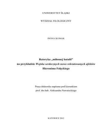 UNIWERSYTET ŚLĄSKI WYDZIAŁ FILOLOGICZNY IWONA SŁOMAK Retoryka „miłosnej batalii” na przykładzie Wojska serdecznych nowo rekrutowanych afektów Hieronima Falęckiego Praca doktorska napisana pod kierunkiem prof. dra hab. Aleksandra Nawareckiego KATOWICE 2012 0 Wstęp Początek złej sławy Wojska serdecznych noworekrutowanych afektów...1 Hieronima Falęckiego historycy literatury polskiej od dawna łączą z pyszną sceną pióra Ignacego Krasickiego: Już był wyciskał talerze i szklanki, Pękły i kufle na łbach hartowanych, Porwał natychmiast księgę zza firanki: Wojsko afektów zarekrutowanych. Nią się zakłada, pędzi poza szranki Rycerzów długą bitwą zmordowanych. Tak niegdyś sławny mocarz Palestyny Oślą paszczęką gromił Filistyny.2 1 Właściwie: Wojsko serdecznych nowo rekrutowanych na większą Chwałę Boską afektów pod Komendą Jaśnie Oświeconego Książęcia de Primis Princibus, bo Michała, w którego imieniu Bóg całej Ojczyzny Honor, Sławę i całość konserwuje, ile Serwacego Korybuta Wiśniowieckiego, Wojewody Wileńskiego, Wielkiego Księstwa Litewskiego Hetmana, ale jeszcze większego przed Bogiem, Niebem i całym Polskim Światem, wysokich zasług, Prerogatyw wodza, ciągnieniem za wyciągnionym na Krzyżu Jezusem, trzema Kolumnami, Wiary, Nadziei, Miłości, idące…. Korzystam z czterech egzemplarzy różnych wydań oznaczonych roboczo jako A (Poczajów 1739, BJ sygn. 71639 II), B (Poczajów 1739, BJ sygn. 71637 II), C (Poczajów 1739, BJ sygn. 71638 II); D (Poznań 1746, BJ sygn. 391218 II). Odwołania w tekście głównym w postaci skrótu: Woj. wraz z numerem stronicy - jeżeli nie zaznaczono inaczej, odsyłają do wydania D. Cytaty z dzieł dawnych zredagowano zgodnie z zasadami przyjętymi dla tekstów typu B (Zasady wydawania tekstów staropolskich. Projekt. Red. M.R. Mayenowa, Z. Florczak. Oprac. J. Woronczak. Wrocław 1955, s. 88-100). Z uwagi na elogijny szyk tekstu Wojska..., w którym partie prozatorskie łączone są z wierszem wolnym, zaznaczam w cytatach granice wersu wszędzie tam, gdzie wydają się one celowe, podając w przypisach ewentualne wahania występujące w pozostałych edycjach – dotyczy to również nagłówków rozdziałów i podrozdziałów (wyjątek stanowi tytuł dzieła), w przypadku których istnieją największe rozbieżności; ich przyczynę upatrywałabym przede wszystkim w braku przejrzystej konceptualizacji stron nagłówkowych wydań poczajowskich, spośród których najkorzystniej prezentuje się wersja C: rozbudowane nagłówki starano się tam umieścić w całości na jednej stronie (tak samo w edycji D). Wyd. D wypada pod względem wizualnego aspektu nagłówków zdecydowanie najlepiej, także dzięki większemu zróżnicowaniu rozmiaru czcionki tytułów i tekstu właściwego. Także niektóre wahania co do granicy wersu w kolejnych wydaniach zdają się wynikać z przyczyn czysto technicznych – zwłaszcza w wyd. A i B, gdzie tekst główny drukowany jest stosunkowo dużą czcionką, niektóre wersy mogły nie mieścić się w granicach marginesu. Zachowuję pisownię wielką literą wyrazów o wybitnym nacechowaniu emocjonalnym, a także w nagłosie wersów wiersza regularnego. W przypadku, gdy zastosowanie majuskuły nie pozwala rozstrzygnąć o pisowni małą lub wielką literą, stosuję dzisiejsze zasady pisowni, chyba że dane słowo w innych miejscach konsekwentnie pisane jest inaczej. Z małymi wyjątkami, nie zaznaczam drobnych różnic stylistycznych w cytatach z wyd. D Wojska... w stosunku do wydań poprzednich, jeśli ich wskazanie nie wniosłoby nic istotnego do przedmiotu rozważań. Nie zachowuję pisowni wyrazów w całości majuskułą, pozostając przy obecnej uwadze, że w tekście oznaczone są tak nagłówki lub ich części; w toku wywodu pracy omawiam wybrane przypadki, gdy majuskuła jest nośnikiem dodatkowego znaczenia lub ma nacechowanie wybitnie emocjonalne. 2 I. Krasicki: Monachomachia. W: Idem: Monachomachia. Antymonachomachia. Wstęp i oprac. Z. Goliński. Wrocław 1969, pieśń V, w. 33-40. 2 Pierwsze, lipskie wydanie Monachomachii (1778) wyszło z objaśnieniami Michała Grölla, wśród których znalazła się także uwaga dotycząca straszliwego oręża ojca Gaudentego: „Jest w rzeczy samej książka pod tym tytułem napisana od jakiegoś karmelity, częścią w prozie, częścią w wierszu. Ta książka nabożna, pełna świątobliwych głupstw, a po części i zgorszenia, osobliwie dla młodzieży warta by była zakazania”3. Krasicki raz jeszcze przywołał tytuł Wojska... w Antymonachomachii, być może w osobie ojca Honoriusza parodiując apologistów dzieła, którzy mogli zabierać głos w trakcie burzliwej debaty wywołanej skandalem towarzyszącym ukazaniu się satyrycznego poematu biskupa warmińskiego4: Nie tylko ludziom i księgom uwłacza Bezbożnik, co się uwziął na zakony Co winien Tostat, że mu nie przebacza? Co winien Alfons, ów król uwielbiony? Zuchwalec śmiało grzeszy i wykracza, Kroniki nawet dotknął zaślepiony Niegodzien czytać piękności dobranych: Wojska afektów zarekrutowanych.5 W ciągu dwu wieków, które upłynęły od pierwszego wydania dzieła Krasickiego, o Wojsku... niemal nie pisano6. Niewielką notkę poświęconą Falęckiemu znajdziemy u Adama Jochera7, w encyklopedii Samuela Orgelbranda8, w bibliografii Karola Estreichera9 i Nowym Korbucie10. Na przestrzeni późniejszych dziesięcioleci badacze literatury i kultury późnego baroku zaledwie wzmiankowali o dziele, niekiedy poświęcając mu nieco więcej uwagi, przy czym większość spostrzeżeń miała charakter ogólnikowy. Ze względu na militarną metaforykę i ośmieszające ujęcie w Monachomachii wspominali o Wojsku... Wacław Borowy11 3 Ibidem, s. 64-65. Zob.: Z. Goliński: Wstęp. W: Ibidem, LXXI-LXXVII. 5 Idem: Antymonachomachia. W: Idem: Monachomachia. Antymonachomachia..., pieśń II, w. 49-56. 6 Poprzednie zestawienie bibliograficz
