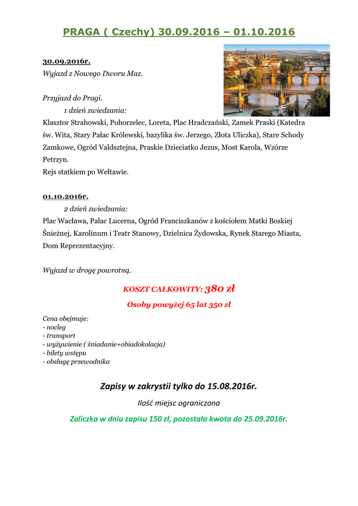 PRAGA ( Czechy) 30.09.2016 – 01.10.2016 30.09.2016r. Wyjazd z Nowego Dworu Maz. Przyjazd do Pragi. 1 dzień zwiedzania: Klasztor Strahowski, Pohorzelec, Loreta, Plac Hradczański, Zamek Praski (Katedra św. Wita, Stary Pałac Królewski, bazylika św. Jerzego, Złota Uliczka), Stare Schody Zamkowe, Ogród Valdsztejna, Praskie Dzieciatko Jezus, Most Karola, Wzórze Petrzyn. Rejs statkiem po Wełtawie. 01.10.2016r. 2 dzień zwiedzania: Plac Wacława, Pałac Lucerna, Ogród Franciszkanów z kościołem Matki Boskiej Śnieżnej, Karolinum i Teatr Stanowy, Dzielnica Żydowska, Rynek Starego Miasta, Dom Reprezentacyjny. Wyjazd w drogę powrotną. KOSZT CAŁKOWITY: 380 zł Osoby powyżej 65 lat 350 zł Cena obejmuje: - nocleg - transport - wyżywienie ( śniadanie+obiadokolacja) - bilety wstępu - obsługę przewodnika Zapisy w zakrystii tylko do 15.08.2016r. Ilość miejsc ograniczona Zaliczka w dniu zapisu 150 zł, pozostała kwota do 25.09.2016r.