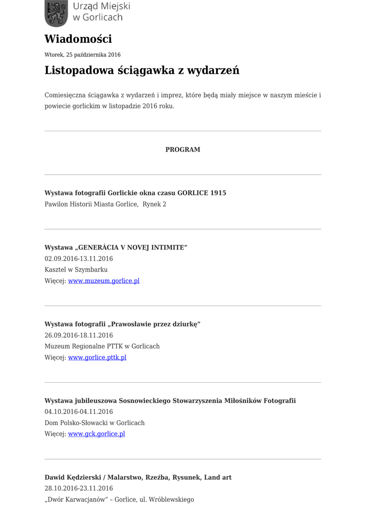 Wiadomości Wtorek, 25 października 2016 Listopadowa ściągawka z wydarzeń Comiesięczna ściągawka z wydarzeń i imprez, które będą miały miejsce w naszym mieście i powiecie gorlickim w listopadzie 2016 roku. PROGRAM Wystawa fotografii Gorlickie okna czasu GORLICE 1915 Pawilon Historii Miasta Gorlice, Rynek 2 Wystawa „GENERÁCIA V NOVEJ INTIMITE” 02.09.2016-13.11.2016 Kasztel w Szymbarku Więcej: www.muzeum.gorlice.pl Wystawa fotografii „Prawosławie przez dziurkę” 26.09.2016-18.11.2016 Muzeum Regionalne PTTK w Gorlicach Więcej: www.gorlice.pttk.pl Wystawa jubileuszowa Sosnowieckiego Stowarzyszenia Miłośników Fotografii 04.10.2016-04.11.2016 Dom Polsko-Słowacki w Gorlicach Więcej: www.gck.gorlice.pl Dawid Kędzierski / Malarstwo, Rzeźba, Rysunek, Land art 28.10.2016-23.11.2016 „Dwór Karwacjanów” – Gorlice, ul. Wróblewskiego Więcej: www.muzeum.gorlice.pl Wystawa malarstwa Jarosława Bauć 28.10.2016-23.11.2016 „Dwór Karwacjanów” – Gorlice, ul. Wróblewskiego Więcej: www.muzeum.gorlice.pl Wystawa malarstwa „Inspiracje II” 28.10.2016-16.11.2016 Pawilon Historii Miasta Gorlice, Dom Polsko-Słowacki w Gorlicach Więcej: www.gorlice.pl Kabaret pod Wyrwigroszem 28.10.2016 godz. 20.00 Kino Farys w Bieczu Więcej: www.biecz.pl III Gorlickie Retrogranie 29.10.2016, godz. 9.00-16.00 Dom Polsko-Słowacki w Gorlicach Więcej: www.gck.gorlice.pl Mecz IV Ligi GKS Glinik Gorlice-Wolania Wola Rzędzińska 29.10.2016, godz. 13.00 Stadion OSiR w Gorlicach Więcej: www.gksglinik.pl Obrzędy i wierzenia na Łemkowszczyźnie 29.10.2016, godz. 18.00 Centrum Kultury im. B.I. Antonycza, P. Dworzysko 5, Gorlice Więcej: www.gorlice.pl Nocny Marsz Pamięci 29.10.2016, godz. 20.00 Smerekowiec-Rotunda Więcej: www.gorlice.pl Rekolekcje filmowe „Ludzie Boga” 30.10.2016, godz. 17.30 Gorlickie Centrum Kultury Więcej: www.terazgorlice.pl Wystawa stała „Sens renesansu” - otwarcie 30.10.2016, godz. 18.00 Kasztel w Szymbarku Więcej: www.muzeum.gorlice.pl Koncert Vince’a Agwady w GCK 03.11.2016, godz. 19.00 Gorlickie Centrum Kultury Więcej: www.gck.gorlice.pl Wędrowniczy Kurs Pierwszej Pomocy “Ratuj Go 2016” 04-06.11.2016, 10-12.11.2016 Zespół Szkół w Szymbarku Więcej: www.gorlice.zhp.pl Liga Pływacka GRAND PRIX Gorlic 2016/2017 05.11.2016, godz. 10.00 Kryta Pływalnia "FALA" Więcej: www.osir.gorlice.pl Spartakiada dla Seniorów 07.11.2016, godz. 9.00 Hala Sportowa OSiR Gorlice Więcej: www.osir.gorlice.pl Wystawa fotografii Barbary Sterzel 08.11.2016-02.12.2016 Dom Polsko-Słowacki w Gorlicach Więcej: www.dompolskoslowacki.eu II Biecki Bieg Służb Mundurowych i nie tylko 11.11.2016, godz. 14.00 Biecz - rynek Więcej: www.biecz.pl 1050-lecie Chrztu Polski i 98. rocznica Odzyskania Niepodległości przez Polskę 11.11.2016, godz. 10.00 Bazylika Mniejsza w Gorlicach Więcej: www.gorlice.pl Mecz IV Ligi GKS Glinik Gorlice-KS Tymbark 12.11.2016, godz. 13.00 Stadion OSiR w Gorlicach Więcej: www.gksglinik.pl Tradycyjne zwyczaje andrzejkowe 14.11.2016-30.11.2016 Skansen Wsi Pogórzańskiej im. prof. Romana Reinfussa w Szymbarku Więcej: www.muzeum.gorlice.pl Gorlice Liga Futsalu 14.11.2016 Hala Sportowa OSiR Gorlice Więcej: www.osir.gorlice.pl Oddaj krew – bądź potrzebny! 15.11.2016, godz. 8.00-12.30 Strzelnica Komendy Powiatowej Policji w Gorlicach Więcej: www.gorlice.pl Warsztaty gitarowe z Arkiem Zawilińskim 15.11.2016-17.11.2016 Gorlickie Centrum Kultury Więcej: www.gck.gorlice.pl Wilno. Barok na siedmiu wzgórzach — slajdowisko i gawęda 17.11.2016, godz. 18.00 Miejska Biblioteka Publiczna w Gorlicach Więcej: www.mbpgorlice.info Koncert "Odcienie Przyjaźni” 17.11.2016, godz. 18.00 Młodzieżowy Dom Kultury w Gorlicach, ul. Cicha 4 Więcej: www.mdk.gorlice.net.pl Szczepienia Przeciwko Nudzie 17.11.2016-18.11.2016 Gorlice Więcej: www.gorlice.pl Koncert oraz Bal Andrzejkowy 19.11.2016, godz. 17.00 Stadnina Koni Huculskich w Regietowie Więcej: www.huculy.com.pl Oratorium "Miłość ponad wszystko" 20.11.2016, godz. 18.00 Bazylika Mniejsza w Gorlicach Więcej: www.gorlice.pl Koncert Andrzeja Rybińskiego 20.11.2016, godz. 18.00 Zespół Szkolno-Przedszkolny w Rożnowicach Więcej: www.roznowice.pl Spektakl "Słodki drań" 21.11.2016, godz. 17.00 Gorlickie Centrum Kultury Więcej: www.gorlice.pl XXXV Jesienny Gorlicki Konkurs Recytatorski 21.11.2016-25.11.2016 Gorlickie Centrum Kultury Więcej: www.gck.gorlice.pl Koncert Edyty Geppert w GCK 27.11.2016, godz. 17.00 Gorlickie Centrum Kultury Więcej: www.gck.gorlice.pl Aktualne informacje o organizowanych w naszym regionie imprezach znajdziecie Państwo w zakładce WYDARZENIA.