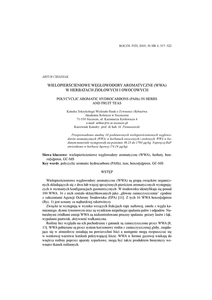 WWA w herbatach zio³owych i ROCZN. owocowych PZH, 2005, 56 NR 4, 317322 317 Nr 4 ARTUR CIEMNIAK WIELOPIERCIENIOWE WÊGLOWODORY AROMATYCZNE (WWA) W HERBATACH ZIO£OWYCH I OWOCOWYCH POLYCYCLIC AROMATIC HYDROCARBONS (PAHs) IN HERBS AND FRUIT TEAS Katedra Toksykologii Wydzia³u Nauk o ¯ywnoci i Rybactwa Akademia Rolnicza w Szczecinie 71-550 Szczecin, ul. Kazimierza Królewicza 4 e-mail: [email protected] Kierownik Katedry: prof. dr hab. M. Protasowicki Przeprowadzono analizê 16 podstawowych wielopiercieniowych wêglowodorów aromatycznych (WWA) w herbatach owocowych i zio³owych. WWA w badanym materiale wystêpowa³y na poziomie 48,23 do 1703 mg/kg. Najwiêcej BaP stwierdzono w herbacie lipowej (74,19 mg/kg). S³owa kluczowe: wielopiercieniowe wêglowodory aromatyczne (WWA), herbaty, benzo[a]piren, GC-MS Key words: polycyclic aromatic hydrocarbons (PAHs), teas, benzo[a]piren, GC-MS WSTÊP Wielopiercieniowe wêglowodory aromatyczne (WWA) s¹ grup¹ zwi¹zków organicznych sk³adaj¹cych siê z dwu lub wiêcej sprzê¿onych piercieni aromatycznych wystêpuj¹cych w rozmaitych konfiguracjach geometrycznych. W rodowisku identyfikuje siê ponad 100 WWA. 16 z nich zosta³o sklasyfikowanych jako g³ówne zanieczyszczenia zgodnie z zaleceniami Agencji Ochrony rodowiska (EPA) [11]. Z tych 16 WWA benzo[a]piren (Ryc. 1) jest uznany za najbardziej rakotwórczy. Zwi¹zki te wystêpuj¹ w wysoko wrz¹cych frakcjach ropy naftowej, smole z wêgla kamiennego, dymie tytoniowym oraz s¹ wynikiem niepe³nego spalania paliw i odpadów. Naturalnymi ród³ami emisji WWA s¹ niekontrolowane procesy spalania: po¿ary lasów i ³¹k, wypalanie pastwisk, aktywnoæ wulkaniczna. Roliny bez wzglêdu na ich pochodzenie i gatunek s¹ zanieczyszczone przez WWA [8, 13]. WWA pobierane s¹ przez system korzeniowy rolin z zanieczyszczonej gleby, znajduj¹ce siê w atmosferze osiadaj¹ na powierzchni lici a nastêpnie mog¹ rozpuszczaæ siê w woskowej warstwie kutikuli pokrywaj¹cej licie. WWA w formie gazowej wnikaj¹ do wnêtrza roliny poprzez aparaty szparkowe, mog¹ byæ tak¿e produktem biosyntezy wewn¹trz tkanek rolinnych. A. Ciemniak 318 Nr 4 $EXQGDQFH P]! %HQ]R>D@S\UHQH Ryc. 1. Widmo masowe i wzór strukturalny benzo[a]pirenu. Mass spectrum and structure of benzo[a]pyrene. Mechanizm procesu oraz drogi przenikania WWA do rolin zale¿¹ od szeregu parametrów fizykochemicznych (masa cz¹steczkowa, rozpuszczalnoæ w wodzie prê¿noæ par, prawo Henryego), warunków rodowiskowych (temperatura, zawartoæ materii organicznej w glebie) oraz gatunku roliny. Znacznie bardziej nara¿one na zanieczyszczenie s¹ roliny maj¹ce du¿¹ powierzchniê lici. Zawartoæ lipidów w tkankach rolinnych ostatecznie okrela iloæ lipofilnych zanieczyszczeñ, jakie rolina jest w stanie zaadsorbowaæ z powietrza [5]. Obserwowane s¹ tak¿e sezonowe zmiany zawartoci WWA w rolinach [8, 1]. W korzeniach obserwowane s¹ przede wszystkim lekkie frakcje WWA (2-4 piercienie) pozosta³e WWA wystêpuj¹ w nadziemnych czêciach rolin, które mog¹ byæ znacz¹cym ród³em WWA dla cz³owieka. MATERIA£ I METODY Z³o¿onoæ matryc organicznych stwarza szereg problemów analitycznych. Zwi¹zki te wystêpuj¹ na poziomie ppb lub ppt, co znacznie utrudnia ich ekstrakcjê. Wiele zwi¹zków organicznych wystêpuj¹cych w ¿ywnoci jest ekstrahowanych wraz z WWA i mo¿e nastêpnie z nimi interferowaæ podczas dalszej analizy. Wiêkszoæ WWA jest strukturalnie podobna i obecna w formach izomerycznych, które utrudniaj¹ ich rozdzielenie i identyfikacjê. Analizie najczêciej poddaje siê kilkanacie najbardziej rozpowszechnionych przedstawicieli WWA, lub tylko benzo[a]piren uznaj¹c go za wêglowodór wskanikowy dla ca³ej grupy zwi¹zków. Pierwsze przybli¿enie daje jednak pe³niejszy obraz ska¿enia ¿ywnoci przez WWA [6, 3]. St¹d te¿ w niniejszej pracy przeprowadzono analizê 16 WWA sklasyfikowanych jako najwa¿niejsze zanieczyszczenia, zgodnie z zaleceniami Agencji Ochrony rodowiska (EPA) [11]. Badaniom poddano 34 rodzaje herbaty zakupione w handlu detalicznym w Szczecinie w 2002 r. Przebadano 4 rodzaje herbaty miêtowej, 5 rumiankowych, 4 z hibiskusa oraz 1 rodzaj herbaty lipowej. Ponadto 12 próbek stanowi³y herbaty owocowe, w sk³ad których wchodzi³y mieszanki ró¿nych Nr 4 WWA w herbatach zio³owych i owocowych 319 zió³ oraz kawa³ków owoców: kwiat hibiskusa, jab³ka, porzeczka, aronia, bez czarny, dzika ró¿a, skórka pomarañczy i cytryny, ananas, kiwi, marakuja. Herbaty owocowe zawiera³y ponadto syntetyczne aromaty identyczne z naturalnymi. Analizie poddano tak¿e 3 rodzaje herbat zielonych oraz 5 rodzajów herbaty czarnej, w tym 1 typu Earl Grey oraz 3 aromatyzowane truskawkowe i malinow¹. WWA z suszu ekstrahowano za pomoc¹ n-heksanu. Do kolby 100 ml odwa¿ano oko³o 5 g herbaty, dodawano 30 ml n-heksanu. W celu uwzglêdnienia stopnia odzysku analizowanych zwi¹zków dodawano roztwór deuterowanych wzorców WWA. Ekstrakcjê przeprowadzano przez 45 minut w ³ani ultradwiêkowej. Próbki odstawiano na 24 godziny. Roztwór znad osadu s¹czono. Do kolby dodawano 20 ml rozpuszczalnika. Kolbê umieszczano ponownie w ³ani ultradwiêkowej na 15 min. Zawartoæ przes¹czano pop³ukuj¹c s¹czek dwiema porcjami po 10 ml n-heksanu. Otrzymany przes¹cz zatê¿ano do 2 ml przy u¿yciu wyparki obrotowej. Ekstrakt nastêpnie oczyszczano wykorzystuj¹c 2 g kolumny z florisilem. Kolumnê kondycjonowano przemywaj¹c j¹ najpierw 6 ml dichlorometanu nastêpnie 12 ml heksanu. Próbkê nanoszono na kolumnê, zu¿ywaj¹c 2 ml heksanu w celu jej przeniesienia ilociowego. Przemywano próbkê 10 ml heksanu. WWA eluowano ze z³o¿a za pomoc¹ 8 ml mieszaniny heksan/dichlorometan w stosunku objêtociowym 3:1. Nastêpnie próbkê zatê¿ano do 1 ml w strumieniu azotu. Rozdzia³ analityczny prób wykonano technik¹ chromatografii gazowej sprzê¿onej ze spektrometrem mas GCMS (HP6899/5973). Oznaczenie analizowanych zwi¹zków wykonano w trybie monitorowania pojedyn