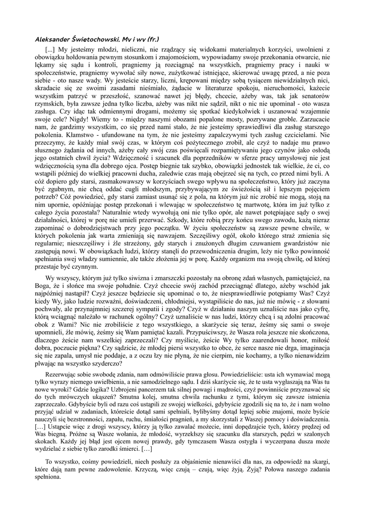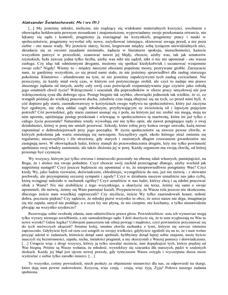 Aleksander Świętochowski, My i wy (fr.) [...] My jesteśmy młodzi, nieliczni, nie rządzący się widokami materialnych korzyści, uwolnieni z obowiązku hołdowania pewnym stosunkom i znajomościom, wypowiadamy swoje przekonania otwarcie, nie lękamy się sądu i kontroli, pragniemy ją rozciągnąć na wszystkich, pragniemy pracy i nauki w społeczeństwie, pragniemy wywołać siły nowe, zużytkować istniejące, skierować uwagę przed, a nie poza siebie - oto nasze wady. Wy jesteście starzy, liczni, krępowani między sobą tysiącem niewidzialnych nici, skradacie się ze swoimi zasadami nieśmiało, żądacie w literaturze spokoju, nieruchomości, każecie wszystkim patrzyć w przeszłość, szanować nawet jej błędy, chcecie, ażeby was, tak jak senatorów rzymskich, była zawsze jedna tylko liczba, ażeby was nikt nie sądził, nikt o nic nie upominał - oto wasza zasługa. Czy idąc tak odmiennymi drogami, możemy się spotkać kiedykolwiek i uszanować wzajemnie swoje cele? Nigdy! Wiemy to - między naszymi obozami popalone mosty, pozrywane groble. Zarzucacie nam, że gardzimy wszystkim, co się przed nami stało, że nie jesteśmy sprawiedliwi dla zasług starszego pokolenia. Kłamstwo - ufundowane na tym, że nie jesteśmy zapalczywymi tych zasług czcicielami. Nie przeczymy, że każdy miał swój czas, w którym coś pożytecznego zrobił, ale czyż to nadaje mu prawo słusznego żądania od innych, ażeby cały swój czas poświęcali rozpamiętywaniu jego czynów jako osłodą jego ostatnich chwil życia? Wdzięczność i szacunek dla poprzedników w sferze pracy umysłowej nie jest wdzięcznością syna dla dobrego ojca. Postęp biegnie tak szybko, obowiązki jednostek tak wielkie, że ci, co wstąpili później do wielkiej pracowni ducha, zaledwie czas mają obejrzeć się na tych, co przed nimi byli. A cóż dopiero gdy starsi, zasmakowawszy w korzyściach swego wpływu na społeczeństwo, który już zaczyna być zgubnym, nie chcą oddać cugli młodszym, przybywającym ze świeżością sił i lepszym pojęciem potrzeb? Cóż powiedzieć, gdy starsi zamiast usunąć się z pola, na którym już nic zrobić nie mogą, stoją na nim upornie, opóźniając postęp przekonań i wlewając w społeczeństwo tę martwotę, która im już tylko z całego życia pozostała? Naturalnie wtedy wywołują oni nie tylko opór, ale nawet potępiające sądy o swej działalności, której w porę nie umieli przerwać. Szkody, które robią przy końcu swego zawodu, każą nieraz zapominać o dobrodziejstwach przy jego początku. W życiu społeczeństw są zawsze pewne chwile, w których pokolenia jak warta zmieniają się nawzajem. Szczęśliwy ogół, około którego straż zmienia się regularnie; nieszczęśliwy i źle strzeżony, gdy starych i znużonych długim czuwaniem gwardzistów nie zastępują nowi. W obowiązkach ludzi, którzy stanęli do przewodniczenia drugim, leży nie tylko powinność spełniania swej władzy sumiennie, ale także złożenia jej w porę. Każdy organizm ma swoją chwilę, od której przestaje być czynnym. Wy wszyscy, którym już tylko siwizna i zmarszczki pozostały na obronę zdań własnych, pamiętajcież, na Boga, że i słońce ma swoje południe. Czyż chcecie swój zachód przeciągnąć dlatego, ażeby wschód jak najpóźniej nastąpił? Czyż jeszcze będziecie się upominać o to, że niesprawiedliwie potępiamy Was? Czyż kiedy Wy, jako ludzie rozważni, doświadczeni, chłodniejsi, wystąpiliście do nas, już nie mówię - z słowami pochwały, ale przynajmniej szczerej sympatii i zgody? Czyż w działaniu naszym uznaliście nas jako cyfrę, którą wciągnąć należało w rachunek ogólny? Czyż uznaliście w nas ludzi, którzy chcą i są zdolni pracować obok z Wami? Nic nie zrobiliście z tego wszystkiego, a skarżycie się teraz, żeśmy się sami o swoje upomnieli, źle mówię, żeśmy się Wam pamiętać kazali. Przypuściwszy, że Wasza rola jeszcze nie skończona, dlaczego żeście nam wszelkiej zaprzeczali? Czy myślicie, żeście Wy tylko zaarendowali honor, miłość dobra, poczucie piękna? Czy sądzicie, że młodej piersi wszystko to obce, że serce nasze nie drga, imaginacja się nie zapala, umysł nie poddaje, a z oczu łzy nie płyną, że nie cierpim, nie kochamy, a tylko nienawidzim plwając na wszystko szyderczo? Rezerwując sobie swobodę zdania, nam odmówiliście prawa głosu. Powiedzieliście: usta ich wymawiać mogą tylko wyrazy niemego uwielbienia, a nie samodzielnego sądu. I dziś skarżycie się, że te usta wygłaszają na Was tu nowe wyroki? Gdzie logika? Uzbrojeni pancerzem tak silnej powagi i mądrości, czyż powinniście przyznawać się do tych mrówczych ukąszeń? Smutna kolej, smutna chwila rachunku z tymi, którym się zawsze istnienia zaprzeczało. Gdybyście byli od razu coś ustąpili ze swojej wielkości, gdybyście zgodzili się na to, że i nam wolno przyjąć udział w zadaniach, któreście dotąd sami spełniali, bylibyśmy dotąd lepiej sobie znajomi, może byście nauczyli się bezstronności, zapału, ruchu, śmiałości pragnień, a my skorzystali z Waszej pomocy i doświadczenia. […] Ustąpcie więc z drogi wszyscy, którzy ją tylko zawalać możecie, inni dopędzajcie tych, którzy prędzej od Was biegną. Próżne są Wasze wołania, że młodość, wyrzekłszy się szacunku dla starszych, pędzi w szalonych skokach. Każdy jej błąd jest ojcem nowej prawdy, gdy tymczasem Wasza ostygła i wyczerpana dusza może wydzielać z siebie tylko zarodki śmierci. […] To wszystko, cośmy powiedzieli, niech posłuży za objaśnienie nienawiści dla nas, za odpowiedź na skargi, które dają nam pewne zadowolenie. Krzyczą, więc czują – czują, więc żyją. Żyją? Połowa naszego zadania spełniona.