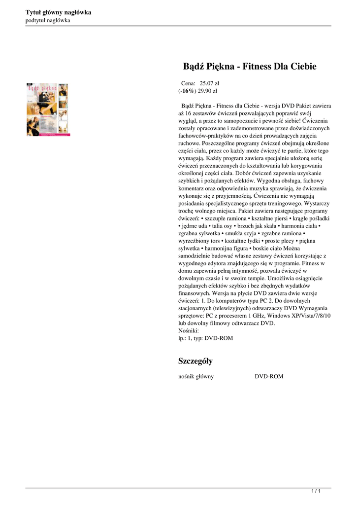 Tytuł główny nagłówka podtytuł nagłówka Bądź Piękna - Fitness Dla Ciebie Cena: 25.07 zł (-16%) 29.90 zł Bądź Piękna - Fitness dla Ciebie - wersja DVD Pakiet zawiera aż 16 zestawów ćwiczeń pozwalających poprawić swój wygląd, a przez to samopoczucie i pewność siebie! Ćwiczenia zostały opracowane i zademonstrowane przez doświadczonych fachowców-praktyków na co dzień prowadzących zajęcia ruchowe. Poszczególne programy ćwiczeń obejmują określone części ciała, przez co każdy może ćwiczyć te partie, które tego wymagają. Każdy program zawiera specjalnie ułożoną serię ćwiczeń przeznaczonych do kształtowania lub korygowania określonej części ciała. Dobór ćwiczeń zapewnia uzyskanie szybkich i pożądanych efektów. Wygodna obsługa, fachowy komentarz oraz odpowiednia muzyka sprawiają, że ćwiczenia wykonuje się z przyjemnością. Ćwiczenia nie wymagają posiadania specjalistycznego sprzętu treningowego. Wystarczy trochę wolnego miejsca. Pakiet zawiera następujące programy ćwiczeń: • szczupłe ramiona • kształtne piersi • krągłe pośladki • jędrne uda • talia osy • brzuch jak skała • harmonia ciała • zgrabna sylwetka • smukła szyja • zgrabne ramiona • wyrzeźbiony tors • kształtne łydki • proste plecy • piękna sylwetka • harmonijna figura • boskie ciało Można samodzielnie budować własne zestawy ćwiczeń korzystając z wygodnego edytora znajdującego się w programie. Fitness w domu zapewnia pełną intymność, pozwala ćwiczyć w dowolnym czasie i w swoim tempie. Umożliwia osiągnięcie pożądanych efektów szybko i bez zbędnych wydatków finansowych. Wersja na płycie DVD zawiera dwie wersje ćwiczeń: 1. Do komputerów typu PC 2. Do dowolnych stacjonarnych (telewizyjnych) odtwarzaczy DVD Wymagania sprzętowe: PC z procesorem 1 GHz, Windows XP/Vista/7/8/10 lub dowolny filmowy odtwarzacz DVD. Nośniki: lp.: 1, typ: DVD-ROM Szczegóły nośnik główny DVD-ROM 1/1 Powered by TCPDF (www.tcpdf.org)
