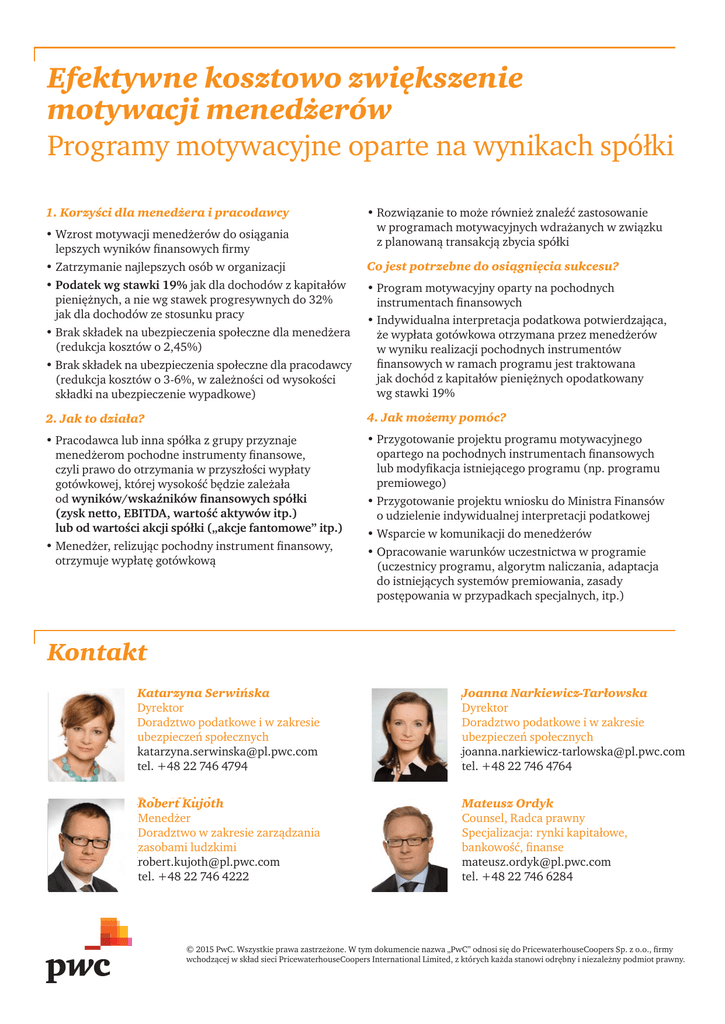 Efektywne kosztowo zwiększenie motywacji menedżerów Programy motywacyjne oparte na wynikach spółki 1. Korzyści dla menedżera i pracodawcy • Wzrost motywacji menedżerów do osiągania lepszych wyników finansowych firmy • Zatrzymanie najlepszych osób w organizacji • Podatek wg stawki 19% jak dla dochodów z kapitałów pieniężnych, a nie wg stawek progresywnych do 32% jak dla dochodów ze stosunku pracy • Brak składek na ubezpieczenia społeczne dla menedżera (redukcja kosztów o 2,45%) • Brak składek na ubezpieczenia społeczne dla pracodawcy (redukcja kosztów o 3-6%, w zależności od wysokości składki na ubezpieczenie wypadkowe) • Rozwiązanie to może również znaleźć zastosowanie w programach motywacyjnych wdrażanych w związku z planowaną transakcją zbycia spółki Co jest potrzebne do osiągnięcia sukcesu? • Program motywacyjny oparty na pochodnych instrumentach finansowych • Indywidualna interpretacja podatkowa potwierdzająca, że wypłata gotówkowa otrzymana przez menedżerów w wyniku realizacji pochodnych instrumentów finansowych w ramach programu jest traktowana jak dochód z kapitałów pieniężnych opodatkowany wg stawki 19% 2. Jak to działa? 4. Jak możemy pomóc? • Pracodawca lub inna spółka z grupy przyznaje menedżerom pochodne instrumenty finansowe, czyli prawo do otrzymania w przyszłości wypłaty gotówkowej, której wysokość będzie zależała od wyników/wskaźników finansowych spółki (zysk netto, EBITDA, wartość aktywów itp.) lub od wartości akcji spółki („akcje fantomowe” itp.) • Menedżer, relizując pochodny instrument finansowy, otrzymuje wypłatę gotówkową • Przygotowanie projektu programu motywacyjnego opartego na pochodnych instrumentach finansowych lub modyfikacja istniejącego programu (np. programu premiowego) • Przygotowanie projektu wniosku do Ministra Finansów o udzielenie indywidualnej interpretacji podatkowej • Wsparcie w komunikacji do menedżerów • Opracowanie warunków uczestnictwa w programie (uczestnicy programu, algorytm naliczania, adaptacja do istniejących systemów premiowania, zasady postępowania w przypadkach specjalnych, itp.) Kontakt Katarzyna Serwińska Katarzyna Serwińska Dyrektor Dyrektor Doradztwo podatkowe i wi zakresie Doradztwo podatkowe w zakresie ubezpieczeń społecznych ubezpieczeń społecznych [email protected] [email protected] tel. (22) 47944794 tel. +48746 22 746 JoannaNarkiewicz-Tarłowska Narkiewicz-Tarłowska Joanna Dyrektor Starszy Menedżer Doradztwo i wi zakresie Doradztwopodatkowe podatkowe w zakresie ubezpieczeń ubezpieczeńspołecznych społecznych [email protected] [email protected] tel. tel.(22) +48746 22 4764 746 4764 Robert RobertKujoth Kujoth Menedżer Menedżer Doradztwo w zakresie zarządzania Doradztwo w zakresie zarządzania zasobami ludzkimi zasobami ludzkimi [email protected] [email protected] tel. (22) 746 7222 MateuszOrdyk Ordyk Mateusz Counsel,Radca Radcaprawny prawny Counsel, Specjalizacja:rynki rynki kapitałowe, Specjalizacja: kapitałowe, bankowość, bankowość,finanse finanse [email protected] [email protected] tel. tel. (22) +48746 22 6284 746 6284 tel. +48 22 746 4222 © 2015 PwC. Wszystkie prawa zastrzeżone. W tym dokumencie nazwa „PwC” odnosi się do PricewaterhouseCoopers Sp. z o.o., firmy wchodzącej w skład sieci PricewaterhouseCoopers International z których każda odrębny i niezależnySp. podmiot © 2015 PwC. Wszystkie prawa zastrzeżone. W tym dokumencieLimited, nazwa „PwC” odnosi się stanowi do PricewaterhouseCoopers z o.o.,prawny. firmy wchodzącej w skład sieci PricewaterhouseCoopers International Limited, z których każda stanowi odrębny i niezależny podmiot prawny.