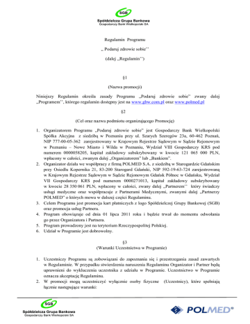 Regulamin Programu ,, Podaruj zdrowie sobie’’ (dalej ,,Regulamin’’) §1 (Nazwa promocji) Niniejszy Regulamin określa zasady Programu „Podaruj zdrowie sobie” zwany dalej ,,Programem’’, którego regulamin dostępny jest na www.gbw.com.pl oraz www.polmed.pl §2 (Cel oraz nazwa podmiotu organizującego Promocję) 1. Organizatorem Programu „Podaruj zdrowie sobie” jest Gospodarczy Bank Wielkopolski Spółka Akcyjna z siedzibą w Poznaniu przy ul. Szarych Szeregów 23a, 60-462 Poznań, NIP 777-00-05-362 zarejestrowany w Krajowym Rejestrze Sądowym w Sądzie Rejonowym w Poznaniu – Nowe Miasto i Wilda w Poznaniu, Wydział VIII Gospodarczy KRS pod numerem 0000058205, kapitał zakładowy subskrybowany w kwocie 121 065 000 PLN, wpłacony w całości, zwanym dalej „Organizatorem” lub „Bankiem”. 2. Organizator działa we współpracy z firmą POLMED S.A. z siedzibą w Starogardzie Gdańskim przy Osiedlu Kopernika 21, 83-200 Starogard Gdański, NIP 592-19-63-724 zarejestrowaną w Krajowym Rejestrze Sądowym w Sądzie Rejonowym Gdańsk Północ w Gdańsku, Wydział VII Gospodarczy KRS pod numerem 0000271013, kapitał zakładowy subskrybowany w kwocie 28 350 061 PLN, wpłacony w całości, zwany dalej ,,Partnerem’’ który świadczy usługi medyczne oraz współpracuje z Partnerami Medycznymi, zwanymi dalej „Partnerzy POLMED” o których mowa w dalszej części Regulaminu. 3. Celem Programu jest promocja kart płatniczych z logo Spółdzielczej Grupy Bankowej (SGB) oraz promocja usług Partnera. 4. Program obowiązuje od dnia 01 lipca 2011 roku i będzie trwał do momentu odwołania go przez Organizatora i Partnera. 5. Program prowadzony jest na terytorium Rzeczypospolitej Polskiej. 6. Udział w Programie jest dobrowolny. §3 (Warunki Uczestnictwa w Programie) 1. Uczestniczy Programu są zobowiązani do zapoznania się i przestrzegania zasad zawartych w Regulaminie. W przypadku stwierdzenia naruszenia Regulaminu Organizator i Partner będą uprawnieni do wykluczenia uczestnika z udziału w Programie. Uczestnictwo w Programie oznacza akceptację Regulaminu. 2. W promocji mogą uczestniczyć wyłącznie osoby fizyczne (Uczestnicy), które spełniają łącznie następujące warunki: a. są posiadaczami legalnymi kart płatniczych Spółdzielczej Grupy Bankowej, zwanych dalej kartami SGB, b. korzystają z kart SGB zgodnie z umową dotyczącą karty płatniczej w Gospodarczym Banku Wielkopolski S.A., c. zamieszkują na terytorium Rzeczypospolitej Polskiej, d. są konsumentami w rozumieniu art. 22 Kodeksu Cywilnego. 3. Warunkiem otrzymania rabatu na usługi medyczne jest: a. Zarejestrowanie wizyty w wybranym własnym Centrum Medycznym POLMED poprzez infolinię POLMED i bezpośredni kontakt z Recepcją Centrum POLMED lub u Partnerów POLMED poprzez bezpośredni kontakt z danym Partnerem, b. Okazanie w recepcji w momencie przyjęcia na wizytę karty płatniczej Spółdzielczej Grupy Bankowej z logo SGB. 4. Wykaz Centrów Medycznych Partnera oraz placówki Partnerów POLMED stanowią Załącznik nr 1 do niniejszego Regulaminu. 5. Na żądanie pracownika placówki Partnera oraz Partnerów POLMED Uczestnik powinien wykazać poprzez okazanie dowodu tożsamości, iż jest legalnym posiadaczem karty płatniczej Spółdzielczej Karty Płatniczej (SGB), dzięki której naliczony zostanie rabat na usługę medyczną od ceny normalnie stosowanej. 6. Uczestnicy nie mogą przenieść prawa do rabatu na osoby trzecie. 7. W przypadku zaistnienia jakichkolwiek wątpliwości czy Uczestnik spełnił wszystkie warunki do otrzymania rabatu na usługi medyczne zawarte w Regulaminie, Partner ma prawo wstrzymać się z rabatowaniem usługi medycznej do czasu ich wyjaśnienia przez Partnera oraz Organizatora. 8. W razie wątpliwości, o prawie do udziału w Programie decyduje powołana przez Organizatora komisja czuwająca nad prawidłowym przebiegiem Programu (dalej ,,Komisja’’), złożona z trzech przedstawicieli wskazanych przez Organizatora. §4 (Rabat na usługi) 1. Rabatem dla Uczestników są niższe opłaty na usługi medyczne świadczone przez Partnera oraz Partnerów POLMED: a. 30% rabatu na usługi medyczne w Centrach Medycznych Partnera, b. 15% rabatu na usługi medyczne u Partnerów POLMED, 2. W chwili rozpoczęcia Programu rabat obejmuje usługi wskazane w Załączniku nr 2 do Regulaminu. 3. Organizator nie ponosi odpowiedzialności za usługi medyczne świadczone przez Partnera oraz Partnerów POLMED. 4. Partner oświadcza, że posiada niezbędne uprawnienia do udzielania świadczeń zdrowotnych określonych w Załączniku nr 2. 5. Partner oświadcza, że jego Partnerzy Medyczni – zgodnie z posiadanymi między stronami umowami – posiadają niezbędne uprawnienia do udzielania świadczeń zdrowotnych, znajdujących się w ich ofercie. 6. Organizator nie ponosi odpowiedzialności za brak możliwości udziału w Programie z przyczyn leżących po stronie Uczestnika i ewentualne szkody z tego wynikłe. §5 (Reklamacje) 1. Reklamacja może być zgłoszona przez Uczestnika pisemnie, poprzez list wysłany na adres korespondencyjny Banku. 2. Reklamacja jest rozpatrywana niezwłocznie, jednakże termin może ulec przedłużeniu z przyczyn niezależnych od Banku. 3. Klient zostanie poinformowany o przedłużającym się ponad 30 dni roboczych terminie rozpatrywania reklamacji. §6 (Postanowienia końcowe) 1. Regulamin wraz z załącznikami dostępny jest w siedzibie Organizatora, w Centrum Telefonicznym Organizatora oraz Partnera, w oddziałach Organizatora i na stronie internetowej www.gbw.com.pl oraz www.polmed.pl . 2. Wszelkie informacje o Programie dostępne w materiałach reklamowo – promocyjnych, mają jedynie charakter informacyjny. 3. Organizator oraz Partner zastrzegają sobie prawo wprowadzenia zmian w Regulaminie, w każdym czasie bez podania przyczyny. Zmiany w Regulaminie nie mogą jednak naruszać praw nabytych Uczestników. 4. Wprowadzane zmiany w Regulaminie oraz za