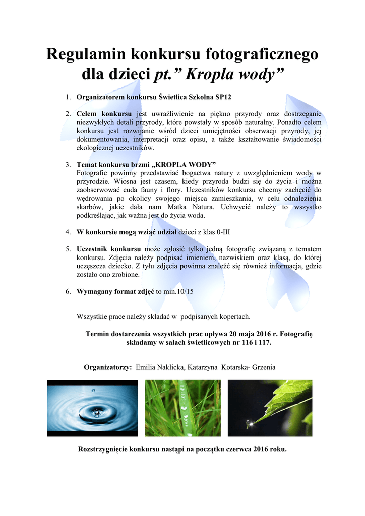 Regulamin konkursu fotograficznego dla dzieci pt.” Kropla wody” 1. Organizatorem konkursu Świetlica Szkolna SP12 2. Celem konkursu jest uwrażliwienie na piękno przyrody oraz dostrzeganie niezwykłych detali przyrody, które powstały w sposób naturalny. Ponadto celem konkursu jest rozwijanie wśród dzieci umiejętności obserwacji przyrody, jej dokumentowania, interpretacji oraz opisu, a także kształtowanie świadomości ekologicznej uczestników. 3. Temat konkursu brzmi „KROPLA WODY” Fotografie powinny przedstawiać bogactwa natury z uwzględnieniem wody w przyrodzie. Wiosna jest czasem, kiedy przyroda budzi się do życia i można zaobserwować cuda fauny i flory. Uczestników konkursu chcemy zachęcić do wędrowania po okolicy swojego miejsca zamieszkania, w celu odnalezienia skarbów, jakie dała nam Matka Natura. Uchwycić należy to wszystko podkreślając, jak ważna jest do życia woda. 4. W konkursie mogą wziąć udział dzieci z klas 0-III 5. Uczestnik konkursu może zgłosić tylko jedną fotografię związaną z tematem konkursu. Zdjęcia należy podpisać imieniem, nazwiskiem oraz klasą, do której uczęszcza dziecko. Z tyłu zdjęcia powinna znaleźć się również informacja, gdzie zostało ono zrobione. 6. Wymagany format zdjęć to min.10/15 Wszystkie prace należy składać w podpisanych kopertach. Termin dostarczenia wszystkich prac upływa 20 maja 2016 r. Fotografię składamy w salach świetlicowych nr 116 i 117. Organizatorzy: Emilia Naklicka, Katarzyna Kotarska- Grzenia Rozstrzygnięcie konkursu nastąpi na początku czerwca 2016 roku.