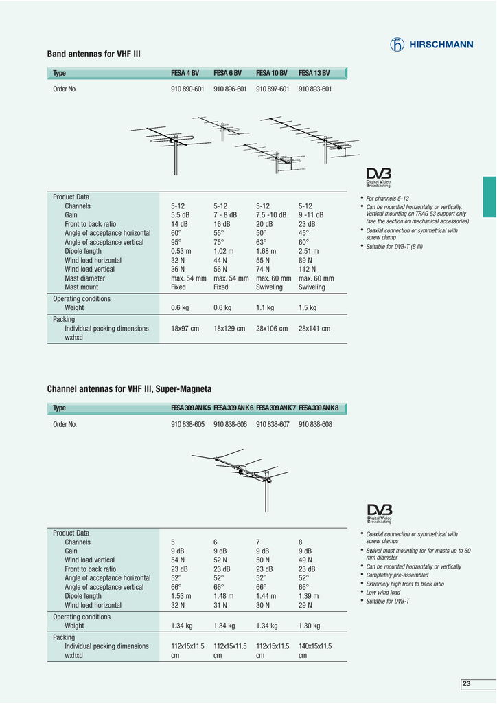 Band antennas for VHF III Type FESA 4 BV FESA 6 BV FESA 10 BV FESA 13 BV Order No. 910 890-601 910 896-601 910 897-601 910 893-601 Product Data Channels Gain Front to back ratio Angle of acceptance horizontal Angle of acceptance vertical Dipole length Wind load horizontal Wind load vertical Mast diameter Mast mount 5-12 5.5 dB 14 dB 60° 95° 0.53 m 32 N 36 N max. 54 mm Fixed 5-12 7 - 8 dB 16 dB 55° 75° 1.02 m 44 N 56 N max. 54 mm Fixed 5-12 7.5 -10 dB 20 dB 50° 63° 1.68 m 55 N 74 N max. 60 mm Swiveling 5-12 9 -11 dB 23 dB 45° 60° 2.51 m 89 N 112 N max. 60 mm Swiveling Operating conditions Weight 0.6 kg 0.6 kg 1.1 kg 1.5 kg 18x97 cm 18x129 cm 28x106 cm 28x141 cm Packing Individual packing dimensions wxhxd i For channels 5-12 i Can be mounted horizontally or vertically. Vertical mounting on TRAG 53 support only (see the section on mechanical accessories) i Coaxial connection or symmetrical with screw clamp i Suitable for DVB-T (B III) Channel antennas for VHF III, Super-Magneta Type FESA 309 AN K 5 FESA 309 AN K 6 FESA 309 AN K 7 FESA 309 AN K 8 Order No. 910 838-605 910 838-606 910 838-607 910 838-608 Product Data Channels Gain Wind load vertical Front to back ratio Angle of acceptance horizontal Angle of acceptance vertical Dipole length Wind load horizontal 5 9 dB 54 N 23 dB 52° 66° 1.53 m 32 N 6 9 dB 52 N 23 dB 52° 66° 1.48 m 31 N 7 9 dB 50 N 23 dB 52° 66° 1.44 m 30 N 8 9 dB 49 N 23 dB 52° 66° 1.39 m 29 N Operating conditions Weight 1.34 kg 1.34 kg 1.34 kg 1.30 kg Packing Individual packing dimensions wxhxd 112x15x11.5 cm 112x15x11.5 cm 112x15x11.5 cm 140x15x11.5 cm i Coaxial connection or symmetrical with screw clamps i Swivel mast mounting for for masts up to 60 mm diameter i Can be mounted horizontally or vertically i Completely pre-assembled i Extremely high front to back ratio i Low wind load i Suitable for DVB-T 23