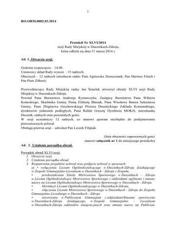 1 RO.ORM.0002.03.2014 Protokół Nr XLVI/2014 sesji Rady Miejskiej w Dusznikach-Zdroju, która odbyła się dnia 31 marca 2014 r. Ad. 1. Otwarcie sesji. Godzina rozpoczęcia – 14.00. Ustawowy skład Rady wynosi – 15 radnych. Obecnych – 12 radnych (nieobecni radni; Pani Agnieszka Ziemczonek, Pan Mariusz Fituch i Pan Piotr Zilbert). Przewodniczący Rady Miejskiej radny Jan Śmielak otworzył obrady XLVI sesji Rady Miejskiej w Dusznikach-Zdroju. Powitał Pana Burmistrza Andrzeja Rymarczyka, Zastępcę Burmistrza Pana Wiktora Kotarskiego, Skarbnika Gminy Panią Elżbietę Błasiak, Pana Wiesława Batora Sekretarza Gminy, Pana Zbigniewa Grochowskiego Prezesa Dusznickiego Zakładu Komunalnego, dyrektorów jednostek podległych, Pana Rafała Gresztę Dyrektora MOKiS, mieszkankę Dusznik, radnych oraz pozostałych gości. W sesji uczestniczy 12 radnych, co stanowi quorum niezbędne do podejmowania prawomocnych uchwał. Obsługa prawna sesji – adwokat Pan Leszek Filipiak. (lista obecności zaproszonych gości stanowi załącznik nr 1 do niniejszego protokołu) Ad. 2. Ustalenie porządku obrad. Porządek obrad XLVI sesji: 1. Otwarcie sesji. 2. Ustalenie porządku obrad. 3. Rozpatrzenie projektów uchwał oraz podjęcie uchwał w sprawach: a) • wyłączenia Liceum Ogólnokształcącego w Dusznikach-Zdroju działającego w Zespole Gimnazjalno-Licealnym w Dusznikach - Zdroju z Zespołu, • przekształcenia Szkoły Mistrzostwa Sportowego w Dusznikach – Zdroju w Liceum Ogólnokształcące Mistrzostwa Sportowego z oddziałami ogólnymi i zmiany nazwy na Liceum Ogólnokształcące Mistrzostwa Sportowego w Dusznikach - Zdroju. • likwidacji Liceum Ogólnokształcącego w Dusznikach-Zdroju, • włączenia Liceum Mistrzostwa Sportowego w Dusznikach - Zdroju do Zespołu Gimnazjalno-Licealnego w Dusznikach - Zdroju • utworzenia w Publicznym Gimnazjum z oddziałami/klasami sportowymi w Dusznikach-Zdroju działającego w Zespole Gimnazjalno – Licealnym w Dusznikach-Zdroju oddziałów integracyjnych oraz zmiany nazwy na Publiczne 2 Gimnazjum z oddziałami integracyjnymi, oddziałami sportowymi w Dusznikach Zdroju, • utworzenia w Szkole Podstawowej z oddziałami integracyjnymi im B. Czecha i H. Marusarzówny w Dusznikach - Zdroju oddziałów sportowych i zmiany nazwy na Szkoła Podstawowa z oddziałami integracyjnymi, oddziałami sportowymi im B. Czecha i H. Marusarzówny w Dusznikach – Zdroju, • włączenia do Zespołu Gimnazjalno-Licealnego w Dusznikach - Zdroju Szkoły Podstawowej z oddziałami integracyjnymi, oddziałami sportowymi im B. Czecha i H. Marusarzówny w Dusznikach - Zdroju, • zmiany nazwy Zespołu Gimnazjalno-Licealnego w Dusznikach – Zdroju na Miejski Zespół Szkół w Dusznikach – Zdroju w którego skład wchodzą: 1. Szkoła Podstawowa z oddziałami integracyjnymi, oddziałami sportowymi im B. Czecha i H. Marusarzówny w Dusznikach – Zdroju, 2. Publiczne Gimnazjum z oddziałami integracyjnymi, oddziałami sportowymi w Dusznikach – Zdroju, 3. Liceum Ogólnokształcące Mistrzostwa Sportowego w Dusznikach – Zdroju, b) uchwalenia miejscowego planu zagospodarowania przestrzennego miasta Duszniki-Zdrój dla obszaru strefy ochrony uzdrowiskowej „A”, c) przystąpienia do sporządzenia zmiany miejscowego planu zagospodarowania przestrzennego terenów usług turystyki, usług sportu i rekreacji oraz zabudowy mieszkaniowej w Dusznikach-Zdroju, obręb Zieleniec AM-2, AM-3, AM-4, d) uchwalenia Statutu Miasta Duszniki-Zdrój, e) udzielenia pomocy finansowej dla Muzeum Papiernictwa w Dusznikach-Zdroju na realizację zadania pn. Popularyzowanie i promowanie Dusznik-Zdroju: XIV edycja Święta Papieru oraz VIII tom Rocznika Muzeum Papiernictwa, f) wprowadzenia zmian w budżecie gminy Duszniki-Zdrój na rok 2014, g) programu opieki nad zwierzętami bezdomnymi oraz zapobiegania bezdomności zwierząt na terenie Gminy Duszniki-Zdrój w 2014 roku. 4. Sprawozdanie z prac Burmistrza Miasta Duszniki-Zdrój za okres od 17 lutego 2014 do 17 marca 2014 roku. 5. Przyjęcie protokołu z XLV sesji z dnia 27 lutego 2014 r. 6. Interpelacje i pytania radnych, sprawy różne. 7. Zamknięcie obrad XLVI sesji Rady Miejskiej w Dusznikach-Zdroju. (załącznik nr 2) Brak uwag i propozycji do przedstawionego porządku obrad. Porządek obrad został przyjęty. O godz. 14.10 przyszedł radny P. Piotr Zilbert. Obecnych – 13 radnych. Ad. 3. Rozpatrzenie projektów uchwał oraz podjęcie uchwał w sprawach: a) głosowanie nad projektem uchwały w sprawie • wyłączenia Liceum Ogólnokształcącego w Dusznikach-Zdroju działającego w Zespole Gimnazjalno-Licealnym w Dusznikach Zdroju z Zespołu, • przekształcenia Szkoły Mistrzostwa Sportowego w Dusznikach – Zdroju w Liceum Ogólnokształcące Mistrzostwa Sportowego z oddziałami ogólnymi i zmiany nazwy na Liceum Ogólnokształcące Mistrzostwa Sportowego w Dusznikach - Zdroju. • likwidacji Liceum Ogólnokształcącego w Dusznikach-Zdroju, 3 • włączenia Liceum Mistrzostwa Sportowego w Dusznikach - Zdroju do Zespołu Gimnazjalno-Licealnego w Dusznikach - Zdroju • utworzenia w Publicznym Gimnazjum z oddziałami/klasami sportowymi w Dusznikach-Zdroju działającego w Zespole Gimnazjalno – Licealnym w DusznikachZdroju oddziałów integracyjnych oraz zmiany nazwy na Publiczne Gimnazjum z oddziałami integracyjnymi, oddziałami sportowymi w Dusznikach - Zdroju, • utworzenia w Szkole Podstawowej z oddziałami integracyjnymi im B. Czecha i H. Marusarzówny w Dusznikach - Zdroju oddziałów sportowych i zmiany nazwy na Szkoła Podstawowa z oddziałami integracyjnymi, oddziałami sportowymi im B. Czecha i H. Marusarzówny w Dusznikach – Zdroju, • włączenia do Zespołu Gimnazjalno-Licealnego w Dusznikach - Zdroju Szkoły Podstawowej z oddziałami integracyjnymi, oddziałami sportowymi im B. Czecha i H. Marusarzówny w Dusznikach - Zdroju, • zmiany nazwy Zespołu Gimnazjalno-Licealnego w Dusznikach – Zdroju na Miejski Zespół 