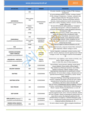 2015 www.alanyawycieczki.pl WYCIECZKA CENA TERMIN 49€ KAPADOCJA ( z polskim przewodnikiem) 2 dni Pełny pakiet 75€ PONIEDZIAŁEK PIĄTEK Pakiet All Inclusive 99€ uwagi 29€ PAMUKKALE (z polskim przewodnikiem) Pełny pakiet 47€ PONIEDZIAŁEK CZWARTEK NIEDZIELA uwagi KAS (z polskim przewodnikiem) PROGRAM W cenie: transfer, nocleg w hotelu 4*HB z kolacją i śniadaniem W cenie pełnego pakietu: transfer, nocleg w hotelu 4*HB z kolacją i śniadaniem, 2 obiady- szwedzki stół, bilety wstępów (Klasztor Wirujących Derwiszy (Mevlana) w Konyi, Muzeum kościołów skalnych Goreme, miasto podziemne Saratli, karawanseraj, skalny dom, doliny: Pasabag, Uchisar, Cavusin, Goreme, Gołębi, skalne zoo W cenie All Inclusive: pełny pakiet jw.+ śniadanie pierwszego dnia gratis! + Wieczór Kapadocki All Inclusive w kutej grocie z show wirujących derwiszy Lot balonem 140€ WAŻNE: Przy rezerwacji z Polski: pełny pakiet 72€, pakiet All Inclusive 95€, lot balonem 130€ Wapienne tarasy Pamukkale, starożytne miasto Hierapolis i Necropolis. Cena obejmuje transfer. W cenie pełnego pakietu: bilety wstępów do ww. obiektów, obiad (szwedzki stół z kebabami) i kolacja w restauracji po trasie. Dla chętnych kąpiel w basenie Kleopatry ok.12€ 30€ ŚRODA NIEDZIELA Wodospady Kursunlu, antyczne miasto Side, starożytny teatr Aspendos. Obiad i wstępy w cenie. KANION SAPADERE I WIEŚ TURECKA (z polskim przewodnikiem) 25€ WTOREK SOBOTA Kanion Sapadere, wodospad, wioska turecka, dom turecki, meczet, plantacje owoców egzotycznych. Obiad i wstępy w cenie. Dla chętnych Jaskinia Krasnoludków 3€ AQUARIUM + ANTALYA (z polskim przewodnikiem) 55€ ŚRODA SOBOTA Oceanarium, rejs statkiem, stare miasto w Antalyi, czas wolny. Obiad i wstępy w cenie. Dzieci 3-12lat 45€, dzieci 0-2lata bezpłatnie. HAMAM 15€ CODZIENNIE ZIELONY KANION 40€ CODZIENNIE RAFTING 18€ CODZIENNIE RAFTING EXTRA 39€ CODZIENNIE REJS PIRACKI 18€ CODZIENNIE JEEP SAFARI 18€ CODZIENNIE MINI ALANYA (jeepem)*** (z polskim przewodnikiem) 10€ CODZIENNIE po południu DEMRE-MYRA-KEKOVA (z polskim przewodnikiem) 35€ CZWARTEK Sauna fińska, sauna parowa, peeling, masaż pianą, masaż olejkami, bicze wodne, błotna kąpiel. Rejs statkiem po Zielonym kanionie, tama 185m, kąpiele w kanionie. Obiad i wstępy w cenie. Spływ górską rzeką Koprulu na pontonach w Parku Narodowym. W cenie obiad, wstępy, ubezpieczenie od sportów ekstremalnych, instruktorzy, sprzęt: wiosła, kaski, kapoki. Połączenie Raftingu, kanyoningu (przeprawa przez kanion) i zipplingu (przejazd na linie).W cenie: obiad, ubezpieczenie od sportów ekstremalnych, sprzęt, instruktorzy. Od 10 lat. Dzieci 10-12lat 20€. Rejs po morzu 3-pokładowym dużym statkiem. Jaskinia Piratów, Fosforyzująca, Zakochanych, plaża Kleopatry. Obiad i napoje chłodne bezalkoholowe w cenie All Inclusive Namiot nomadów, wieś turecka, meczet, plantacje owoców egzotycznych, tama i sztuczny zbiornik, odcinki off road. Wstępy i obiad na pływających platformach na rzece Dim w cenie. Dla chętnych jaskinia Dim 5€ Zachód słońca na wzgórzu z zamkiem Kleopatry, góry Taurus, najciekawsze punkty panoramiczne Alanyi. Dla chętnych jaskinia Damlatas ok. 2€ W cenie: obiad, transfer. Bilety wstępów dodatkowo 15€ www.alanyawycieczki.pl 2015 JEEP SAPADERE 25€ CODZIENNIE Kanion Sapadere, wodospad, wioska turecka, dom turecki, meczet. Obiad i wstępy w cenie. Dla chętnych Jaskinia Krasnoludków płatna 3€ AQUAPARK 25€ CODZIENNIE W cenie: bilet wstępu, obiad, transfer. Dzieci 7-12lat 20€, 0-6lat bezpłatnie DELFINARIUM 25€ CODZIENNIE DELFINARIUM I SEAPARK 65€ ŚRODA PIĄTEK QUAD SAFARI 30€ CODZIENNIE NURKOWANIE 40€ CODZIENNIE 65€ CODZIENNIE 25€ WT,CZW,SOB FISHING* SNORKELING Z ŻÓŁWIAMI* 30€ MANAVGAT 25€ NOC TURECKA 30€ ANAMUR (z polskim przewodnikiem) TLOS-SAKLIKENT (z polskim przewodnikiem) WTOREK SOBOTA PONIEDZIAŁEK CZWARTEK ŚRODA CZWARTEK SOBOTA 35€ SOBOTA 50€ PONIEDZIAŁEK PARAGLIDING 75€ CODZIENNIE DISCO BOAT* 25€ PONIEDZIAŁEK CZWARTEK FIRE OF ANATOLIA 45€ CZWARTEK NOCNE JEEP SAFARI* 30€ PONIEDZIAŁEK ŚRODA PIĄTEK Pokaz delfinów i fok, czas trwania ok.1h. Dzieci 4-9lat 20€, 0-3 lata bezpłatnie. Pływanie z delfinem 110€/os. 30min. W cenie pokaz delfinów i fok ok.1h, obiad, pobyt w parku wodnym Seapark: egzotyczna rzeka, basen z rybkami do snorkelingu, mini zoo, basen z płaszczkami, rajska plaża. Dzieci 4-9lat 55€, 0-3lata bezpłatnie. Pływanie z delfinem 110€/os. 30min Trasa ok.30km w górach Taurus. 30€/os./1 quad lub 45€/2 os./1 quad. Od 13 lat można prowadzić quad. W cenie: 2 zejścia z instruktorem, obiad, ubezpieczenie od sportów ekstremalnych, pełny sprzęt nurkowy. Osoba towarzysząca 20€. Od 9 lat. WERSJA PROFESJONALNA W cenie: transfer, śniadanie, sprzęt wędkarski WERSJA REKREACYJNA W cenie: obiad, napoje bezalkoholowe chłodne, sprzęt do snorkelingu, żyłki, W cenie: rejs, obiad, zestaw do snorkelingu Rejs po rzece Manavgat, wodospady Manavgat, meczet, bazar. W cenie: bilety wstępów, obiad. Show w zabytkowym karawanseraju, taniec brzucha. W cenie: bilet wstępu, kolacja, napoje All inclusive Starożytne miasto Anamurium, twierdza Mamure, kąpiel w morzu. W cenie: bilety wstępów, obiad. Wąwóz Saklikent, starożytne miasto Tlos, farma pstrąga, piknik na wodzie. Obiad i wstępy w cenie. Lot na paralotni nad Alanyą z instruktorem w tandemie. Osoba towarzysząca 15€. Dyskoteka na statku, w cenie: transfer, napoje alkoholowe All İnclusive. W cenie bilet wstępu.Dzieci 5-11 lat 10€,04latbezpłatnie Zachód słońca, jazda terenowa, kolacja w cenie.