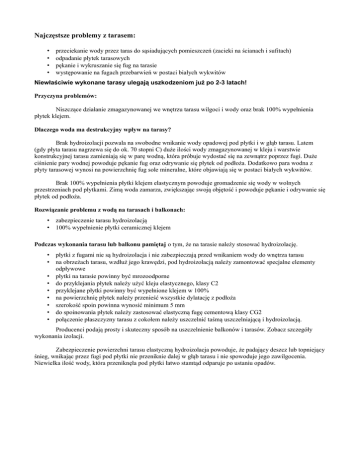Najczęstsze problemy z tarasem: • • • • przeciekanie wody przez taras do sąsiadujących pomieszczeń (zacieki na ścianach i sufitach) odpadanie płytek tarasowych pękanie i wykruszanie się fug na tarasie występowanie na fugach przebarwień w postaci białych wykwitów Niewłaściwie wykonane tarasy ulegają uszkodzeniom już po 2-3 latach! Przyczyna problemów: Niszczące działanie zmagazynowanej we wnętrzu tarasu wilgoci i wody oraz brak 100% wypełnienia płytek klejem. Dlaczego woda ma destrukcyjny wpływ na tarasy? Brak hydroizolacji pozwala na swobodne wnikanie wody opadowej pod płytki i w głąb tarasu. Latem (gdy płyta tarasu nagrzewa się do ok. 70 stopni C) duże ilości wody zmagazynowanej w kleju i warstwie konstrukcyjnej tarasu zamieniają się w parę wodną, która próbuje wydostać się na zewnątrz poprzez fugi. Duże ciśnienie pary wodnej powoduje pękanie fug oraz odrywanie się płytek od podłoża. Dodatkowo para wodna z płyty tarasowej wynosi na powierzchnię fug sole mineralne, które objawiają się w postaci białych wykwitów. Brak 100% wypełnienia płytki klejem elastycznym powoduje gromadzenie się wody w wolnych przestrzeniach pod płytkami. Zimą woda zamarza, zwiększając swoją objętość i powoduje pękanie i odrywanie się płytek od podłoża. Rozwiązanie problemu z wodą na tarasach i balkonach: • zabezpieczenie tarasu hydroizolacją • 100% wypełnienie płytki ceramicznej klejem Podczas wykonania tarasu lub balkonu pamiętaj o tym, że na tarasie należy stosować hydroizolację. • płytki z fugami nie są hydroizolacja i nie zabezpieczają przed wnikaniem wody do wnętrza tarasu • na obrzeżach tarasu, wzdłuż jego krawędzi, pod hydroizolacją należy zamontować specjalne elementy odpływowe • płytki na tarasie powinny być mrozoodporne • do przyklejania płytek należy użyć kleju elastycznego, klasy C2 • przyklejane płytki powinny być wypełnione klejem w 100% • na powierzchnię płytek należy przenieść wszystkie dylatację z podłoża • szerokość spoin powinna wynosić minimum 5 mm • do spoinowania płytek należy zastosować elastyczną fugę cementową klasy CG2 • połączenie płaszczyzny tarasu z cokołem należy uszczelnić taśmą uszczelniającą i hydroizolacją. Producenci podają prosty i skuteczny sposób na uszczelnienie balkonów i tarasów. Zobacz szczegóły wykonania izolacji. Zabezpieczenie powierzchni tarasu elastyczną hydroizolacja powoduje, że padający deszcz lub topniejący śnieg, wnikając przez fugi pod płytki nie przeniknie dalej w głąb tarasu i nie spowoduje jego zawilgocenia. Niewielka ilość wody, która przeniknęła pod płytki łatwo stamtąd odparuje po ustaniu opadów.