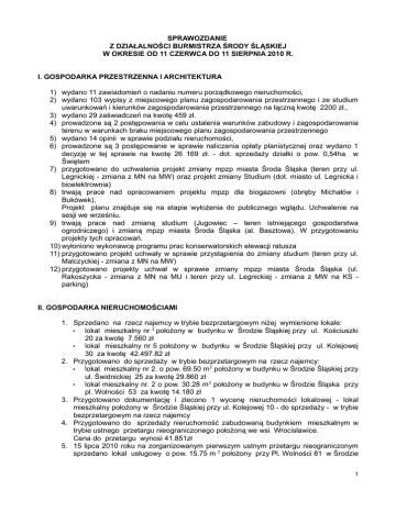 SPRAWOZDANIE Z DZIAŁALNOŚCI BURMISTRZA ŚRODY ŚLĄSKIEJ W OKRESIE OD 11 CZERWCA DO 11 SIERPNIA 2010 R. I. GOSPODARKA PRZESTRZENNA I ARCHITEKTURA 1) wydano 11 zawiadomień o nadaniu numeru porządkowego nieruchomości, 2) wydano 103 wypisy z miejscowego planu zagospodarowania przestrzennego i ze studium uwarunkowań i kierunków zagospodarowania przestrzennego na łączną kwotę 2200 zł., 3) wydano 29 zaświadczeń na kwotę 459 zł. 4) prowadzone są 2 postępowania w celu ustalenia warunków zabudowy i zagospodarowania terenu w warunkach braku miejscowego planu zagospodarowania przestrzennego 5) wydano 14 opinii w sprawie podziału nieruchomości, 6) prowadzone są 3 postępowanie w sprawie naliczenia opłaty planistycznej oraz wydano 1 decyzję w tej sprawie na kwotę 26 169 zł. - dot. sprzedaży działki o pow. 0,54ha w Świętem 7) przygotowano do uchwalenia projekt zmiany mpzp miasta Środa Śląska (teren przy ul. Legnickiej - zmiana z MN na MW) oraz projekt zmiany Studium (dot. miasto ul. Legnicka i bioelektrownia) 8) trwają prace nad opracowaniem projektu mpzp dla biogazowni (obręby Michałów i Bukówek), Projekt planu znajduje się na etapie wyłożenia do publicznego wglądu. Uchwalenie na sesji we wrześniu. 9) trwają prace nad zmianą studium (Jugowiec – teren istniejącego gospodarstwa ogrodniczego) i zmianą mpzp miasta Środa Śląska (al. Basztowa). W przygotowaniu projekty tych opracowań. 10) wyłoniono wykonawcę programu prac konserwatorskich elewacji ratusza 11) przygotowano projekt uchwały w sprawie przystąpienia do zmiany studium (teren przy ul. Malczyckiej - zmiana z MN na MW) 12) przygotowano projekty uchwał w sprawie zmiany mpzp miasta Środa Śląska (ul. Rakoszycka - zmiana z MN na MU i teren przy ul. Legnickiej - zmiana z MW na KS parking) II. GOSPODARKA NIERUCHOMOŚCIAMI 1. Sprzedano na rzecz najemcy w trybie bezprzetargowym niżej wymienione lokale: • lokal mieszkalny nr 2 położony w budynku w Środzie Śląskiej przy ul. Kościuszki 20 za kwotę 7.560 zł • lokal mieszkalny nr 5 położony w budynku w Środzie Śląskiej przy ul. Kolejowej 30 za kwotę 42.497.82 zł 2. Przygotowano do sprzedaży w trybie bezprzetargowym na rzecz najemcy: • lokal mieszkalny nr 2. o pow. 69.50 m2 położony w budynku w Środzie Śląskiej przy ul. Świdnickiej 25 za kwotę 29.860 zł • lokal mieszkalny nr. 2 o pow. 30.28 m2 położony w budynku w Środzie Śląska przy pl. Wolności 53 za kwotę 14.180 zł 3. Przygotowano dokumentację i zlecono 1 wycenę nieruchomości lokalowej - lokal mieszkalny położony w Środzie Śląskiej przy ul. Kolejowej 10 - do sprzedaży - w trybie bezprzetargowym na rzecz najemcy 4. Przygotowano do sprzedaży nieruchomość zabudowaną budynkiem mieszkalnym w trybie ustnego przetargu nieograniczonego położoną we wsi Wrocisławice. Cena do przetargu wynosi 41.851zł 5. 15 lipca 2010 roku na zorganizowanym pierwszym ustnym przetargu nieograniczonym sprzedano lokal usługowy o pow. 15.75 m 2 położony przy Pl. Wolności 81 w Środzie 1 Śląskiej za kwotę 46.600 zł. 6. Na dzień 18 sierpnia 2010 roku ogłoszono pierwszy i trzeci ustny przetarg nieograniczony na sprzedaż trzech działek niezabudowanych pod budownictwo mieszkaniowe jednorodzinne: • pierwszy ustny przetarg na sprzedaż nieruchomości gruntowej niezabudowanej oznaczonej numerem działki 200/4 o pow. 1100 m2 położonej we wsi Rzeczyca. Cena wywoławcza do przetargu wynosi 32 736,00 zł netto. • Trzeci ustny przetarg nieograniczony na sprzedaż dwóch działek niezabudowanych nr 32/4 o pow. 1640 m 2 i nr 2/5 o pow. 1639 m2 . Cena wywoławcza do przetargu działki nr 32/4 wynosi 32 800 zł, zaś działki nr 32/5 - 32 780 zł. 7. Ogłoszono - na dzień 3 września 2010 roku - pierwszy ustny przetarg nieograniczony na sprzedaż dwóch działek niezabudowanych nr 196/1 i 196/2, AM-20, każda o pow. 1247 m2 położonych przy ul. Flamandzkiej w Środzie Śląskiej przeznaczonych pod budownictwo mieszkaniowe jednorodzinne . Cena wywoławcza do przetargu każdej działki wynosi 140 923,00 zł netto. 8. Ogłoszono - na dzień 6 września 2010 roku - pierwszy ustny przetarg nieograniczony na sprzedaż 7 działek niezabudowanych położonych we wsi Przedmoście przeznaczonych pod budownictwo mieszkaniowe jednorodzinne, w tym cztery działki o powierzchni 1030 m2 każda i trzy działki o pow. 1053 m2 każda. Cena wywoławcza do przetargu trzech działek o pow. 1030 m2 wynosi 41.076 zł , a jednej działki o pow. 1030 m2 wynosi 37 956 zł. Natomiast cena do przetargu każdej działki o pow. 1053 m 2 wynosi 41 994 ,- zł 9. Ogłoszono - na dzień 23 września 2010 roku - pierwszy pisemny przetarg ograniczony na sprzedaż działki niezabudowanej nr 315/5 o powierzchni 12 906 m2 położonej we wsi Komorniki, objętej Legnicką Specjalną Strefa Ekonomiczną. Cena wywoławcza do przetargu wynosi 812 046,00 zł. 10. Ogłoszono - na dzień 6 października 2010 roku - pierwszy pisemny przetarg nieograniczony na sprzedaż działki częściowo zabudowanej nr 38/4, AM-25 o pow. 20 518 m2 położonej przy ul. Spółdzielczej w Środzie Śląskiej, objętej Legnicką Specjalną Strefa Ekonomiczną. Cena wywoławcza do przetargu wynosi 1.498.000,00 zł. 11. Wydano 1 zaświadczenie o posiadaniu gospodarstwa rolnego. 12. Wydano 2 zaświadczenia o spłacie ciężaru realnego. 13. Wydano 33 decyzji zatwierdzających podziały nieruchomości. III. INWESTYCJE 1.Realizowano następujące zadania: a) Budowa kanalizacji sanitarnej wraz z siecią wodociągową w miejscowości Komorniki. Wykonawca zadania: Przedsiębiorstwo Budownictwa Specjalistycznego i Melioracji Sp. z o. o. z siedzibą w Legnicy. Wartość zadania brutto: 1.180 969,69 zł. Termin wykonania: 29 października 2010. Wykonawca wystąpił z prośbą o skrócenie czasu realizacji zadania do 15 lipca 2010 na co otrzymał zgodę. Zakres do wykonania obejmuje budowę: • kanalizacji sanitarnej Ø 200 o łącznej długości