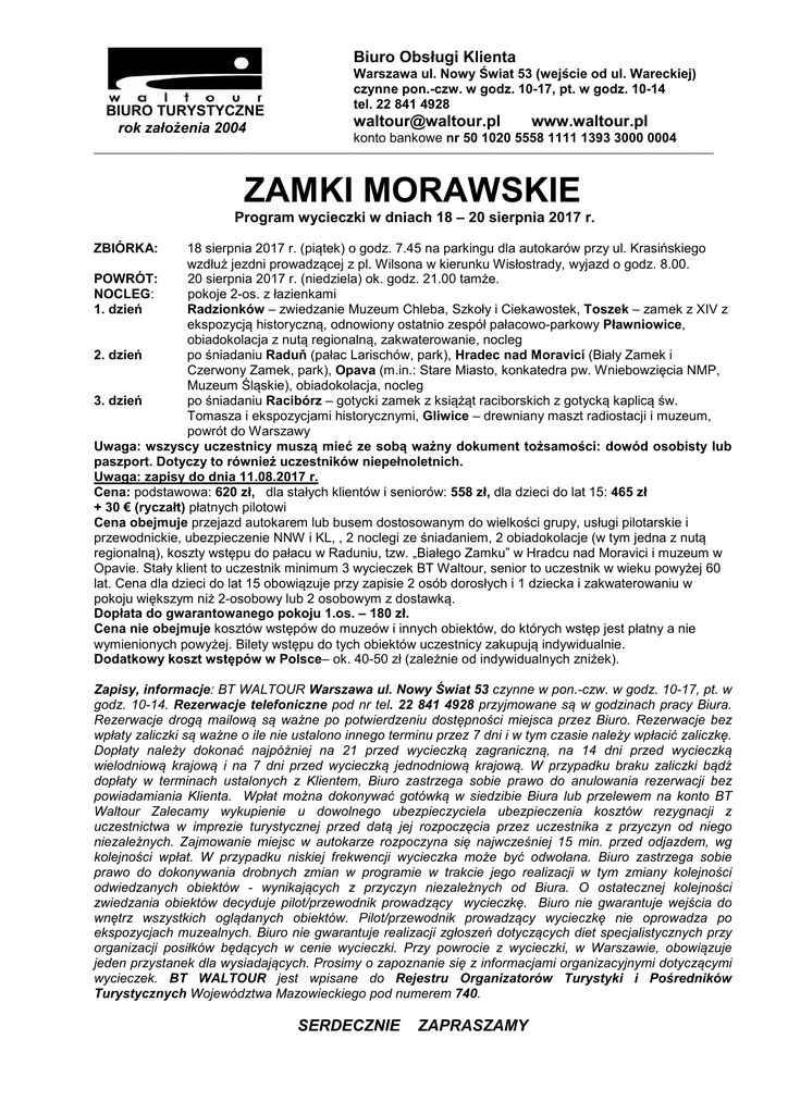 Biuro Obsługi Klienta BIURO TURYSTYCZNE rok założenia 2004 Warszawa ul. Nowy Świat 53 (wejście od ul. Wareckiej) czynne pon.-czw. w godz. 10-17, pt. w godz. 10-14 tel. 22 841 4928 [email protected] www.waltour.pl konto bankowe nr 50 1020 5558 1111 1393 3000 0004 ______________________________________________________________________________ ZAMKI MORAWSKIE Program wycieczki w dniach 18 – 20 sierpnia 2017 r. ZBIÓRKA: 18 sierpnia 2017 r. (piątek) o godz. 7.45 na parkingu dla autokarów przy ul. Krasińskiego wzdłuż jezdni prowadzącej z pl. Wilsona w kierunku Wisłostrady, wyjazd o godz. 8.00. POWRÓT: 20 sierpnia 2017 r. (niedziela) ok. godz. 21.00 tamże. NOCLEG: pokoje 2-os. z łazienkami 1. dzień Radzionków – zwiedzanie Muzeum Chleba, Szkoły i Ciekawostek, Toszek – zamek z XIV z ekspozycją historyczną, odnowiony ostatnio zespół pałacowo-parkowy Pławniowice, obiadokolacja z nutą regionalną, zakwaterowanie, nocleg 2. dzień po śniadaniu Raduň (pałac Larischów, park), Hradec nad Moravicí (Biały Zamek i Czerwony Zamek, park), Opava (m.in.: Stare Miasto, konkatedra pw. Wniebowzięcia NMP, Muzeum Śląskie), obiadokolacja, nocleg 3. dzień po śniadaniu Racibórz – gotycki zamek z książąt raciborskich z gotycką kaplicą św. Tomasza i ekspozycjami historycznymi, Gliwice – drewniany maszt radiostacji i muzeum, powrót do Warszawy Uwaga: wszyscy uczestnicy muszą mieć ze sobą ważny dokument tożsamości: dowód osobisty lub paszport. Dotyczy to również uczestników niepełnoletnich. Uwaga: zapisy do dnia 11.08.2017 r. Cena: podstawowa: 620 zł, dla stałych klientów i seniorów: 558 zł, dla dzieci do lat 15: 465 zł + 30 € (ryczałt) płatnych pilotowi Cena obejmuje przejazd autokarem lub busem dostosowanym do wielkości grupy, usługi pilotarskie i przewodnickie, ubezpieczenie NNW i KL, , 2 noclegi ze śniadaniem, 2 obiadokolacje (w tym jedna z nutą regionalną), koszty wstępu do pałacu w Raduniu, tzw. „Białego Zamku” w Hradcu nad Moravici i muzeum w Opavie. Stały klient to uczestnik minimum 3 wycieczek BT Waltour, senior to uczestnik w wieku powyżej 60 lat. Cena dla dzieci do lat 15 obowiązuje przy zapisie 2 osób dorosłych i 1 dziecka i zakwaterowaniu w pokoju większym niż 2-osobowy lub 2 osobowym z dostawką. Dopłata do gwarantowanego pokoju 1.os. – 180 zł. Cena nie obejmuje kosztów wstępów do muzeów i innych obiektów, do których wstęp jest płatny a nie wymienionych powyżej. Bilety wstępu do tych obiektów uczestnicy zakupują indywidualnie. Dodatkowy koszt wstępów w Polsce– ok. 40-50 zł (zależnie od indywidualnych zniżek). Zapisy, informacje: BT WALTOUR Warszawa ul. Nowy Świat 53 czynne w pon.-czw. w godz. 10-17, pt. w godz. 10-14. Rezerwacje telefoniczne pod nr tel. 22 841 4928 przyjmowane są w godzinach pracy Biura. Rezerwacje drogą mailową są ważne po potwierdzeniu dostępności miejsca przez Biuro. Rezerwacje bez wpłaty zaliczki są ważne o ile nie ustalono innego terminu przez 7 dni i w tym czasie należy wpłacić zaliczkę. Dopłaty należy dokonać najpóźniej na 21 przed wycieczką zagraniczną, na 14 dni przed wycieczką wielodniową krajową i na 7 dni przed wycieczką jednodniową krajową. W przypadku braku zaliczki bądź dopłaty w terminach ustalonych z Klientem, Biuro zastrzega sobie prawo do anulowania rezerwacji bez powiadamiania Klienta. Wpłat można dokonywać gotówką w siedzibie Biura lub przelewem na konto BT Waltour Zalecamy wykupienie u dowolnego ubezpieczyciela ubezpieczenia kosztów rezygnacji z uczestnictwa w imprezie turystycznej przed datą jej rozpoczęcia przez uczestnika z przyczyn od niego niezależnych. Zajmowanie miejsc w autokarze rozpoczyna się najwcześniej 15 min. przed odjazdem, wg kolejności wpłat. W przypadku niskiej frekwencji wycieczka może być odwołana. Biuro zastrzega sobie prawo do dokonywania drobnych zmian w programie w trakcie jego realizacji w tym zmiany kolejności odwiedzanych obiektów - wynikających z przyczyn niezależnych od Biura. O ostatecznej kolejności zwiedzania obiektów decyduje pilot/przewodnik prowadzący wycieczkę. Biuro nie gwarantuje wejścia do wnętrz wszystkich oglądanych obiektów. Pilot/przewodnik prowadzący wycieczkę nie oprowadza po ekspozycjach muzealnych. Biuro nie gwarantuje realizacji zgłoszeń dotyczących diet specjalistycznych przy organizacji posiłków będących w cenie wycieczki. Przy powrocie z wycieczki, w Warszawie, obowiązuje jeden przystanek dla wysiadających. Prosimy o zapoznanie się z informacjami organizacyjnymi dotyczącymi wycieczek. BT WALTOUR jest wpisane do Rejestru Organizatorów Turystyki i Pośredników Turystycznych Województwa Mazowieckiego pod numerem 740. SERDECZNIE ZAPRASZAMY