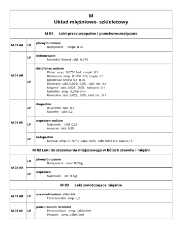 M Układ mięśniowo- szkieletowy M 01 M 01 AA LR phenylbutazone Butapirazol LP indometacin Metindol Retard tabl. 0,075 LP diclofenac sodium Diclac amp. 0,075/ 3ml; czopki 0,1 Dicloreum amp. 0,075/ 3ml; czopki 0,1 Diclofenac czopki 0,1; 0,05 Dicloratio tabl. 0,025; 0,05; tabl. ret. 0,1 Majamil tabl. 0,025; 0,05; tabl.prol. 0,1 Naklofen amp. 0,075/ 3ml Rewodina tabl. 0,025; 0,05; tabl. ret. 0,1 LP ibuprofen Ibuprofen tabl. 0,2 Nurofen tabl. 0,2 LP naproxen sodium Naproxen tabl. 0,25 Anapran tabl. 0,25 LP ketoprofen Ketonal amp. 0,1/2ml; kaps. 0,05; tabl. forte 0,1; kaps.0,15 M 01 AB M 01 AE Leki przeciwzapalne i przeciwreumatyczne czopki 0,25 M 02 Leki do stosowania miejscowego w bólach stawów i mięśni LR phenylbutazone Butapirazol maść 0,05/g LP naproxen Naproxen M 02 AA żel 0,1/g M 03 M 03 AB M 03 AC Leki zwiotczające mięśnie LP suxamethonium chloride Chlorsuccillin amp. 0,2 LR pancuronium bromide Pancuronium amp. 0,004/2ml Pavulon amp. 0,004/2ml LS atracurium besylate Tracrium amp. 0,05 mg/5ml LP rocuronium bromide Esmeron amp. 0,05/5ml Rocuronium fiol. 0,05; 0,1 Roqurum fiol. 0,05; 0,01 LS cisatracurium Nimbex amp. 0,002/ml LR Mivacurium Mivacron amp. 0,02/10ml LP baclofen Baclofen tabl. 0,01; 0,025 LP tolperizone hydrochloride Mydocalm tabl. 0,05; tabl. forte 0,15 M 03 BX M 04 Leki przeciw dnie M 04 AA LP allopurinol Allupol tabl. 0,1 Milurit tabl. 0,1 M 04 AC LR colchicine Colchicum –Dispert draż. 0,5 mg