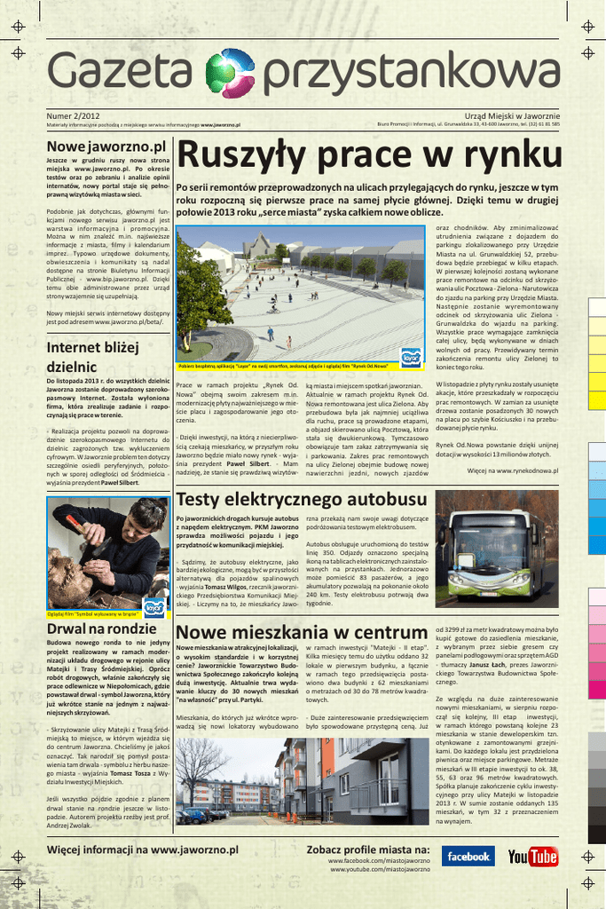 Gazeta przystankowa Urząd Miejski w Jaworznie Numer 2/2012 Materiały informacyjne pochodzą z miejskiego serwisu informacyjnego www.jaworzno.pl Nowe jaworzno.pl Jeszcze w grudniu ruszy nowa strona miejska www.jaworzno.pl. Po okresie testów oraz po zebraniu i analizie opinii internatów, nowy portal staje się pełnoprawną wizytówką miasta w sieci. Podobnie jak dotychczas, głównymi funkcjami nowego serwisu jaworzno.pl jest warstwa informacyjna i promocyjna. Można w nim znaleźć m.in. najświeższe informacje z miasta, filmy i kalendarium imprez. Typowo urzędowe dokumenty, obwieszczenia i komunikaty są nadal dostępne na stronie Biuletynu Informacji Publicznej - www.bip.jaworzno.pl. Dzięki temu obie administrowane przez urząd strony wzajemnie się uzupełniają. Biuro Promocji i Informacji, ul. Grunwaldzka 33, 43-600 Jaworzno, tel. (32) 61 81 585 Ruszyły prace w rynku Po serii remontów przeprowadzonych na ulicach przylegających do rynku, jeszcze w tym roku rozpoczną się pierwsze prace na samej płycie głównej. Dzięki temu w drugiej połowie 2013 roku „serce miasta” zyska całkiem nowe oblicze. Nowy miejski serwis internetowy dostępny jest pod adresem www.jaworzno.pl/beta/. Internet bliżej dzielnic Do listopada 2013 r. do wszystkich dzielnic Jaworzna zostanie doprowadzony szerokopasmowy Internet. Została wyłoniona firma, która zrealizuje zadanie i rozpoczynają się prace w terenie. - Realizacja projektu pozwoli na doprowadzenie szerokopasmowego Internetu do dzielnic zagrożonych tzw. wykluczeniem cyfrowym. W Jaworznie problem ten dotyczy szczególnie osiedli peryferyjnych, położonych w sporej odległości od Śródmieścia wyjaśnia prezydent Paweł Silbert. Pobierz bezpłatną aplikację "Layar" na swój smartfon, zeskanuj zdjęcie i oglądaj film "Rynek Od.Nowa" Prace w ramach projektu „Rynek Od. Nowa” obejmą swoim zakresem m.in. modernizację płyty najważniejszego w mieście placu i zagospodarowanie jego otoczenia. - Dzięki inwestycji, na którą z niecierpliwością czekają mieszkańcy, w przyszłym roku Jaworzno będzie miało nowy rynek - wyjaśnia prezydent Paweł Silbert. - Mam nadzieję, że stanie się prawdziwą wizytów- ką miasta i miejscem spotkań jaworznian. Aktualnie w ramach projektu Rynek Od. Nowa remontowana jest ulica Zielona. Aby przebudowa była jak najmniej uciążliwa dla ruchu, prace są prowadzone etapami, a objazd skierowano ulicą Pocztową, która stała się dwukierunkową. Tymczasowo obowiązuje tam zakaz zatrzymywania się i parkowania. Zakres prac remontowych na ulicy Zielonej obejmie budowę nowej nawierzchni jezdni, nowych zjazdów oraz chodników. Aby zminimalizować utrudnienia związane z dojazdem do parkingu zlokalizowanego przy Urzędzie Miasta na ul. Grunwaldzkiej 52, przebudowa będzie przebiegać w kilku etapach. W pierwszej kolejności zostaną wykonane prace remontowe na odcinku od skrzyżowania ulic Pocztowa - Zielona - Narutowicza do zjazdu na parking przy Urzędzie Miasta. Następnie zostanie wyremontowany odcinek od skrzyżowania ulic Zielona Grunwaldzka do wjazdu na parking. Wszystkie prace wymagające zamknięcia całej ulicy, będą wykonywane w dniach wolnych od pracy. Przewidywany termin zakończenia remontu ulicy Zielonej to koniec tego roku. W listopadzie z płyty rynku zostały usunięte akacje, które przeszkadzały w rozpoczęciu prac remontowych. W zamian za usunięte drzewa zostanie posadzonych 30 nowych na placu po szybie Kościuszko i na przebudowanej płycie rynku. Rynek Od.Nowa powstanie dzięki unijnej dotacji w wysokości 13 milionów złotych. Więcej na www.rynekodnowa.pl Testy elektrycznego autobusu Po jaworznickich drogach kursuje autobus z napędem elektrycznym. PKM Jaworzno sprawdza możliwości pojazdu i jego przydatność w komunikacji miejskiej. - Sądzimy, że autobusy elektryczne, jako bardziej ekologiczne, mogą być w przyszłości alternatywą dla pojazdów spalinowych - wyjaśnia Tomasz Wilgos, rzecznik jaworznickiego Przedsiębiorstwa Komunikacji Miejskiej. - Liczymy na to, że mieszkańcy Jawo- rzna przekażą nam swoje uwagi dotyczące podróżowania testowym elektrobusem. Autobus obsługuje uruchomioną do testów linię 350. Odjazdy oznaczono specjalną ikoną na tablicach elektronicznych zainstalowanych na przystankach. Jednorazowo może pomieścić 83 pasażerów, a jego akumulatory pozwalają na pokonanie około 240 km. Testy elektrobusu potrwają dwa tygodnie. Oglądaj film "Symbol wykuwany w brązie" Drwal na rondzie Budowa nowego ronda to nie jedyny projekt realizowany w ramach modernizacji układu drogowego w rejonie ulicy Matejki i Trasy Śródmiejskiej. Oprócz robót drogowych, właśnie zakończyły się prace odlewnicze w Niepołomicach, gdzie powstawał drwal - symbol Jaworzna, który już wkrótce stanie na jednym z najważniejszych skrzyżowań. Nowe mieszkania w centrum Nowe mieszkania w atrakcyjnej lokalizacji, o wysokim standardzie i w korzystnej cenie? Jaworznickie Towarzystwo Budownictwa Społecznego zakończyło kolejną dużą inwestycję. Aktualnie trwa wydawanie kluczy do 30 nowych mieszkań "na własność" przy ul. Partyki. w ramach inwestycji "Matejki - II etap". Kilka miesięcy temu do użytku oddano 32 lokale w pierwszym budynku, a łącznie w ramach tego przedsięwzięcia postawiono dwa budynki z 62 mieszkaniami o metrażach od 30 do 78 metrów kwadratowych. Mieszkania, do których już wkrótce wpro- Skrzyżowanie ulicy Matejki z Trasą Śród- wadzą się nowi lokatorzy wybudowano miejską to miejsce, w którym wjeżdża się do centrum Jaworzna. Chcieliśmy je jakoś oznaczyć. Tak narodził się pomysł postawienia tam drwala - symbolu z herbu naszego miasta - wyjaśnia Tomasz Tosza z Wydziału Inwestycji Miejskich. - Duże zainteresowanie przedsięwzięciem było spowodowane przystępną ceną. Już Jeśli wszystko pójdzie zgodnie z planem drwal stanie na rondzie jeszcze w listopadzie. Autorem projektu rzeźby jest prof. Andr