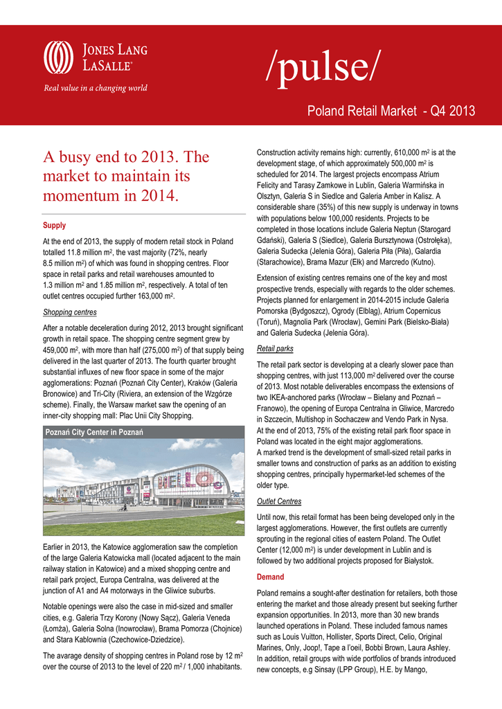Poland Retail Market - Q4 2013 A busy end to 2013. The market to maintain its momentum in 2014. Supply At the end of 2013, the supply of modern retail stock in Poland totalled 11.8 million m2, the vast majority (72%, nearly 8.5 million m2) of which was found in shopping centres. Floor space in retail parks and retail warehouses amounted to 1.3 million m2 and 1.85 million m2, respectively. A total of ten outlet centres occupied further 163,000 m2. Shopping centres After a notable deceleration during 2012, 2013 brought significant growth in retail space. The shopping centre segment grew by 459,000 m2, with more than half (275,000 m2) of that supply being delivered in the last quarter of 2013. The fourth quarter brought substantial influxes of new floor space in some of the major agglomerations: Poznań (Poznań City Center), Kraków (Galeria Bronowice) and Tri-City (Riviera, an extension of the Wzgórze scheme). Finally, the Warsaw market saw the opening of an inner-city shopping mall: Plac Unii City Shopping. Poznań City Center in Poznań Construction activity remains high: currently, 610,000 m2 is at the development stage, of which approximately 500,000 m2 is scheduled for 2014. The largest projects encompass Atrium Felicity and Tarasy Zamkowe in Lublin, Galeria Warmińska in Olsztyn, Galeria S in Siedlce and Galeria Amber in Kalisz. A considerable share (35%) of this new supply is underway in towns with populations below 100,000 residents. Projects to be completed in those locations include Galeria Neptun (Starogard Gdański), Galeria S (Siedlce), Galeria Bursztynowa (Ostrołęka), Galeria Sudecka (Jelenia Góra), Galeria Piła (Piła), Galardia (Starachowice), Brama Mazur (Ełk) and Marcredo (Kutno). Extension of existing centres remains one of the key and most prospective trends, especially with regards to the older schemes. Projects planned for enlargement in 2014-2015 include Galeria Pomorska (Bydgoszcz), Ogrody (Elbląg), Atrium Copernicus (Toruń), Magnolia Park (Wrocław), Gemini Park (Bielsko-Biała) and Galeria Sudecka (Jelenia Góra). Retail parks The retail park sector is developing at a clearly slower pace than shopping centres, with just 113,000 m2 delivered over the course of 2013. Most notable deliverables encompass the extensions of two IKEA-anchored parks (Wrocław – Bielany and Poznań – Franowo), the opening of Europa Centralna in Gliwice, Marcredo in Szczecin, Multishop in Sochaczew and Vendo Park in Nysa. At the end of 2013, 75% of the existing retail park floor space in Poland was located in the eight major agglomerations. A marked trend is the development of small-sized retail parks in smaller towns and construction of parks as an addition to existing shopping centres, principally hypermarket-led schemes of the older type. Outlet Centres Earlier in 2013, the Katowice agglomeration saw the completion of the large Galeria Katowicka mall (located adjacent to the main railway station in Katowice) and a mixed shopping centre and retail park project, Europa Centralna, was delivered at the junction of A1 and A4 motorways in the Gliwice suburbs. Notable openings were also the case in mid-sized and smaller cities, e.g. Galeria Trzy Korony (Nowy Sącz), Galeria Veneda (Łomża), Galeria Solna (Inowrocław), Brama Pomorza (Chojnice) and Stara Kablownia (Czechowice-Dziedzice). The avarage density of shopping centres in Poland rose by 12 m2 over the course of 2013 to the level of 220 m2 / 1,000 inhabitants. Until now, this retail format has been being developed only in the largest agglomerations. However, the first outlets are currently sprouting in the regional cities of eastern Poland. The Outlet Center (12,000 m2) is under development in Lublin and is followed by two additional projects proposed for Białystok. Demand Poland remains a sought-after destination for retailers, both those entering the market and those already present but seeking further expansion opportunities. In 2013, more than 30 new brands launched operations in Poland. These included famous names such as Louis Vuitton, Hollister, Sports Direct, Celio, Original Marines, Only, Joop!, Tape a l’oeil, Bobbi Brown, Laura Ashley. In addition, retail groups with wide portfolios of brands introduced new concepts, e.g Sinsay (LPP Group), H.E. by Mango, H&M Home. Others diversified their concepts, such as Empik which launched Empik Express stores (100 to 200 m2), adjusted to specific conditions of smaller cities and small-sized retail schemes. The segment of small retail parks, which is gathering pace across the country, fosters the expansion of clothing discounters, such as Pepco, KiK and NKD. On the other hand, some retail operators decided to either withdraw from the Polish market or to optimize their chains of stores, e.g. Charles Voegele, Marrionaud, Jackpot & Cottonfield, Wallis, KappAhl, LaSenza and Flo. This creates opportunities for new entrants and for property managers to refresh the offer of their assets. Existing projects, with a good trading history, remain the most widely chosen locations by retailers. The best performing shopping schemes in major agglomerations still draw the highest interest; however, good quality projects in smaller cities are also gaining market recognition. With that said, owners of assets perceived as secondary product or those located in more competitive markets should be prepared for having to optimise rental levels. Prime shopping centre rents, which refer to a 100 m2 unit earmarked for retailers from the fashion and accessories category in a leading shopping centre, remained stable throughout 2013. The highest rents are typically found in Warsaw, where they now range between €85 and €100 m2/ month, which is a slight (5%) increase on 2012, and is largely due to the number of recommercialisations in Warsaw’s leading projects. Investment market The volume of transacted retail properties throughout 2013 reached €1.32 billion, the vast majority (€1.12 billion) of 
