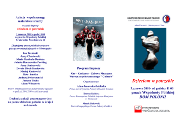Aukcja wspolczesnego malarstwa i rzezby Adam Wieczorek , „Macierzynstwo ", braz w czasie imprezy dzieciom w potrzebie 3 czerwca 2001 o godz.15.00 w gmachu Wspolnoty Polskiej Krakowskie Przedmiescie 64 Licytujemy prace polskich artystow plastykow mieszkajacych w Niemczech: Jan Bresinski Jerzy Chartowski Maria Gembala-Dauksza Jolanta Dorszewska-Poetting Jerzy Janiszewski Dorota Block-Kaniewska Maciej Kaniewski Piotr Smolka Andrzej Swierczynski Justyna Tucha Adam Wieczorek Program Imprezy Gry - Konkursy - Zabawy Muzyczne Wystep zespolu tanecznego " Gniazdo" Organizatorzy: Alina Janowska-Zablocka Prace przeznaczone na aukcje mozna ogladac w godz.11.00-15.00 w sali lustrzanej Dochod z aukcji przeznaczony jest na pomoc dzieciom polskim w kraju i na kresach. Prezes Stowarzyszenia Pomocy Dzieciom Gniazdo Dzieciom w potrzebie 3.czerwca 2001- od godziny 11.00 Dorota Kabiesz gmach Wspolnoty Polskiej Prezes Towarzystwa Polskich Artystow Plastykow w Niemczech DOM POLONII Marek Bakowski Prezes Europejskiego Forum Lekarzy Polskich Al.Lotnikow 32/46.Tel/Fax:22-8471401 tym rowniez na Pomoc Panstwa. Piotr Smolka Pomoc deklaruje: (prezes pan Artur Marciniak ) Stowarzyszenie Wspolnota Polska Dary pieniezne :Konto Pomocy EFLP Konto nr.10501041-2227403157 Bank BSK S.A.O/Warszawa Z dopiskiem - Pomoc Polskie Towarzystwo Lekarskie Jerzy Chartowski Europejskie Forum Lekarzy Polskich rozpoczyna dzisiaj Akcje Pomocy Dzieciom w Potrzebie. w kraju i na ziemiach kresowych (Litwa,Bialorus,Ukraina,Moldawia) wszedzie tam gdzie dzieci polskie jej oczekuja. Maciej Kaniewski Maria Gembala-Dauksza Dorota Block-Kaniewska Polskie Towarzystwo Medyczne w Niemczech Towarzystwo Polskich Artystow Plastykow w Niemczech “ academia e.V” Galeria Sztuki Katarzyny Napiorkowskiej Chcemy w miare moznosci poprawic panujace warunki bycia i opieki lekarskiej.Liczymy przy Warszawa Fundacja Polonia Dary materialne w Warszawie zbiera firma MAR-MED Medison Ultrasound Jerzy Janiszewski