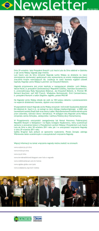 Newsletter 05/10/2011 Dnia 29 września były Prezydent Brazylii Luiz Inacio Lula da Silva odebrał w Gdańsku z rąk Lecha Wałęsy nagrodę jego imienia. Luiz Inacio Lula da Silva otrzymał Nagrodę Lecha Wałęsy za działania na rzecz zmniejszenia nierówności społecznych oraz wzmocnienia na arenie międzynarodowej znaczenia krajów rozwijających się. Laudację na cześć laureata wygłosił członek kapituły Nagrody Lecha Wałęsy b.premier Jan Krzysztof Bielecki. Nagroda przyznawana jest przez kapitułę w następującym składzie: Lech Wałęsa, Vaclav Havel, b. prezydent Czechosłowacji i Republiki Czeskiej, Stanisław Szuszkiewicz, b. przewodniczący Rady Najwyższej Białorusi, Jan Krzysztof Bielecki, b. Premier RP, Bernard Kouchner, szef MSZ Francji, Władysław Bartoszewski, Emil Constantinescu, b. prezydent Rumunii a także Zbigniew Jagiełło, prezes PKO BP. Na Nagrodę Lecha Wałęsy sklada się czek na 100 tysięcy dolarów z przeznaczeniem na wsparcie działalności laureata, dyplom oraz statuetka. W poprzednich latach Nagrodę Lecha Wałęsy otrzymali: król Arabii Saudyjskiej Abdullah Bin Abdulazi Al. Saud m.in. za zasługi na rzecz dialogu międzyreligijnego; w 2009 roku laureatkami zostały Shadi Sadr oraz siostry Ladan i Roya Boroumand irańskie obrończynie praw człowieka, wolności słowa i demokracji. W ubiegłym roku Nagrode Lecha Wałęsy otrzymała Janina Ochojska, założycielka i szefowa Polskiej Akcji Humanitarnej. W Przygotowaniu uroczystości zaangażowany był Konsul Honorowy Federacyjnej Republiki Brazylii w Małopolsce i na Śląsku Grzegorz Hajdarowicz, który uczestniczył zarówno w prywatnej kolacji z Prezydentem Lechem Wałęsą i Prezydentem Luiz Inacio Lula da Silva w dniu 28 września 2011 roku jak i w uroczystości wręczenia Nagrody w dniu 29 września 2011 roku. Spółka Dragmor była jednym ze sponsorów wydarzenia. Prezes Zarządu Jadwiga Wiśniowska także uczestniczyła w uroczystościach wręczenia Nagrody. Więcej informacji na temat wręczenia nagrody można znaleźć na stronach: www.wyborcza.pl/silva www.tvn24.pl/silva www.rp.pl/silva www.terrabrasilisfund.blogspot.com/lula-z-nagroda www.redebrasilatual.com.br/temas www.oglobo.globo.com/pais fot. ILW/ Łukasz Ostalski (4) www.icidadania.org/lech-walesa