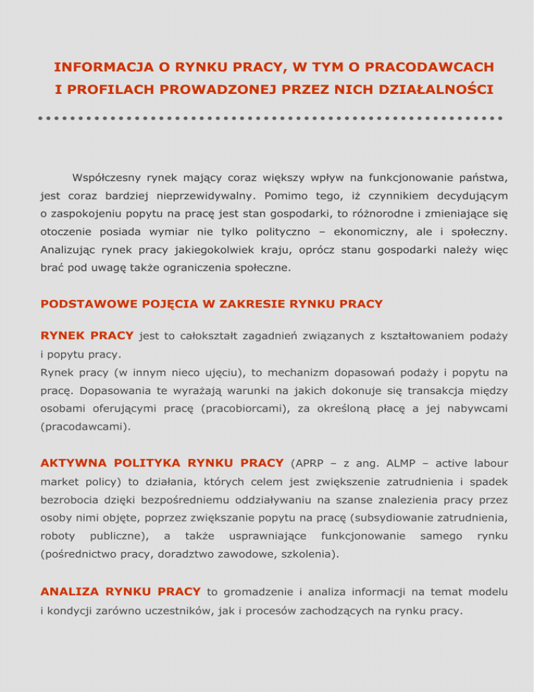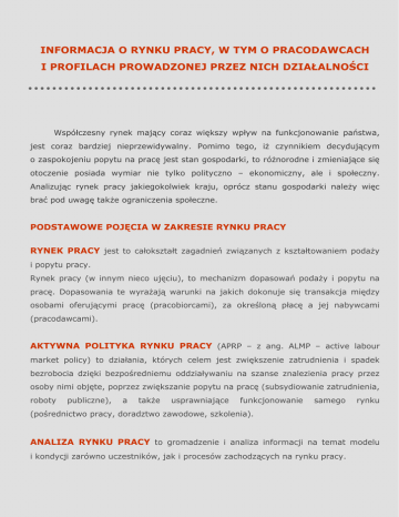 INFORMACJA O RYNKU PRACY, W TYM O PRACODAWCACH I PROFILACH PROWADZONEJ PRZEZ NICH DZIAŁALNOŚCI Współczesny rynek mający coraz większy wpływ na funkcjonowanie państwa, jest coraz bardziej nieprzewidywalny. Pomimo tego, iż czynnikiem decydującym o zaspokojeniu popytu na pracę jest stan gospodarki, to różnorodne i zmieniające się otoczenie posiada wymiar nie tylko polityczno – ekonomiczny, ale i społeczny. Analizując rynek pracy jakiegokolwiek kraju, oprócz stanu gospodarki należy więc brać pod uwagę także ograniczenia społeczne. PODSTAWOWE POJĘCIA W ZAKRESIE RYNKU PRACY RYNEK PRACY jest to całokształt zagadnień związanych z kształtowaniem podaży i popytu pracy. Rynek pracy (w innym nieco ujęciu), to mechanizm dopasowań podaży i popytu na pracę. Dopasowania te wyrażają warunki na jakich dokonuje się transakcja między osobami oferującymi pracę (pracobiorcami), za określoną płacę a jej nabywcami (pracodawcami). AKTYWNA POLITYKA RYNKU PRACY (APRP – z ang. ALMP – active labour market policy) to działania, których celem jest zwiększenie zatrudnienia i spadek bezrobocia dzięki bezpośredniemu oddziaływaniu na szanse znalezienia pracy przez osoby nimi objęte, poprzez zwiększanie popytu na pracę (subsydiowanie zatrudnienia, roboty publiczne), a także usprawniające funkcjonowanie samego rynku (pośrednictwo pracy, doradztwo zawodowe, szkolenia). ANALIZA RYNKU PRACY to gromadzenie i analiza informacji na temat modelu i kondycji zarówno uczestników, jak i procesów zachodzących na rynku pracy. BEZROBOTNY Bezrobotny wg Głównego Urzędu Statystycznego (BAEL) – osoba w wieku od 15 do 74 lat, która w okresie badanego tygodnia nie była osobą pracującą; aktywnie poszukiwała pracy i była gotowa podjąć pracę w tygodniu badania i następnym. Do bezrobotnych zaliczają się także osoby, które nie poszukiwały pracy, ponieważ oczekiwały na podjęcie pracy, którą miały już obiecaną, ale oczekiwały na jej podjęcie nie dłużej niż trzy miesiące i były w gotowości by tę pracę podjąć. Do bezrobotnych nie zalicza się kształcących się w systemie szkolnictwa w trybie dziennym. BAEL podaje dane kwartalne na temat bezrobocia. Definicja ta jest zbieżna z definicją bezrobocia Eurostatu. Zgodnie z Ustawą o promocji zatrudnienia i instytucjach rynku pracy bezrobotny to osoba niezatrudniona i niewykonująca innej pracy zarobkowej, zdolna i gotowa do podjęcia zatrudnienia w pełnym wymiarze czasu pracy obowiązującym w danym zawodzie lub w danej służbie albo innej pracy zarobkowej albo jeżeli jest osobą niepełnosprawną, zdolna i gotowa do podjęcia zatrudnienia co najmniej w połowie tego wymiaru czasu pracy, nieuczącą się w szkole, z wyjątkiem uczącej się w szkole dla dorosłych lub przystępującej do egzaminu eksternistycznego z zakresu programu nauczania tej szkoły lub w szkole wyższej, gdzie studiuje na studiach niestacjonarnych, zarejestrowana we właściwym dla miejsca zameldowania stałego lub czasowego powiatowym urzędzie pracy oraz poszukująca zatrudnienia lub innej pracy zarobkowej, jeżeli: a) ukończyła 18 lat, b) nie ukończyła 60 lat – kobieta lub 65 lat – mężczyzna, c) nie nabyła prawa do emerytury lub renty z tytułu niezdolności do pracy, renty szkoleniowej, renty socjalnej, renty rodzinnej w wysokości przekraczającej połowę minimalnego wynagrodzenia za pracę albo po ustaniu zatrudnienia, innej pracy zarobkowej, zaprzestaniu prowadzenia pozarolniczej działalności, nie pobiera zasiłku przedemerytalnego, świadczenia przedemerytalnego, świadczenia rehabilitacyjnego, zasiłku chorobowego, zasiłku macierzyńskiego lub zasiłku w wysokości zasiłku macierzyńskiego, ca) nie nabyła prawa do emerytury albo renty z tytułu niezdolności do pracy, przyznanej przez zagraniczny organ emerytalny lub rentowy, w wysokości co najmniej najniższej emerytury albo renty z tytułu niezdolności do pracy, o których mowa w ustawie z dnia 17 grudnia 1998 r. o emeryturach i rentach z Funduszu Ubezpieczeń Społecznych, d) nie jest właścicielem lub posiadaczem samoistnym lub zależnym nieruchomości rolnej, w rozumieniu przepisów ustawy z dnia 23 kwietnia 1964 r. - Kodeks cywilny (Dz. U. Nr 16, poz. 93, z późn. zm.), o powierzchni użytków rolnych przekraczającej 2 ha przeliczeniowe lub nie podlega ubezpieczeniom emerytalnemu i rentowym z tytułu stałej pracy jako współmałżonek lub domownik w gospodarstwie rolnym o powierzchni użytków rolnych przekraczającej 2 ha przeliczeniowe, e) nie uzyskuje przychodów podlegających opodatkowaniu podatkiem dochodowym z działów specjalnych produkcji rolnej, chyba że dochód z działów specjalnych produkcji rolnej, obliczony dla ustalenia podatku dochodowego od osób fizycznych, nie przekracza wysokości przeciętnego dochodu z pracy w indywidualnych gospodarstwach rolnych z 2 ha przeliczeniowych ustalonego przez Prezesa Głównego Urzędu Statystycznego na podstawie przepisów o podatku rolnym, lub nie podlega ubezpieczeniom emerytalnemu i rentowym z tytułu stałej pracy jako współmałżonek lub domownik w takim gospodarstwie, f) nie złożyła wniosku o wpis do ewidencji działalności gospodarczej albo po złożeniu wniosku o wpis: – zgłosiła do ewidencji działalności gospodarczej wniosek o zawieszenie wykonywania działalności gospodarczej i okres zawieszenia jeszcze nie upłynął, albo –nie upłynął jeszcze okres do, określonego we wniosku o wpis do ewidencji działalności gospodarczej, dnia podjęcia działalności gospodarczej, g) nie jest osobą tymczasowo aresztowaną lub nie odbywa kary pozbawienia wolności, z wyjątkiem kary pozbawienia wolności odbywanej poza zakładem karnym w systemie dozoru elektronicznego, h) nie uzyskuje miesięcznie przychodu w wysokości przekraczającej połowę minimalnego wynagrodzenia za pracę, z wyłączeniem przychodów uzyskanych z tytułu odsetek lub innych przychodów od